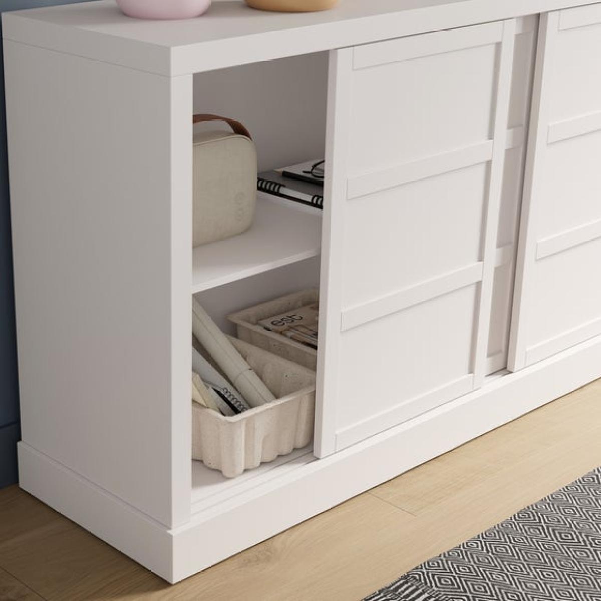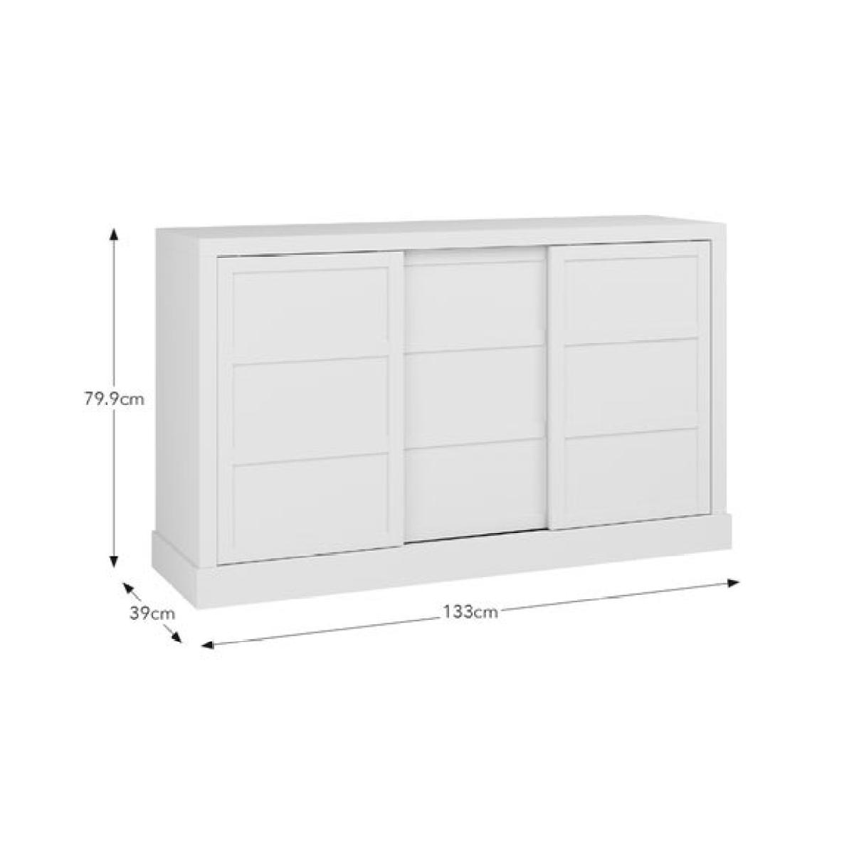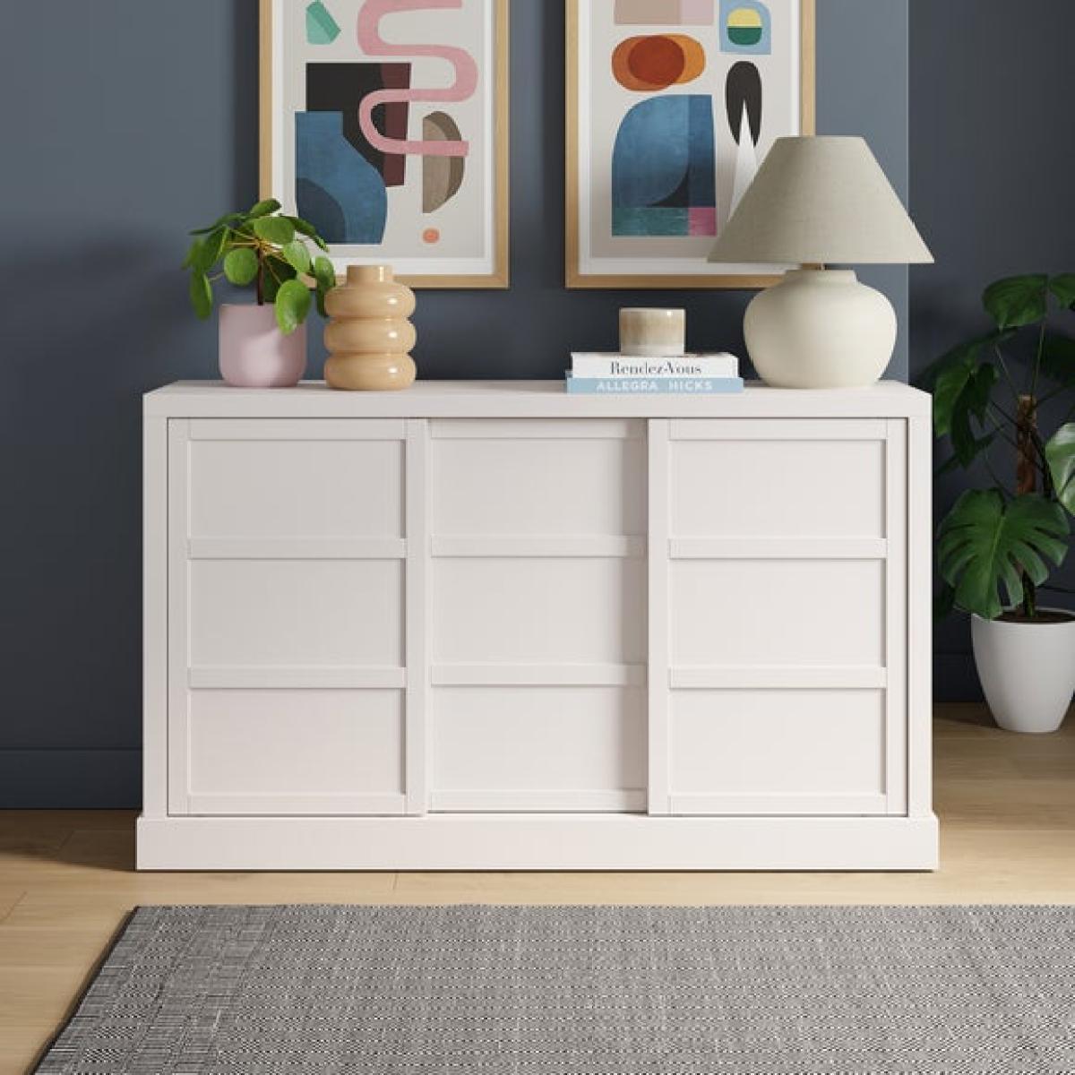 * Sleek, modern sideboard * Adjustable shelves * Cable management The wider take on the Jaxon sideboard offers ample storage space behind smooth sliding doors, with adjustable shelving to suit your needs. Available in misty white, soft olive green or mulberry, it pairs understated design with functional flexibility for modern homes.
