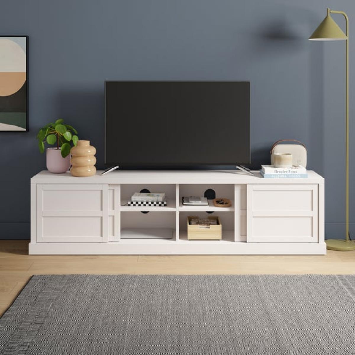 * Sleek, modern TV unit * Adjustable shelves * Cable management Designed to keep your entertainment area tidy, the Jaxon wide TV unit includes sliding doors, adjustable shelves, and handy cable management. In your choice of misty white, soft olive green or mulberry, it's a sleek, practical addition to any living room setup.
