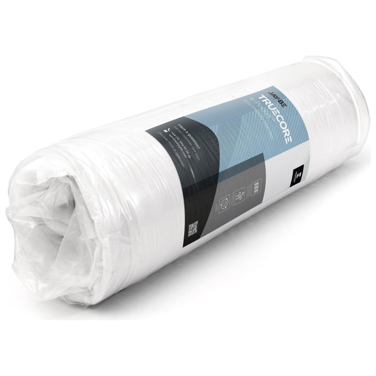 Jay-Be 1000 e-Pocket Eco TRUECORE Mattress. TRUECORE mattresses feature scientifically enhanced comfort layers to offer exceptional comfort and healthier sleep, whilst being kinder to the environment. Breathable e-Fibre comfort layers allow air to flow freely, reducing heat and moisture build up, providing a healthier and fresher sleep environment. Whilst the Deep e-Pocket Core moulds to your body's contours, responding independently and preventing any transfer of movement across the mattress for an undisturbed night's sleep. Providing the perfect foundation for a good night's sleep the TRUECORE technology found in this mattress creates a healthy restful environment so you can wake up feeling refreshed and ready to go. 100% foam free, this mattress features Eco award-winning Advance e-Fibre proven to offer significant environmental benefits when compared to the lifecycle analysis of Cotton including; 90% Less CO2 emissions, 99% Less water and 99% Reduced land use (Results verified by an independent body). Part of the Truecore collection. Medium feel. Pocket sprung mattress with 1000 springs. Knit cover with quilted finish. No roll together. Anti allergy. Mattress size W135, L190, D21cm. No-turn mattress. Rotate mattress regularly. Made in the UK. Rolled mattress. General information: Manufacturer's 5 year guarantee.