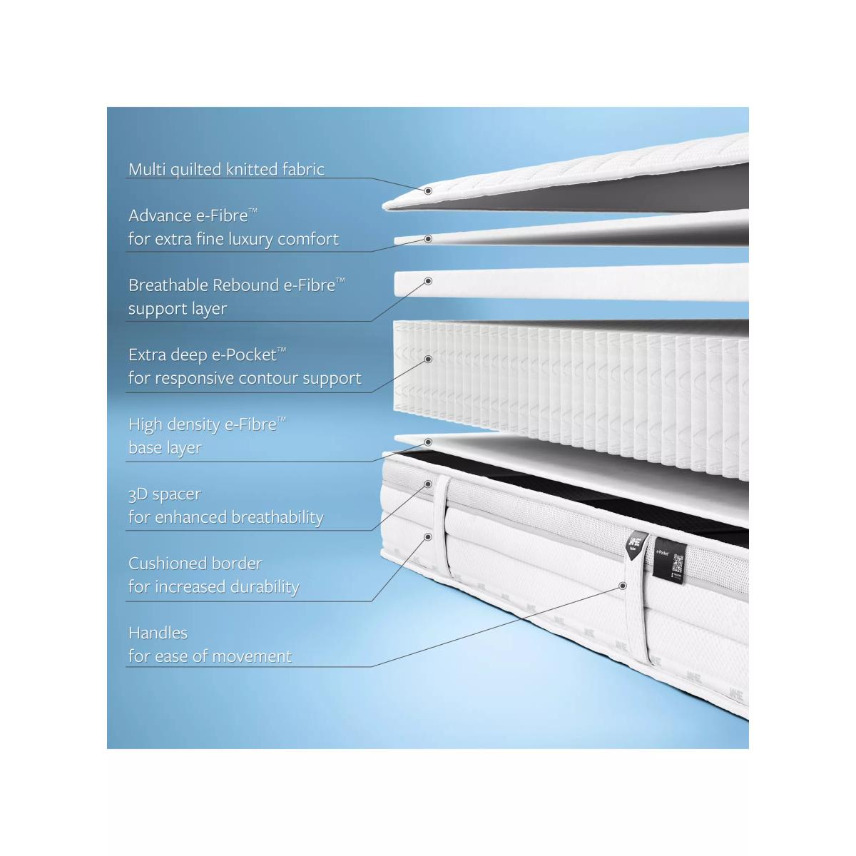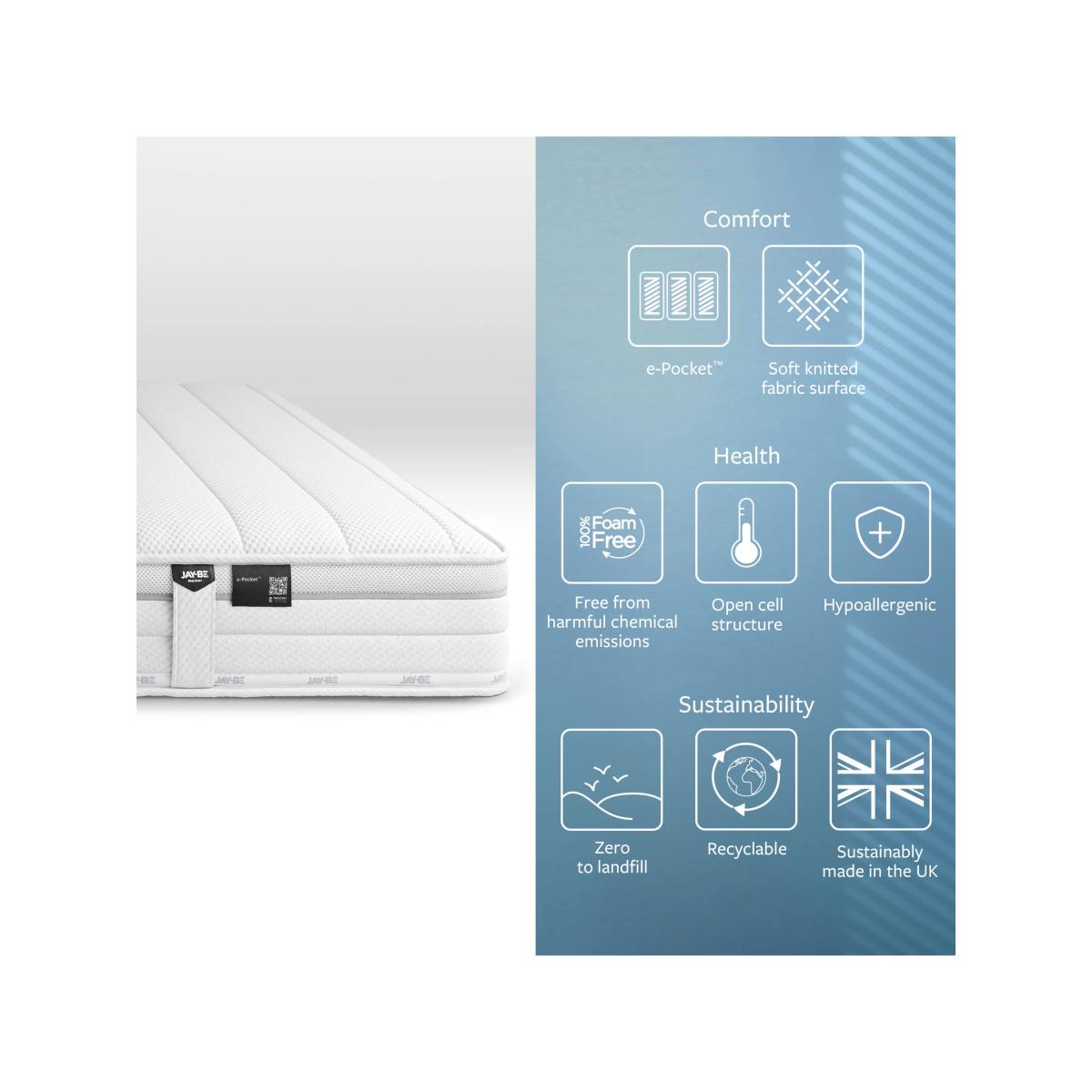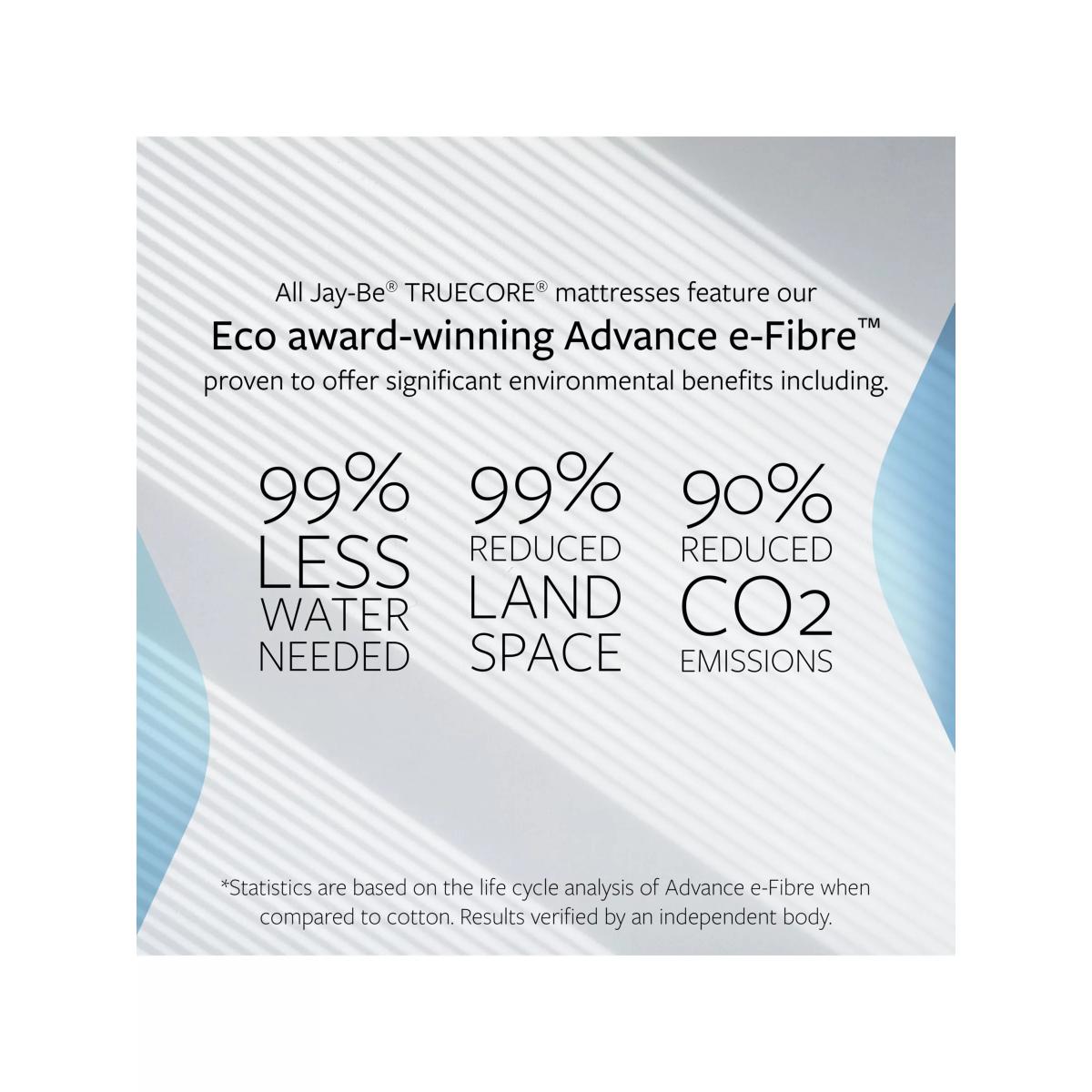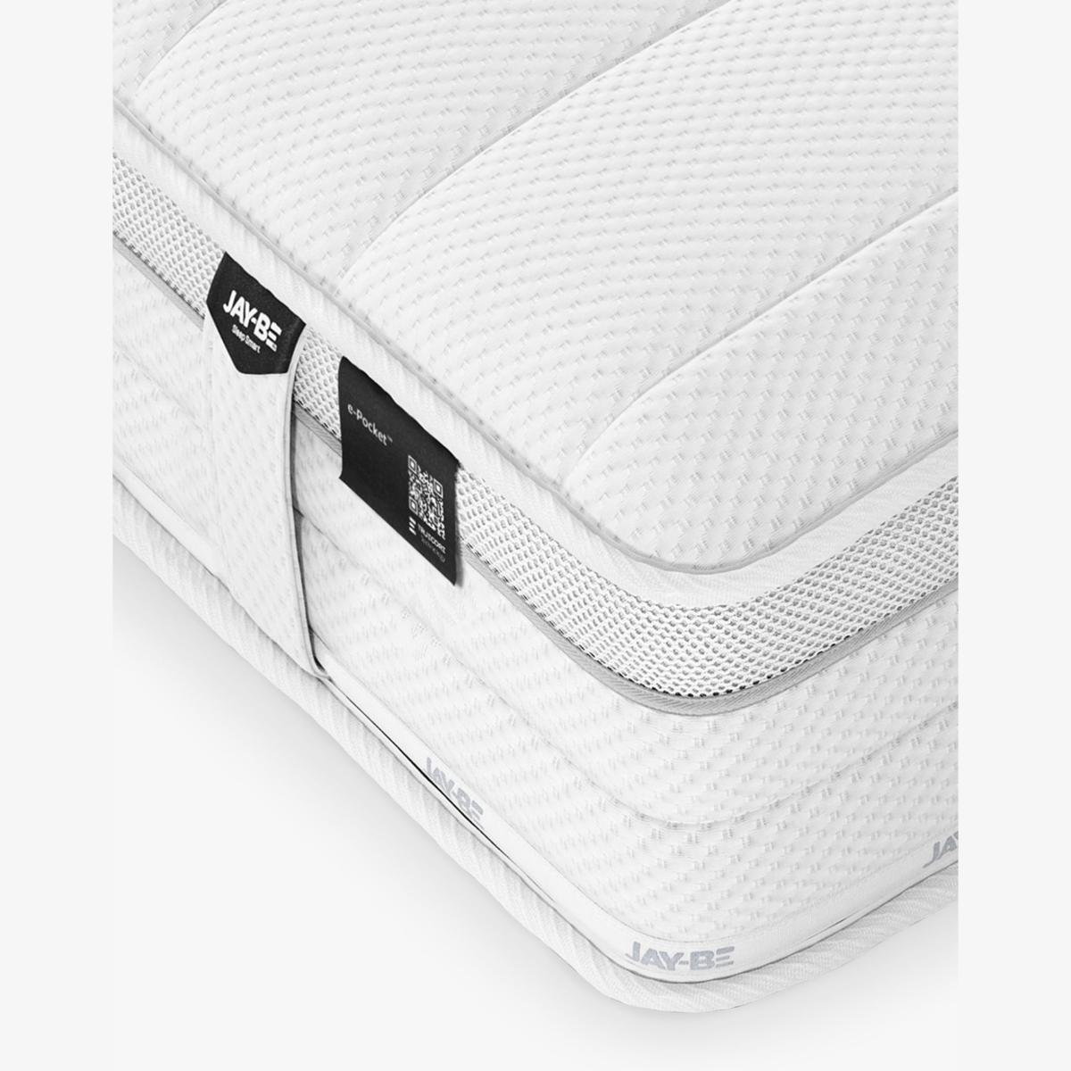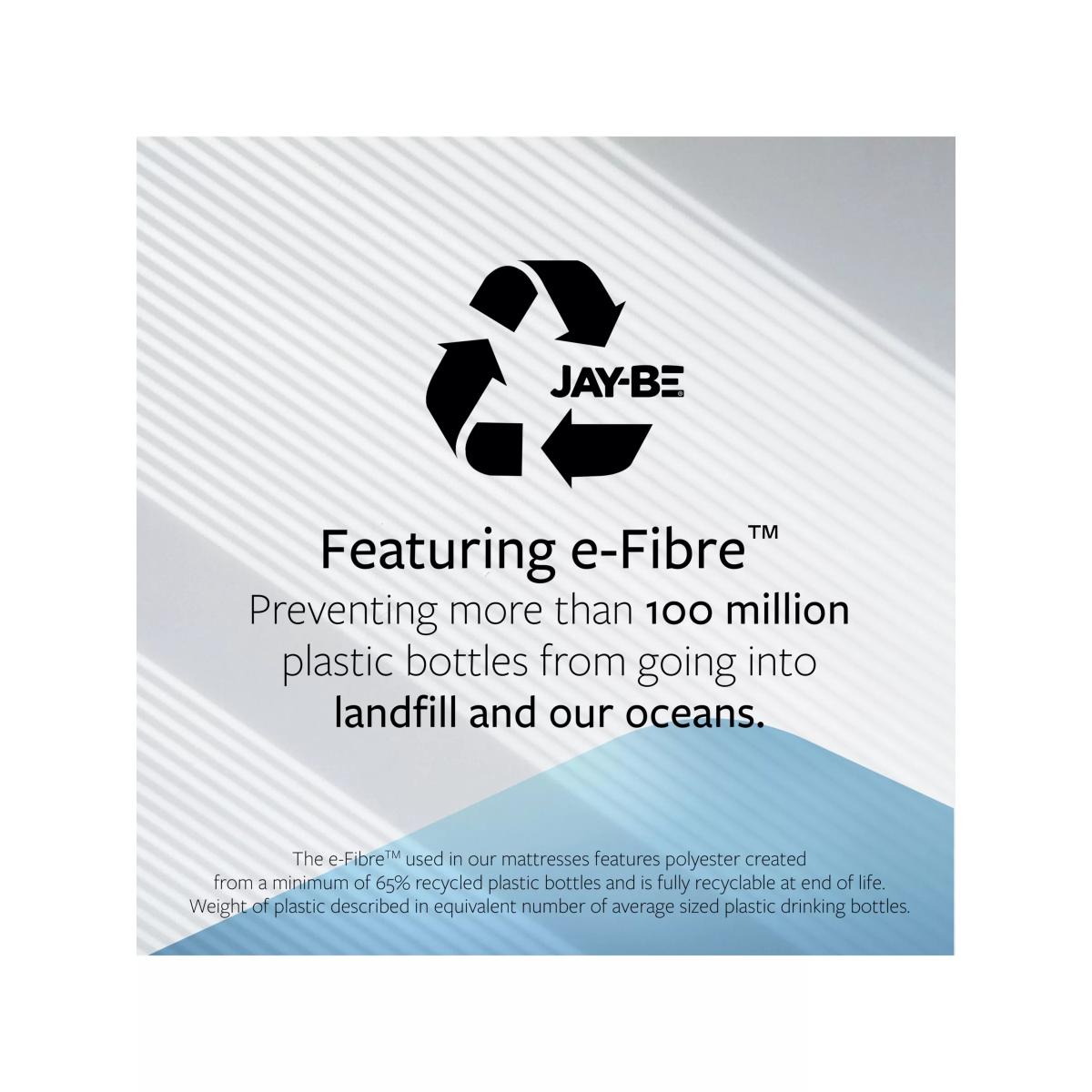 Providing the perfect foundation for a good night’s sleep. The comfort technologies found in this Jay-Be®1000 e-Pocket™ Eco TRUECORE™ mattress create a healthy restful environment so you can wake up feeling fresh and ready for the day. This mattresses is designed with breathable e-Fibre comfort layers which allow air to flow freely, reducing heat and moisture build up, creating a healthier and fresher sleep environment. Whilst the deep e-Pocket cor, moulds to your body's contours and prevents any transfer of movement (roll together) across the mattress for an undisturbed night’s sleep. Made from 100% foam free materials, including Advance e-Fibre™ which has superior moisture wicking abilities. The e-Fibre™ used in Jay-Be mattresses features polyester created from a minimum of 65% recycled plastic bottles and is fully recyclable at end of life. For complete quality assurance all JAY-BE® TRUECORE™ mattresses are backed by a five-year manufacturer’s guarantee. Extend the life of your new mattress with a durable and breathable mattress protector.