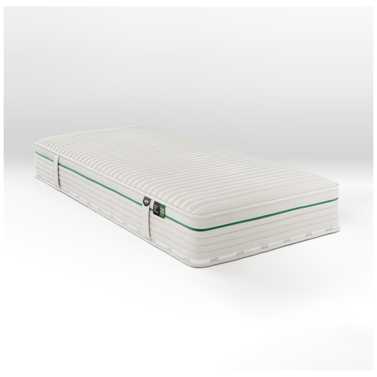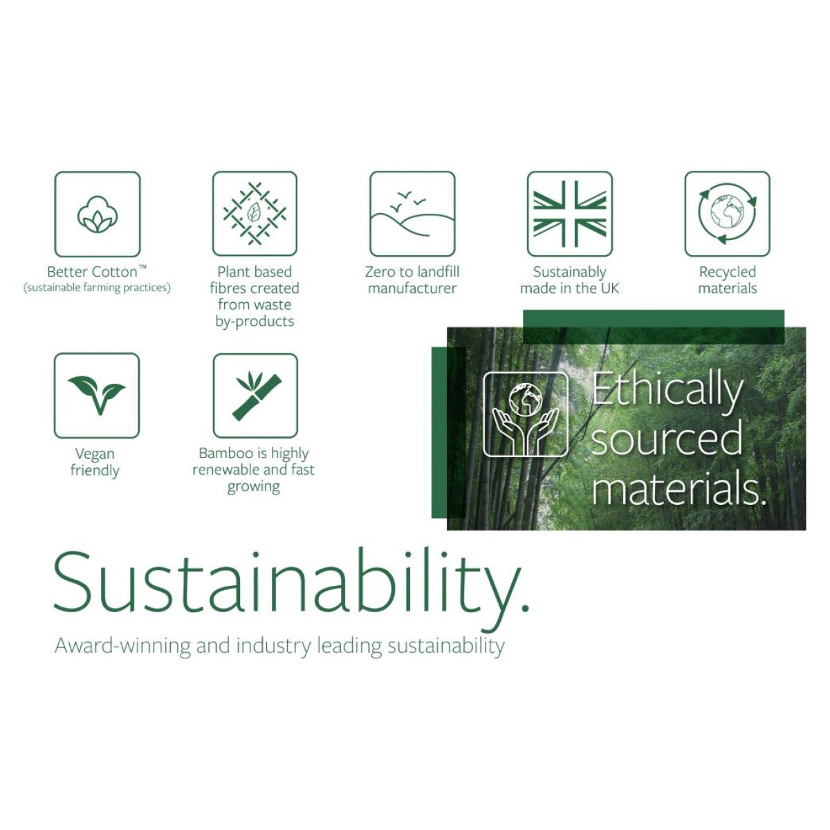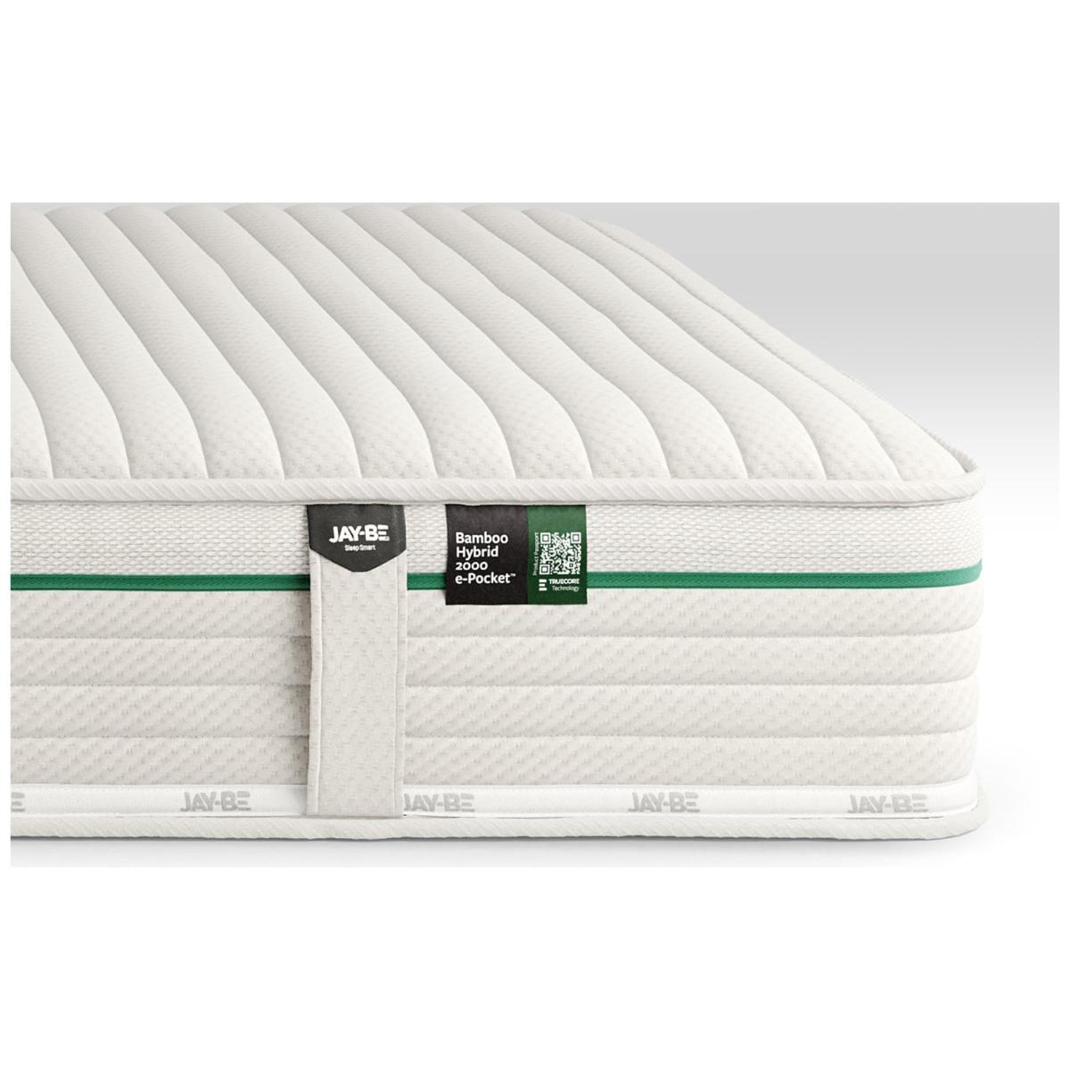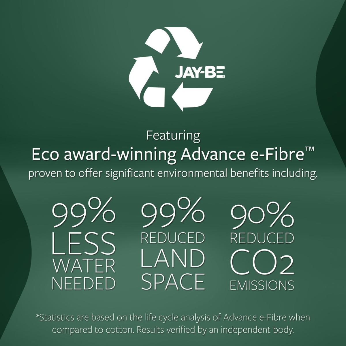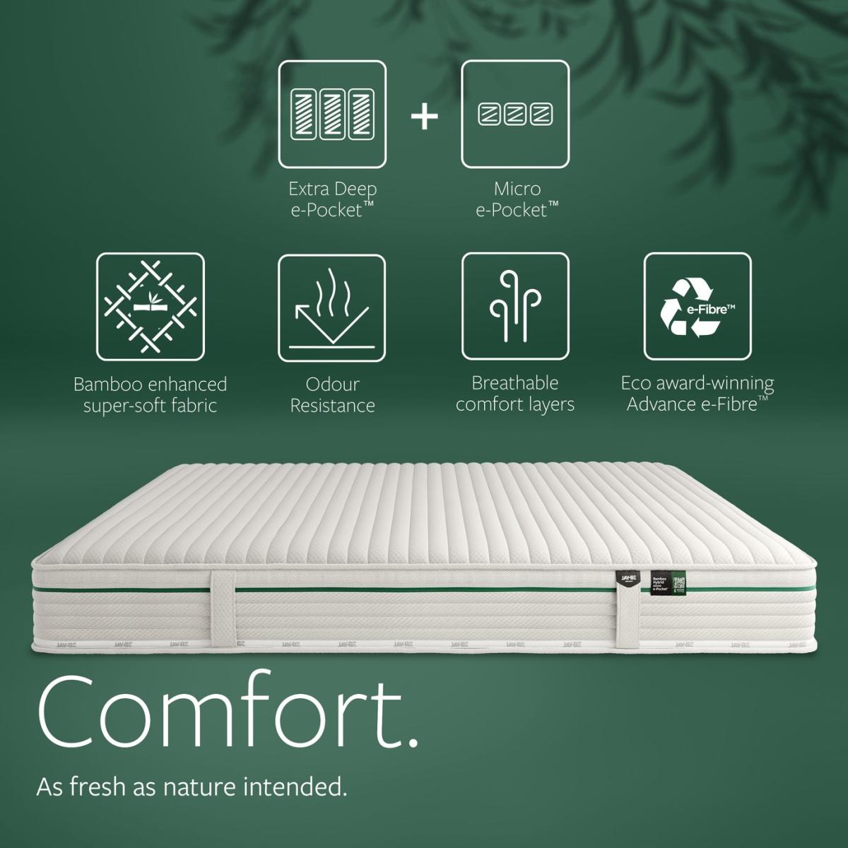 Comfort, Health and Sustainability. Feel fresh all night, naturally. Experience all-night freshness with the Jay-Be Natural Fresh Bamboo mattress. Beneath its Bamboo-enhanced Better Cotton surface, find a super-soft comfort layer of blended plant-based fibres, enriched with Bamboo. Well-known for its softness and recognised as a sustainable alternative to silk or cashmere, Bamboo possesses inherent antimicrobial properties, exceptional breathability, and efficient moisture-wicking abilities for a naturally refreshing and comfortable sleep. It's smooth surface reduces friction and irritation, making it suitable for individuals with allergies, eczema, or other skin sensitivities. Bamboo kun naturally inhibits the growth of odour-causing bacteria, to help keep your mattress fresh. 100% foam free and free from harmful chemicals, this mattress contains award winning Advance e-Fibre and has a foundation of Deep e-Pocket springs, plus the added benefit of micro pocket springs, giving real huggable support. Vegan Friendly. Jay-Be understands the importance of healthy sleep and its impact on overall well-being. They ensure all materials used in their mattresses promote a comfortable and healthy sleep. Additionally, Jay-Be mattresses only use ethically sourced materials and are 100% recyclable at end of life, allowing you to help in our fight against climate change. Part of the Bamboo collection. Medium feel. with 1139 springs. Knit cover with quilted finish. No roll together. Anti allergy. Mattress size W90, L190, D23cm. No-turn mattress. Easy care no turn mattress. Made in the UK. Rolled mattress. General information: Manufacturer's 10 year guarantee.