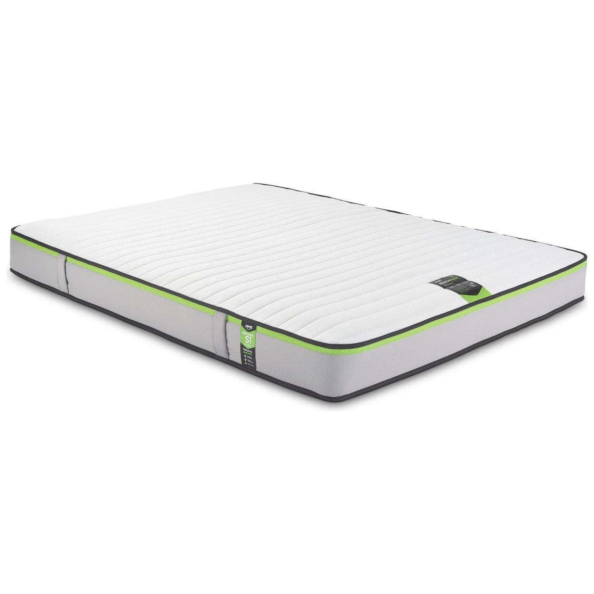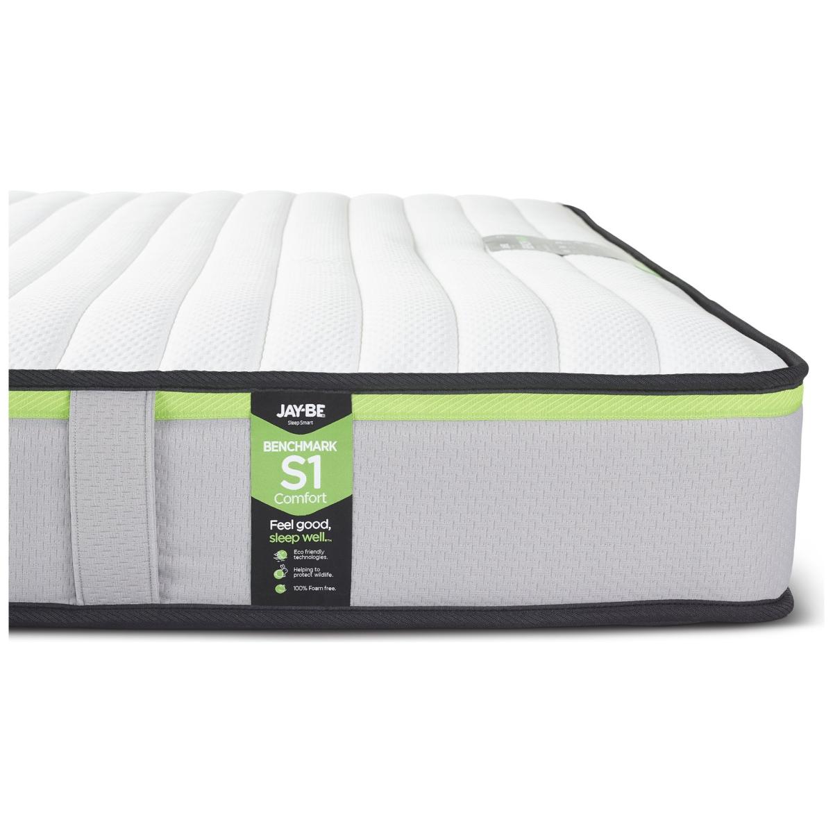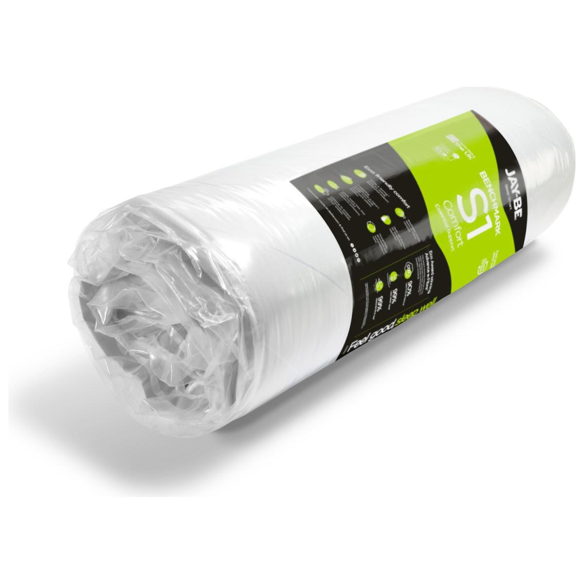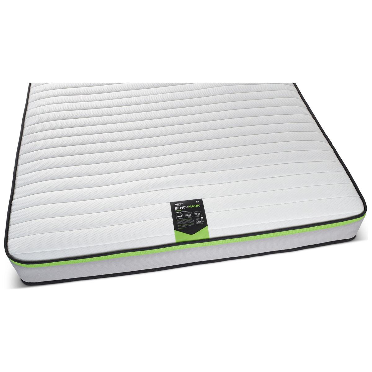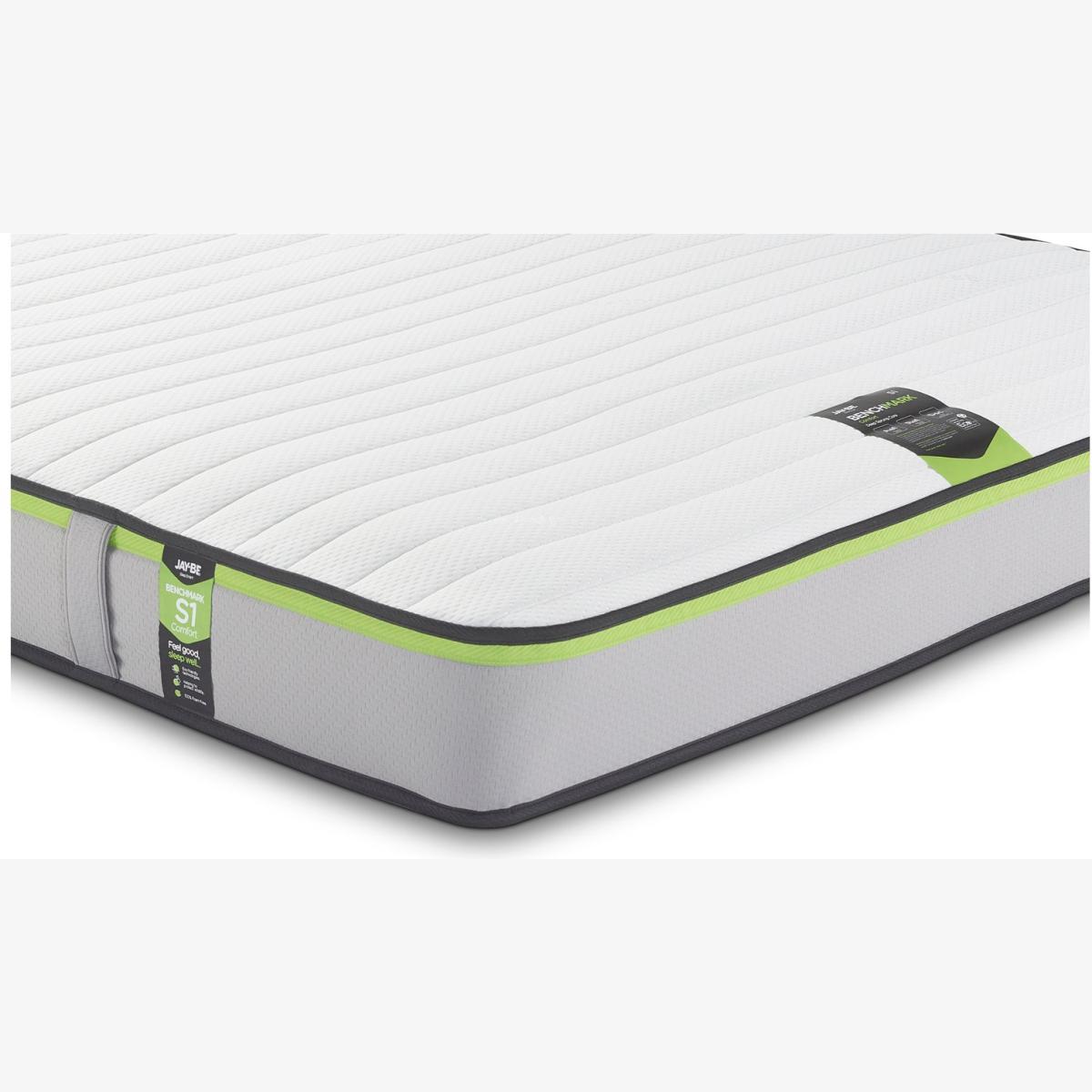 The Jay-Be Benchmark S1 mattress has a deep e-Spring core topped with a supportive comfort layer of Rebound e-Fibre providing contour support and a super soft Advance e-Fibre layer for improved moisture and temperature regulation. Made in the UK and designed with the environment in mind, all Jay-Be mattresses are 100 percent foam free and feature award-winning sustainable sleep technology; reducing land use, water consumption and CO2 emissions to help protect the future of our planet. Eco friendly e-Fibre comfort layers. 100 percent foam free, free from harmful chemical emissions. Breathable comfort layers to reduce moisture. Part of the Benchmark Comfort Essential collection. Firm feel. Open coil mattress with 320 springs. Knit cover with quilted finish. No roll together. Anti allergy. Mattress size W150, L200, D19cm. No-turn mattress. Rotate mattress regularly. Made in the UK. General information: Manufacturer's 5 year guarantee.