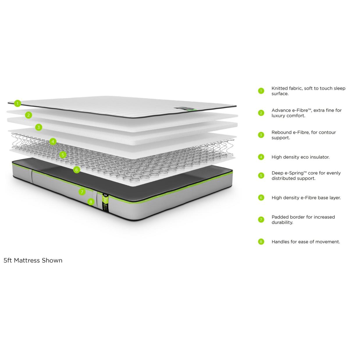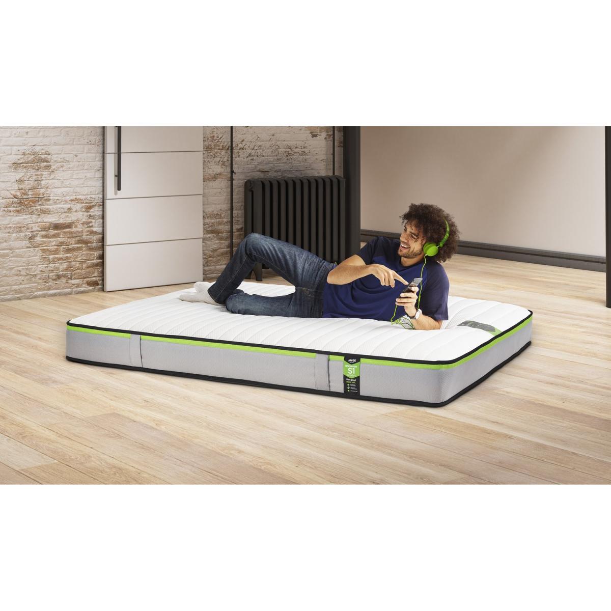 The Jay-Be Benchmark S1 mattress has a deep e-Spring core topped with a supportive comfort layer of Rebound e-Fibre providing contour support and a super soft Advance e-Fibre layer for improved moisture and temperature regulation. Made in the UK and designed with the environment in mind, all Jay-Be mattresses are 100 percent foam free and feature award-winning sustainable sleep technology; reducing land use, water consumption and CO2 emissions to help protect the future of our planet. Eco friendly e-Fibre comfort layers. 100 percent foam free, free from harmful chemical emissions. Breathable comfort layers to reduce moisture. Part of the Benchmark Comfort Essential collection. Firm feel. Open coil mattress with 256 springs. Knit cover with quilted finish. No roll together. Anti allergy. Mattress size W120, L190, D19cm. No-turn mattress. Rotate mattress regularly. Made in the UK. General information: Manufacturer's 5 year guarantee.