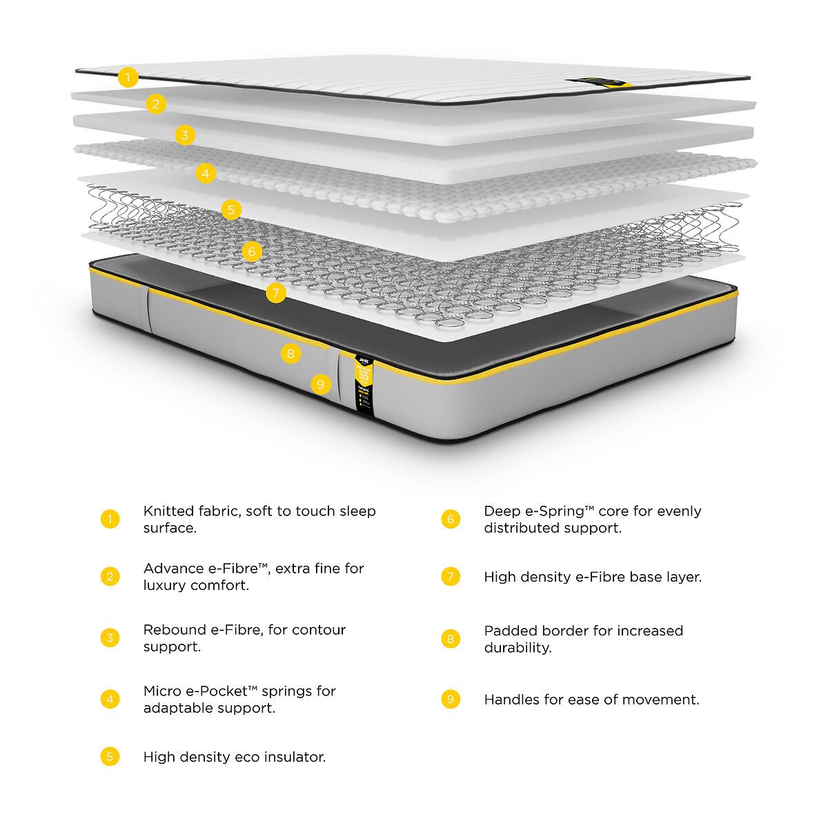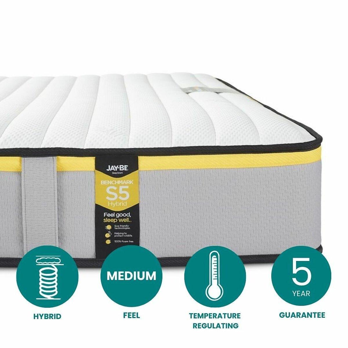 The Jay-Be® Benchmark S5 mattress features innovative sustainable sleep technologies. Its deep e-Spring core is topped with Micro e-Pocket springs for adaptable posture support throughout the night. These springs are cushioned with a deep supportive layer of Rebound e-Fibre and super soft Advance e-Fibre. Made in the UK and designed with the environment in mind, this mattresses Micro e-Pocket Springs, are one of the most advanced pocket spring technologies available today; sonic welded fabric pockets remove the need for glue, making them easier to recycle at end of life. All Benchmark mattresses are 100% foam free and feature Eco award winning Advance e-Fibre™. This super soft Advance e-Fibre not only helps improve moisture and temperature regulation, but is also proven to offer significant environmental benefits. The e-Fibre comfort layers used in these mattresses are made from 100% recyclable plastic bottles, diverting over 70 million from going into landfill or our oceans and by choosing this mattress you are helping to prevent even more!Product details • Open Coil Spring Mattress • Medium• Foam Free• Suitable for all sleepers• Advance e-Fibre ™ comfort layers made of recycled plastic and proven to offer significant enviromental benefits* including 90% less CO2 emissions, 99% less water used, and 99% reduced land use• Quilted sleep surface• Vacuum packed and rolled to maintain freshness and reduce carbon emissions during transportation.• Zero to Landfill• Made in the UK • 5 year manufacturers guarantee*statistics are based on the life cycle analysis of Advance e-Fibre when compared to cotton. Results verified by an independent body. Care information: Mattress can be slept on immediately after opening, but ideally, leave 3-4 hours to fully recover after opening. Rotate regularly. Product dimensions. Single 190 cm x90 cm x22 cm , Weight - 18.2 KGSmall Double 190 cm x120 cm x22 cm , Weight - 23.2 KGDouble 190 cm x135 cm x22 cm , Weight - 26.5 KGKing 200 cm x150 cm x22 cm , Weight - 28.2 KGPackaged Dimensions Single: 100 cm x 32 cm x 32 cm, Weight 20 kg. Small Double: 129 cm x 32 cm x 32 cm, Weight 25 kg. Double: 144 cm x 32 cm x 32 cm, Weight 29 kg. King: 160 cm x 32 cm x 32 cm, Weight 31 kg. This product will be dispatched by one of our trusted suppliers. You’ll be contacted by their selected courier about your delivery. Please note: this product cannot be delivered to all Offshore Islands, Northern Ireland or Republic of Ireland. JAYBE01