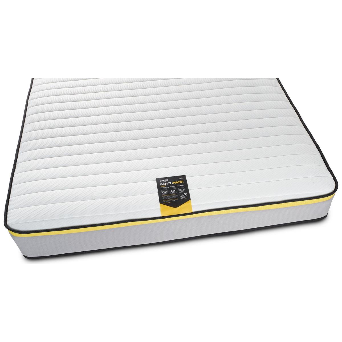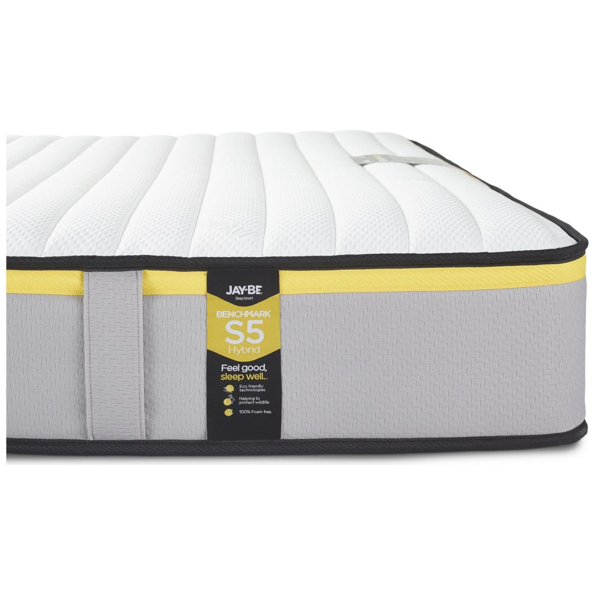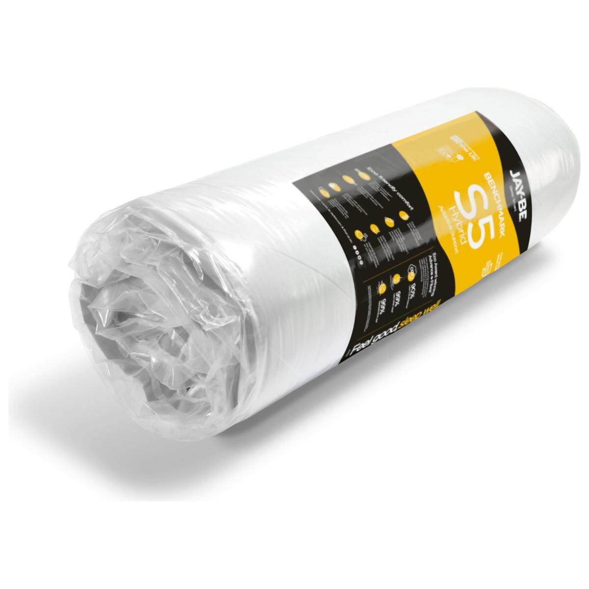 The Jay-Be Benchmark S5 features a deep e-Spring core topped with super fine Micro e-Pocket springs to adapt to your body's gentlest movement for a truly individual supported feel. The S5 also features a supportive comfort layer of Rebound e-Fibre providing contour support and a super soft Advance e-Fibre layer for improved moisture and temperature regulation. Eco friendly e-Fibre comfort layers. 100 percent foam free, free from harmful chemical emissions. Breathable comfort layers to reduce moisture. Part of the Benchmark Hybrid Adaptive collection. Medium feel. Open coil mattress with 985 springs. Knit cover with quilted finish. No roll together. Anti allergy. Mattress size W135, L190, D22cm. No-turn mattress. Rotate mattress regularly. Made in the UK. General information: Manufacturer's 5 year guarantee.