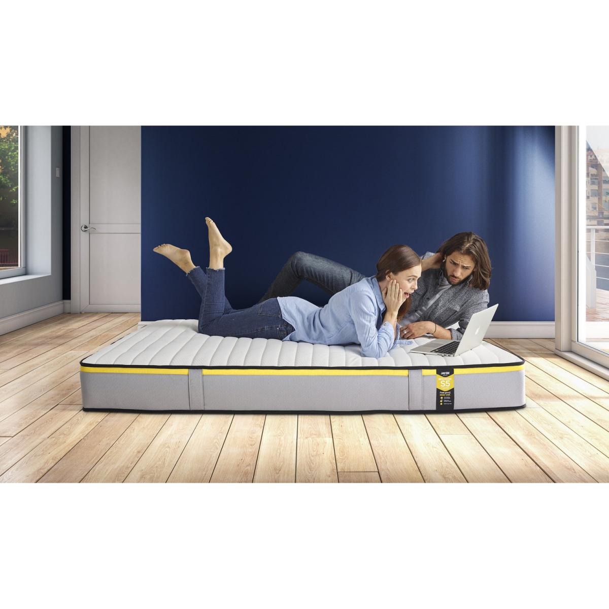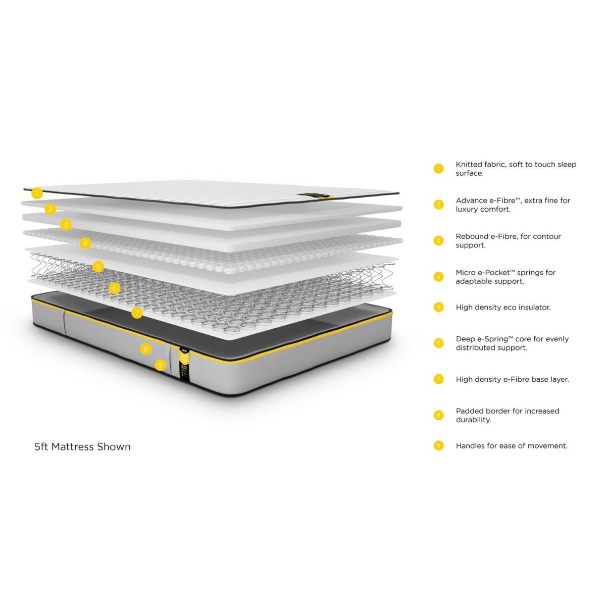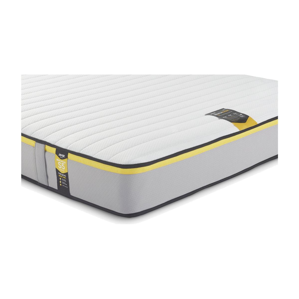 The Jay-Be Benchmark S5 features a deep e-Spring core topped with super fine Micro e-Pocket springs to adapt to your body's gentlest movement for a truly individual supported feel. The S5 also features a supportive comfort layer of Rebound e-Fibre providing contour support and a super soft Advance e-Fibre layer for improved moisture and temperature regulation. Eco friendly e-Fibre comfort layers. 100 percent foam free, free from harmful chemical emissions. Breathable comfort layers to reduce moisture. Part of the Benchmark Hybrid Adaptive collection. Medium feel. Open coil mattress with 985 springs. Knit cover with quilted finish. No roll together. Anti allergy. Mattress size W135, L190, D22cm. No-turn mattress. Rotate mattress regularly. Made in the UK. General information: Manufacturer's 5 year guarantee.