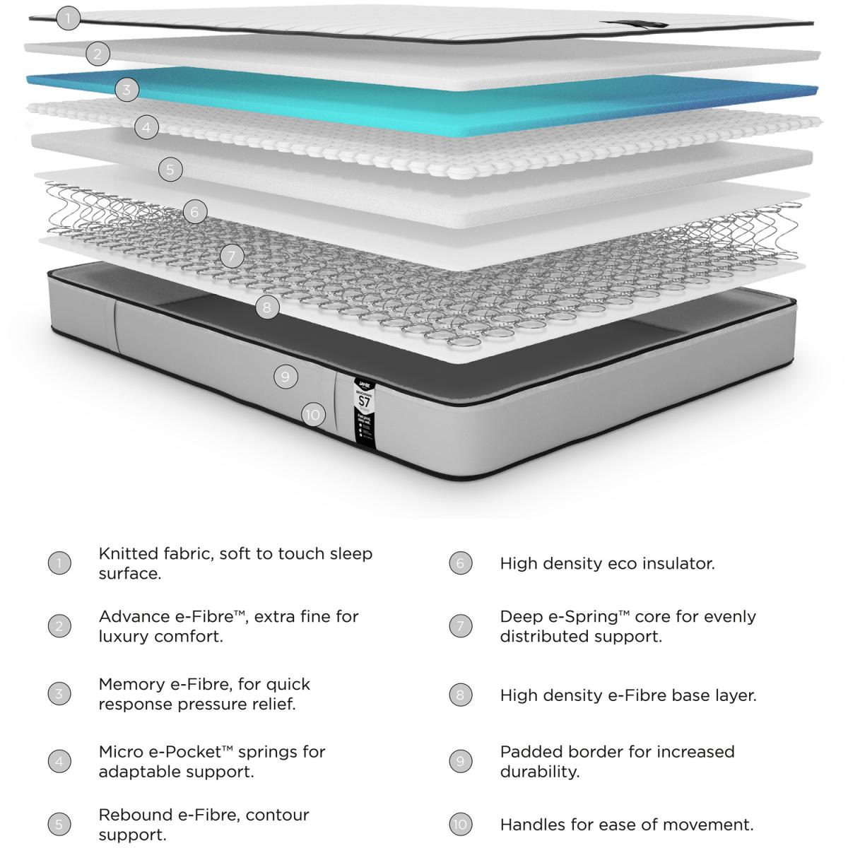 For the ultimate nights sleep, the Jay-Be Benchmark S7 mattress features a deep e-Spring core topped with Micro e-Pocket springs, revolutionary Memory e-Fibre and extra fine Advance e-Fibre. The combination of these premium comfort layers work together to deliver the ultimate in pressure relieving adaptive support.
