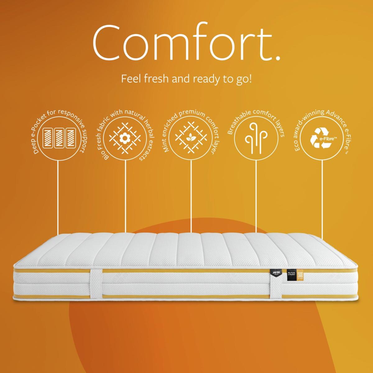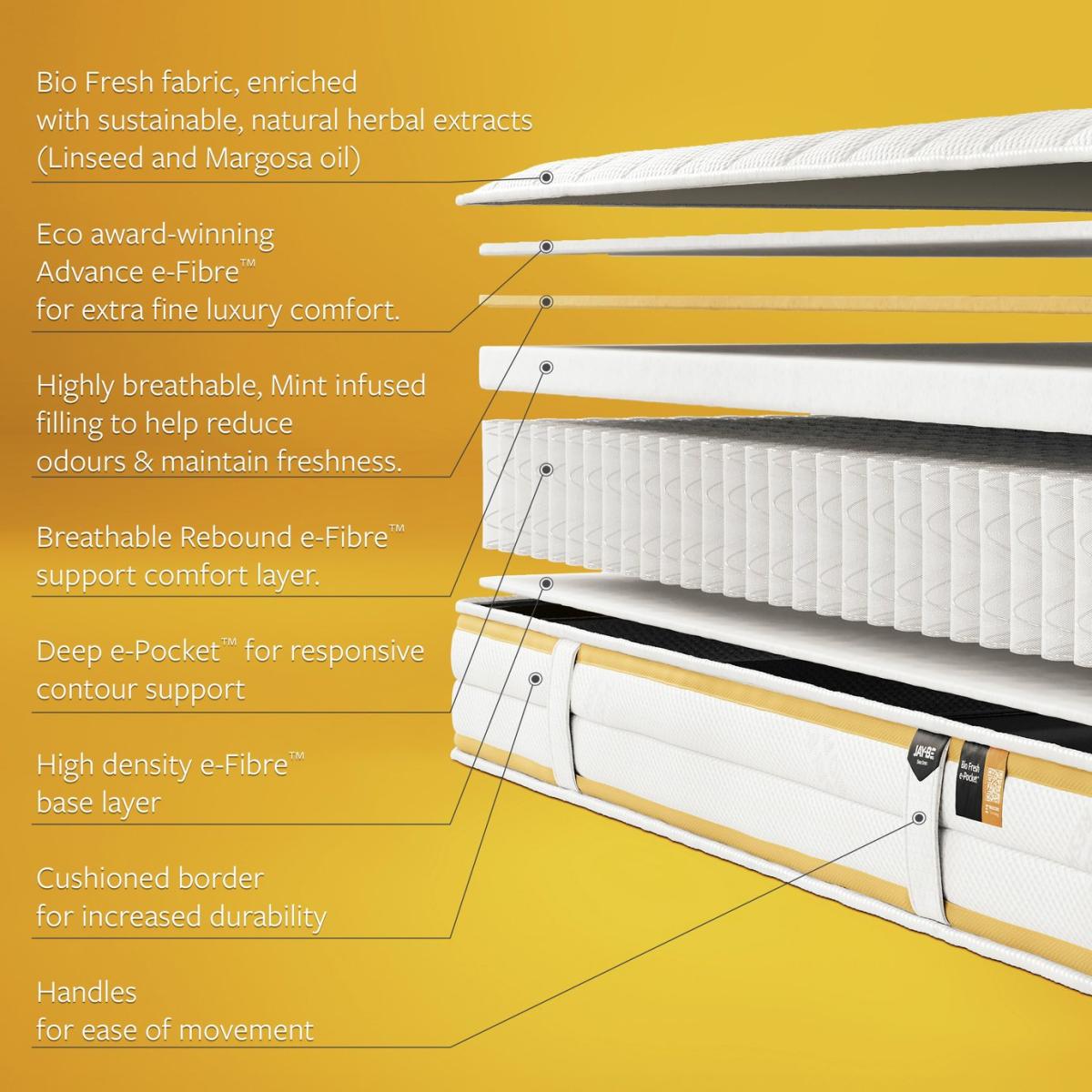 Who knew plants packed so much power? Plants are truly remarkable, and the Jay-Be Bio Fresh e-Pocket Eco-Friendly Children's Mattress harnesses their amazing qualities to offer your child the most revitalising night's sleep. Understanding the significant role sleep plays on a child's overall well-being and development, Jay-Be has packed this mattress full of cutting-edge material technologies to provide your child with the comfort they need for a healthy night, so they wake up feeling refreshed and rejuvenated for an active day ahead! The Jay-Be Bio Fresh Pocket Sprung children's mattress harnesses the power of plants with advanced, sustainable fibre technologies for a totally revitalising sleep. Featuring smart plant-based fibres and natural herbal extracts, the mattress naturally fights odours and repels dust mites, so you stay fresh and comfy all night. Mint is well known for its ability to deliver freshness. Extracted from natural peppermint leaf, the mint enriched fibres provide a natural moisturising feeling and are extremely breathable, helping to keep your mattress well-ventilated and fresh. Medium feel. Pocket sprung mattress with 595 springs. Knit cover with micro quilt finish. No roll together. Fire retardant. Rotate mattress regularly. Mattress size W90, L190, D18cm. Rolled mattress. Package Dimensions: Package 1 dimensions: H100, W32, D32cm. Package 1 weight: 13.8kg. General information: Manufacturer's 10 year guarantee.
