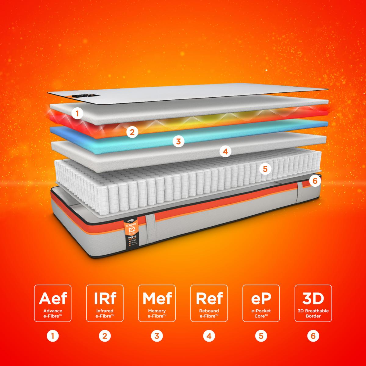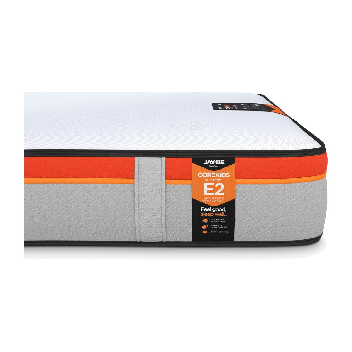 The Jay-Be COREKIDS E2 mattress offers the extra pressure relieving benefits of Memory e-Fibre which rests on top of a deep e-Pocket 750* sprung core. Memory e-Fibre is arguably one of the most advanced fibre technologies to be used in a mattress and is a more environmentally friendly alternative to memory foam. It offers excellent pressure relief and features fibres made from 100 recyclable plastic bottles. Its quick responsiveness means it adapts instantly as you move for uninterrupted support throughout the night. How Infrared e-Fibre works - IR is natural energy that your body radiates.