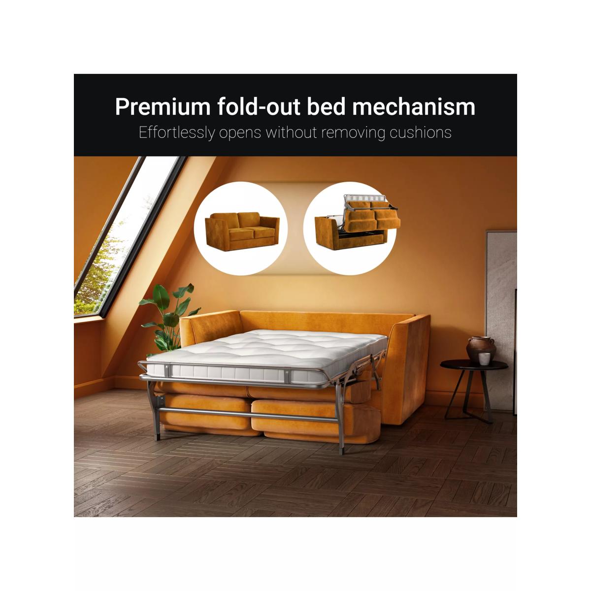 Product Information Introducing Jay-Be premium-quality sofa beds, thoughtfully designed and engineered to deliver ultimate performances. The mattresses are 100% recyclable, so you can choose from a range of carefully selected GreenF. R� fabric options, to marry style with unparalleled comfort all night. The Elegance sofa bed epitomises contemporary sophistication with versatile functionality. Its high-angled arms exude modern elegance, while thoughtfully chosen fabric options enable a personalised style. Concealing a premium fold-out mechanism, the Elegance seamlessly transitions from a modern sofa to a luxurious bed, ensuring a truly opulent night�s sleep. In a matter of seconds, effortlessly transform your living space into a beautiful bedroom while keeping the seat and back cushions in place for complete convenience. Handcrafted in the UK, this sofa embodies aharmonious blend of luxury and sumptuous comfort. Every material chosen for the creation of this exceptional sofa bed has been thoughtfully selected to ensure long-term durability, as well as an unparalleled level of comfort. The premium fabrics and sumptuous fibre-wrapped seat cushions create a lavish sofa, while the luxurious wool, breathable comfort layers, and the deep e-Spring core within the mattress make for a superior bed, allowing you to embrace comfort in every moment. Try before you buyWe're confident in our furniture's quality, but it's always a good idea to check that it's a good personal fit for you. Measuring Up for Furniture Guide Sofas, Sofa Beds & Chairs Buying Guide Upholstery Care Guide
