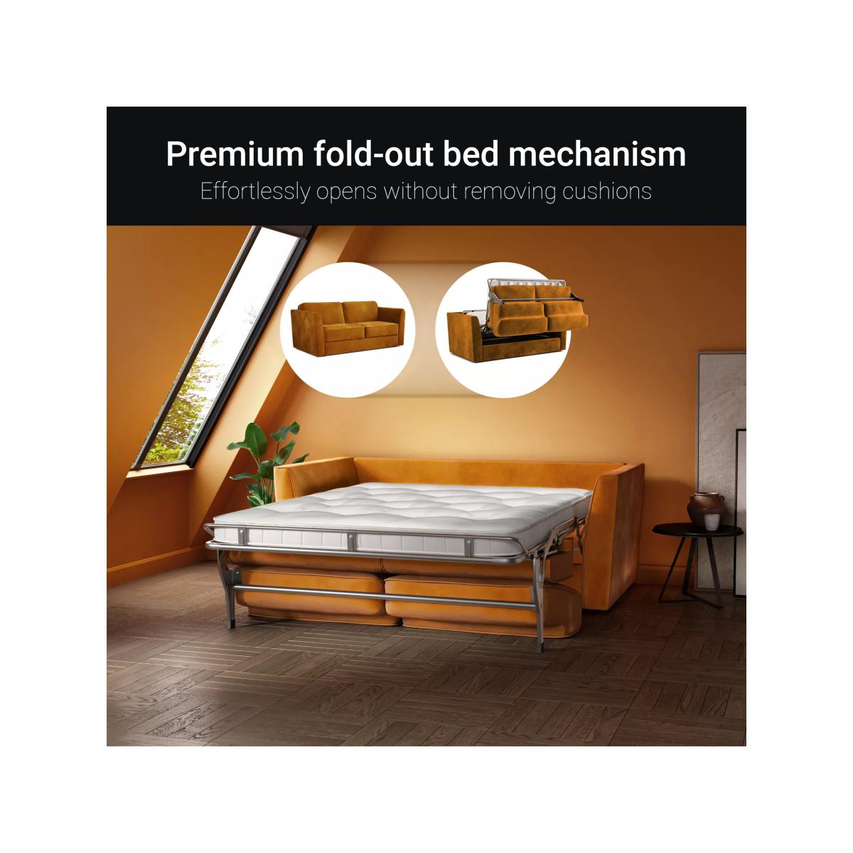 Product Information Introducing Jay-Be premium-quality sofa beds, thoughtfully designed and engineered to deliver ultimate performances. The mattresses are 100% recyclable, so you can choose from a range of carefully selected GreenF. R� fabric options, to marry style with unparalleled comfort all night. The Elegance sofa bed epitomises contemporary sophistication with versatile functionality. Its high-angled arms exude modern elegance, while thoughtfully chosen fabric options enable a personalised style. Concealing a premium fold-out mechanism, the Elegance seamlessly transitions from a modern sofa to a luxurious bed, ensuring a truly opulent night�s sleep. In a matter of seconds, effortlessly transform your living space into a beautiful bedroom while keeping the seat and back cushions in place for complete convenience. Handcrafted in the UK, this sofa embodies aharmonious blend of luxury and sumptuous comfort. Every material chosen for the creation of this exceptional sofa bed has been thoughtfully selected to ensure long-term durability, as well as an unparalleled level of comfort. The premium fabrics and sumptuous fibre-wrapped seat cushions create a lavish sofa, while the luxurious wool, breathable comfort layers, and the deep e-Spring core within the mattress make for a superior bed, allowing you to embrace comfort in every moment. Try before you buyWe're confident in our furniture's quality, but it's always a good idea to check that it's a good personal fit for you. Measuring Up for Furniture Guide Sofas, Sofa Beds & Chairs Buying Guide Upholstery Care Guide
