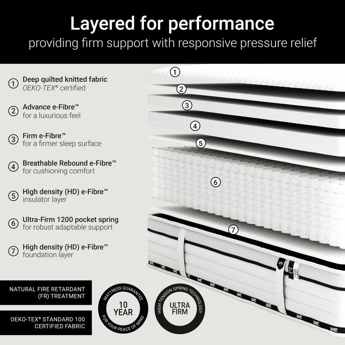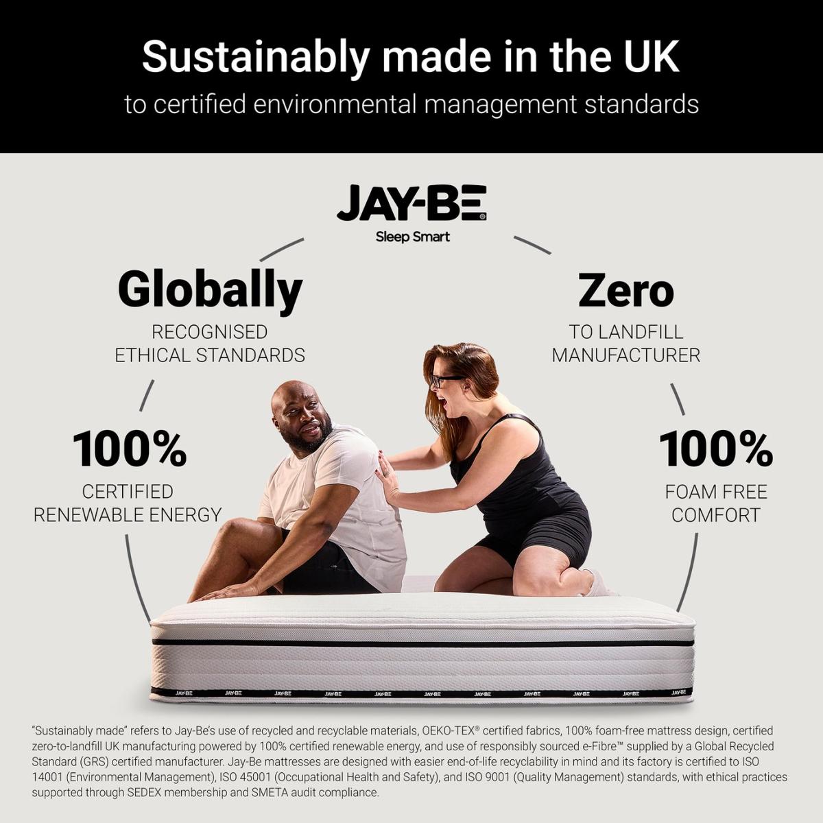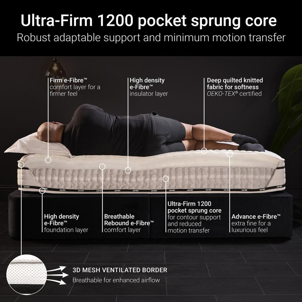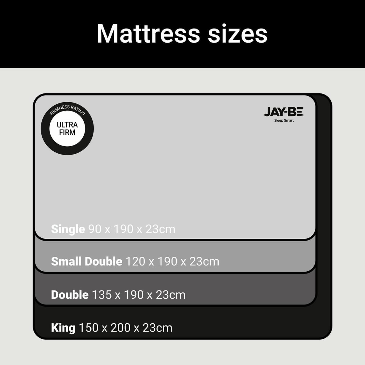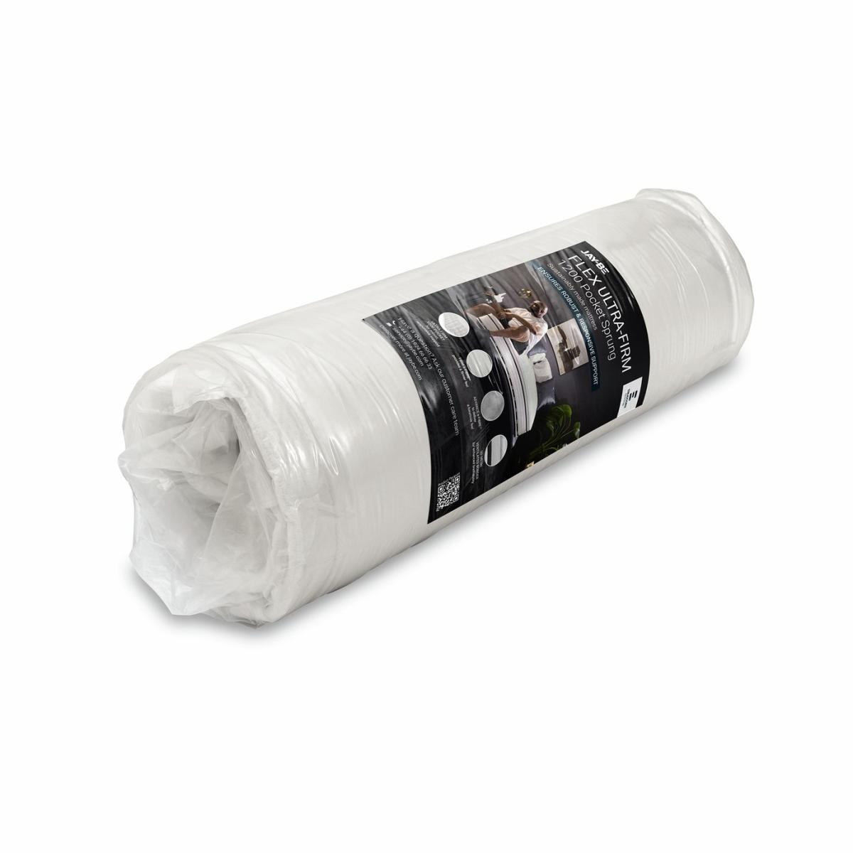 If you're looking for a firmer feel when you sleep, the Jay-Be Flex Pocket Sprung Ultra-Firm is engineered to deliver exactly that. Inspired by orthopaedic principles, it provides enhanced support to help promote stable posture alignment and consistent comfort throughout the night. With 1200 individual pocket springs, each working independently, the mattress offers ultra-firm, personalised support that adapts to your body shape while reducing motion transfer between sleeping partners. Finished in a soft knitted fabric, it is quilted with breathable Advance e-Fibre and features a 3D Mesh border to encourage airflow, for a fresh and comfortable sleep experience. Made by Jay-Be in the UK, the Flex mattress is made with a commitment to ethical and environmentally responsible practices. Manufactured using 100% certified renewable energy and zero-to-landfill processes, every component has been carefully selected for comfort, performance and end of life recyclability. For added convenience, the Flex is vacuum-packed and rolled to minimise packaging size and comes with a ten-year manufacturer's guarantee for your extra peace of mind. Part of the Flex collection. Firm feel. Pocket sprung mattress with 1200 springs. Knit cover with micro quilt finish. No roll together. Mattress size W135, L190, D23cm. Mattress Weight 26.5kg. No-turn mattress. Rotate mattress regularly. Made in the UK. Rolled mattress. Package Dimensions: Package 1 dimensions: H144, W32, D32cm. Package 1 weight: 28.7kg. General information: Manufacturer's 10 year guarantee.