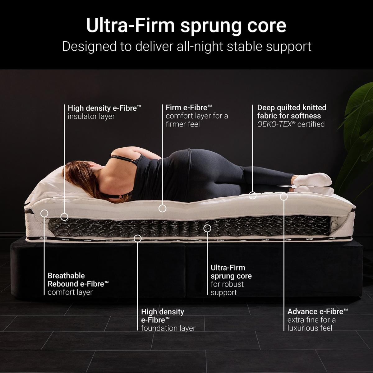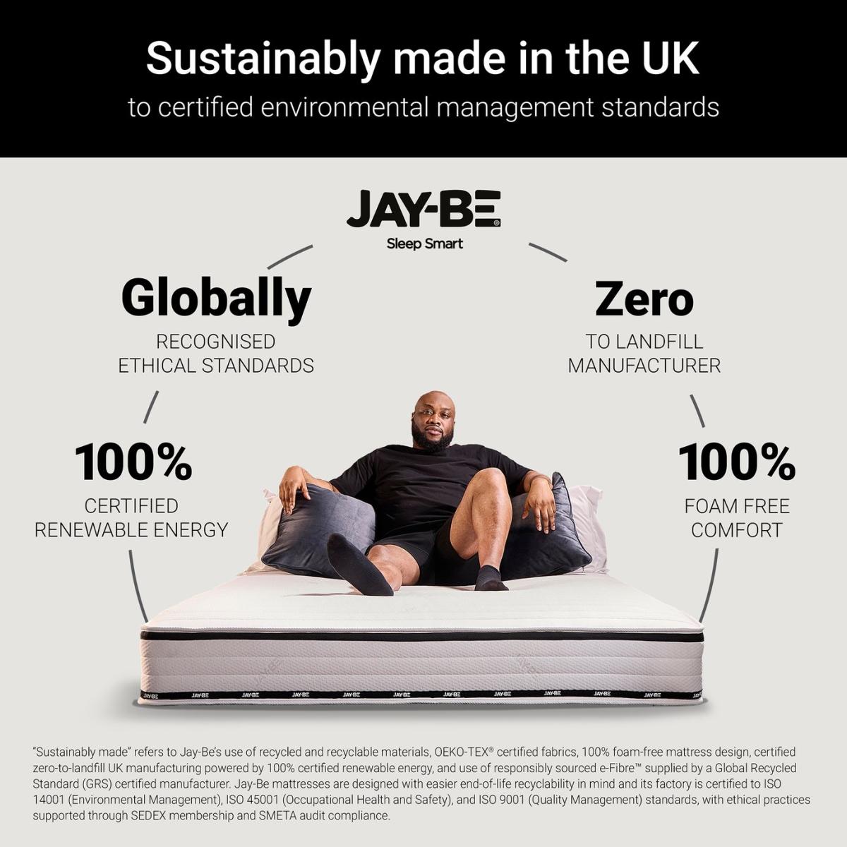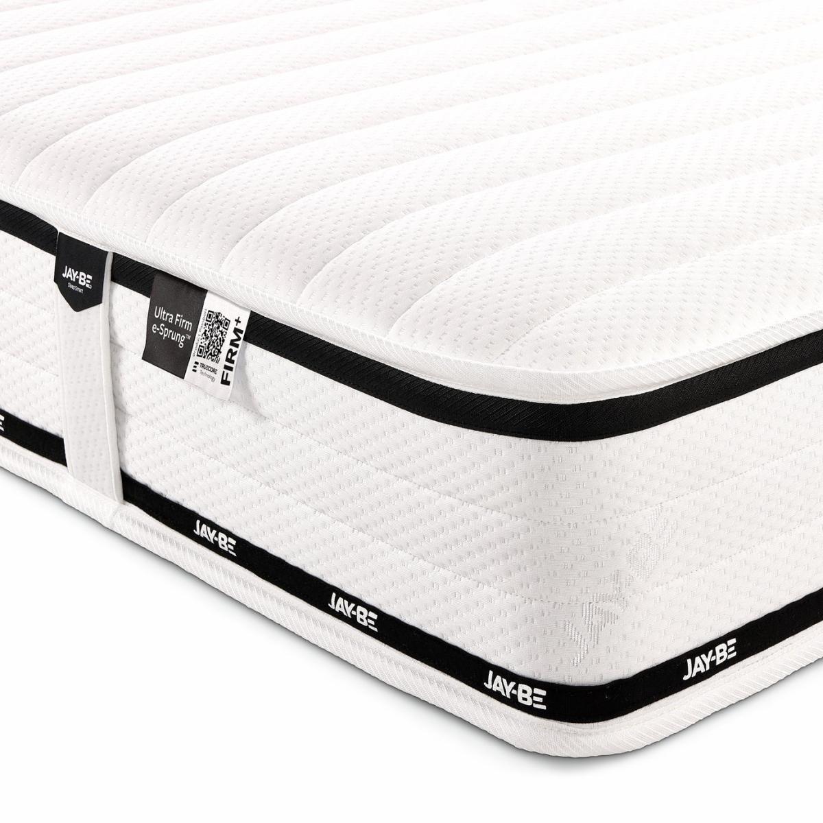 The firm choice for firm support If you're looking for a firmer mattress, the Jay-Be Flex Ultra-Firm is specially engineered with orthopaedic principles in mind. Its high-tension spring core promotes stable posture, while a firm e-Fibre layer relieves pressure. Topped with breathable Advance e-Fibre, it enhances airflow and comfort for a fresher night's sleep. Ideal for those needing extra support without compromising on comfort. Every feature of the Flex mattress has been carefully considered with comfort, well-being and sustainability in mind. It is made in Jay-Be's UK factory, which is powered by 100% certified renewable electricity and operates a zero-to-landfill policy. For added convenience, the mattress is vacuum packed and rolled, and comes with a ten-year manufacturer's guarantee, offering long lasting peace of mind. Part of the Flex collection. Firm feel. Open coil mattress with 325 springs. Knit cover with micro quilt finish. Mattress size W150, L200, D21cm. Mattress Weight 24.7kg. Rotate mattress regularly. Made in the UK. Package Dimensions: Package 1 dimensions: H159, W32, D32cm. Package 1 weight: 27.1kg. General information: Manufacturer's 10 year guarantee.