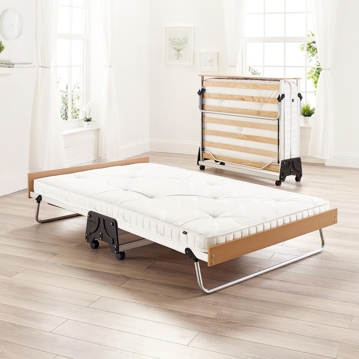Offering a more spacious sleeping area the J-Bed from Jay-Be brings together the most innovative technologies to create one of the most luxurious small double folding guest beds imaginable with an Anti-allergy Micro e-Pocket mattress. Treated with Purotex, a 100 natural probiotic technology which absorbs moisture and reduces the presence of dust-mite allergens, it helps to reduce the potential trigger of allergic reactions which can interrupt sleep. Resting on a sprung slatted base over 600 individual micro e-Pocket springs have the additional benefit of a comfort layer made from our exclusive Jay-Be Rebound e-Fibre. Each spring works independently with the premium fillings to adapt to the contours of your body offering luxurious comfort for a quality nights sleep. Created without compromise, the J-Bed is made using the finest materials. The anodised aluminium frame is lightweight and sits on premium 360 castors which allow the bed to be easily manoeuvred. Precision injection moulded components compliment the J-Beds stylish appearance and our exclusive J-Lok folding mechanism enables effortless opening and closing of the bed, one side at a time. The oak effect headboard secures your pillow with a foot end to help keep the mattress in place.