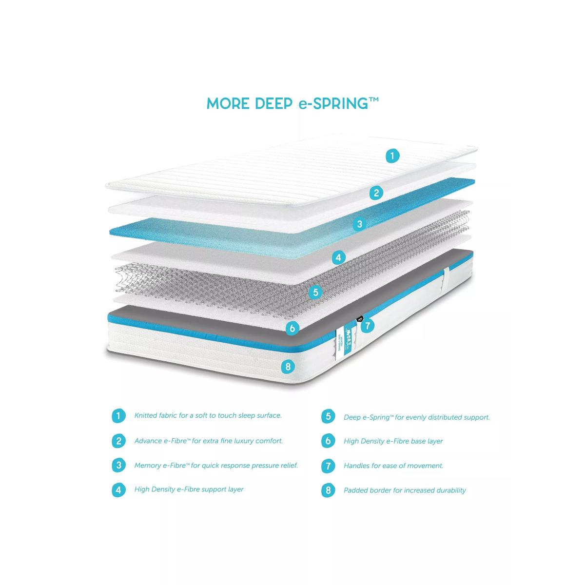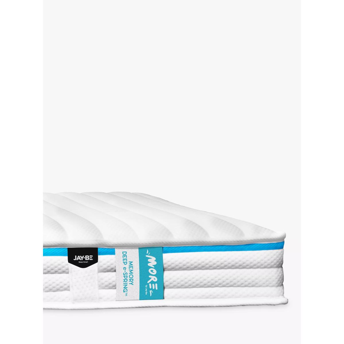 The deep e-Spring™ core found in this mattress offers evenly distributed body support for growing bones and muscles. Topped with a more environmentally friendly alternative to memory foam the memory e-Fibres vertical construction offers excellent pressure relief and a quick response to movement, adapting instantly for uninterrupted support throughout the night. Key Features: Deep e-Spring™ Core for evenly distributed support Comfortable, Memory e-Fibre comfort layer for quick response pressure relief 100% foam free, free from harmful chemical emissions Breathable comfort layers to help regulate moisture Open cell structure for temperature regulation Naturally fire resistant so no nasty chemicals Soft knitted fabric surface which is kind to the skin Hypoallergenic materials reduce the risk of allergic reactions Easy care non-flip mattress Handles for ease of movement Sustainable eco-friendly design, featuring Eco award-winning Advance e-Fibre Vacuum packed and rolled so it is as fresh as the day it was made Helping to protect wildlife Zero to landfill* Manufacturer's 5 year guarantee Made in the UK to British and European safety standards *Zero to landfill - To ensure your Jay-Be mattress never goes into landfill, Jay-Be has designed all their mattresses with end of life in mind. Learn more at Jay-Be.com