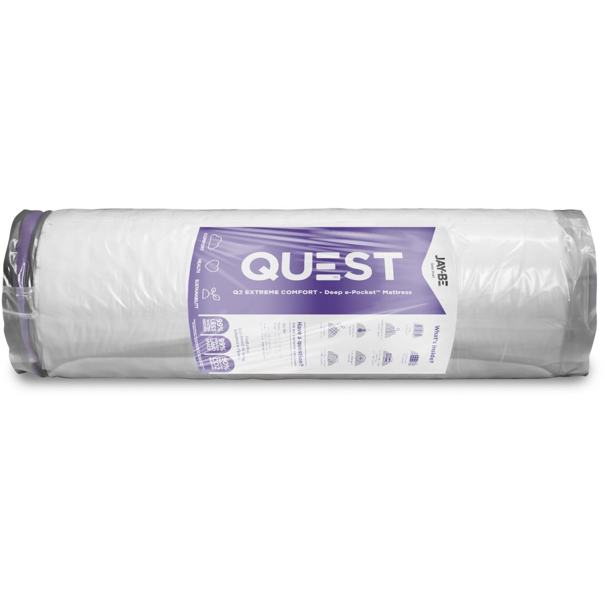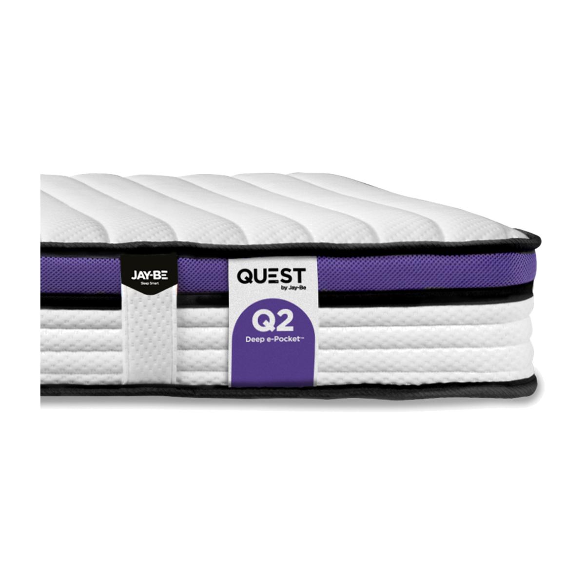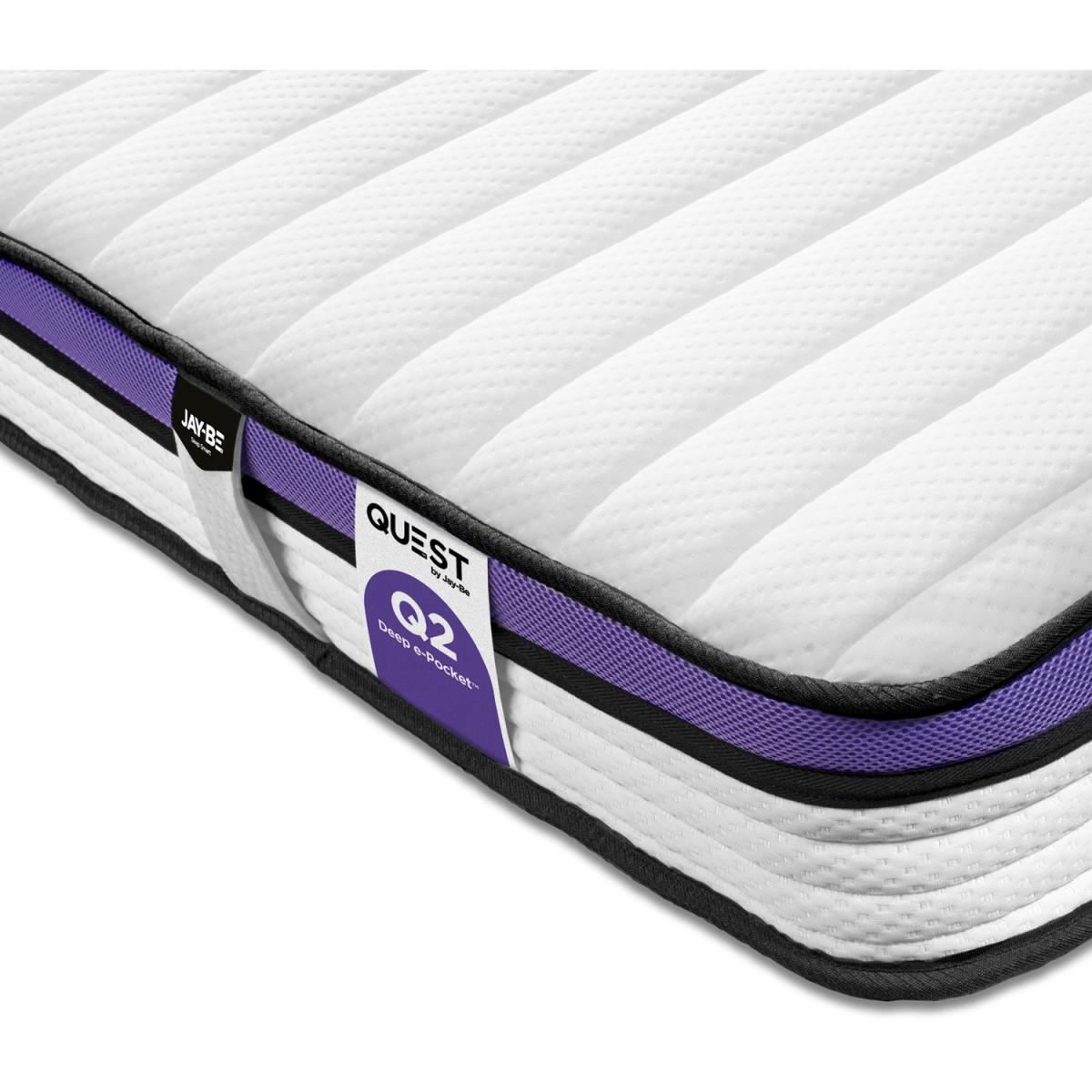Discover a new world of comfort for healthier sleep and the healthier planet with QUEST Children's Mattresses. Join our QUEST to save the Earth. QUEST Children's mattresses feature e-Fibre comfort layers made from polyester fibres spun from recyclable plastic bottles. By using e-Fibre in our mattresses we have prevented over 90million bottles from going into landfill and our oceans. Weight of plastic described in equivalent number of average-sized plastic drinking bottles. The Jay-Be Q2 Extreme Comfort Deep e-Pocket Mattress has springs that respond independently, moulding to the contours of a child's body. Preventing any transfer of movement across the mattress for a perfectly undisturbed nights sleep.