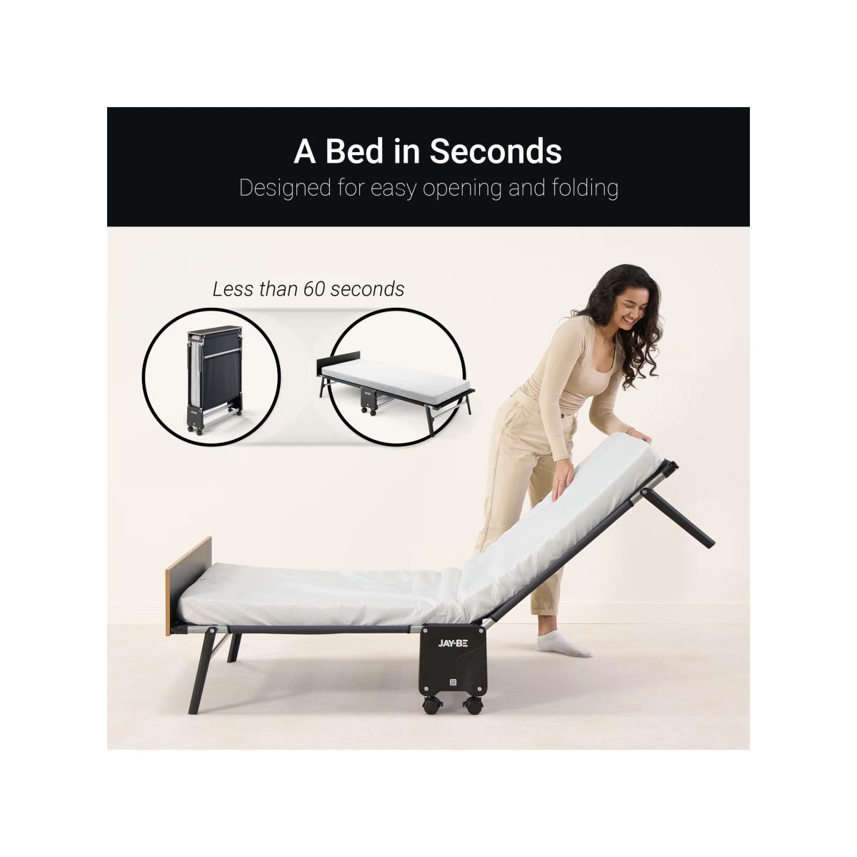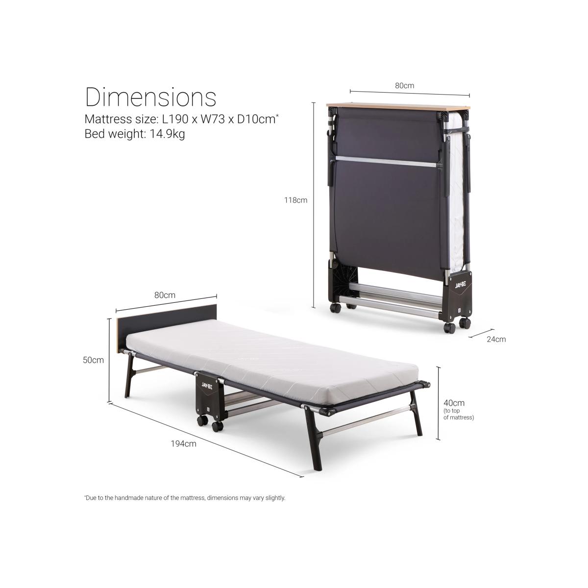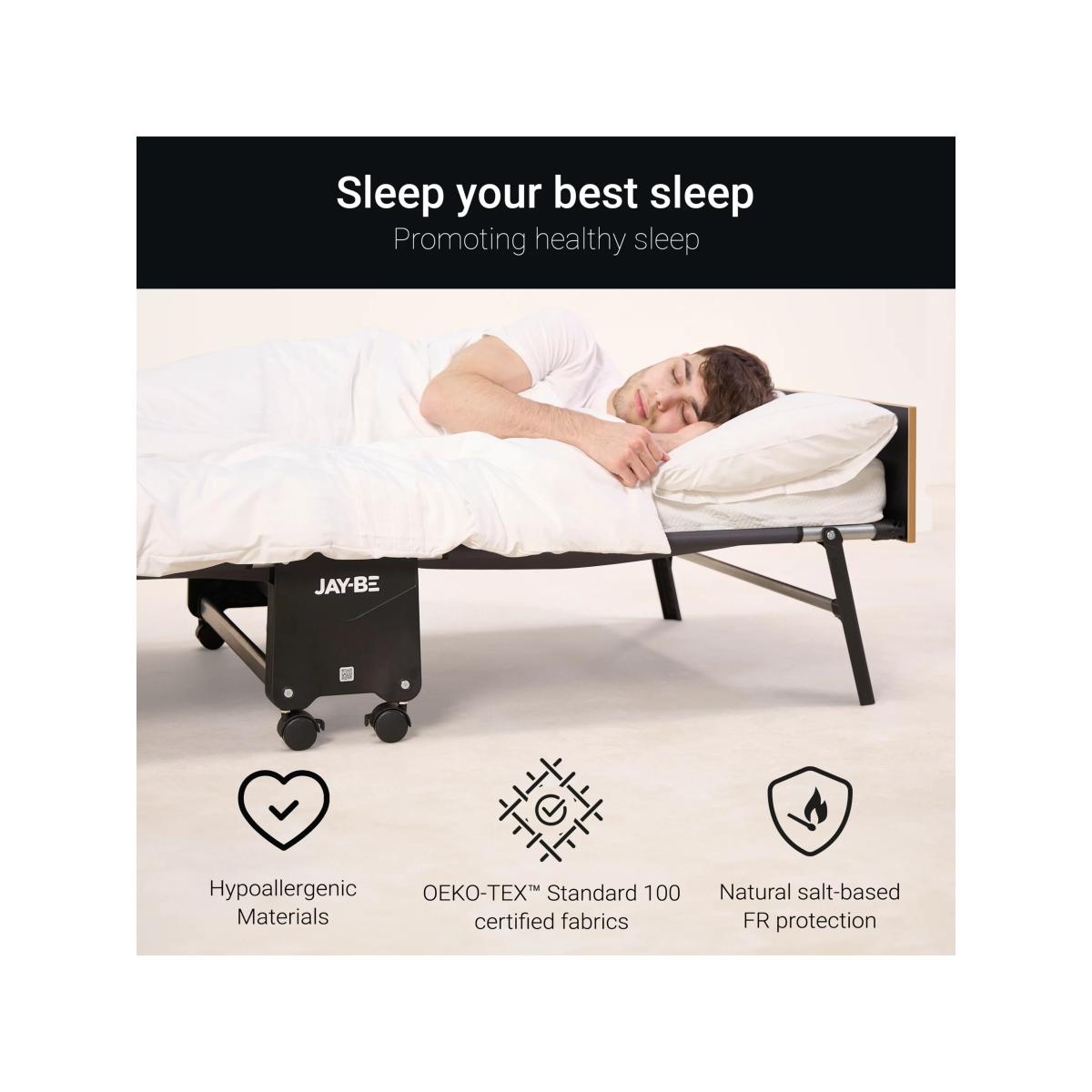 The Jay-BE® Rollaway RE80 offers comfort and space-saving convenience within a modern folding bed design. The 360-degree castors ensure easy mobility and J-Grip legs offer maximum stability. The Mono-Tex platform base, paired with the breathable e-Fibre mattress, delivers a supportive sleep foundation for long-lasting comfort. Worth Knowing All Jay-BE® folding beds achieve British, European and Internationally recognised safety standards. Want to see it first? You may want to see and get a feel for the furniture in one of our shops before ordering. We'll be able to tell you where the range you'd like to view is on display.