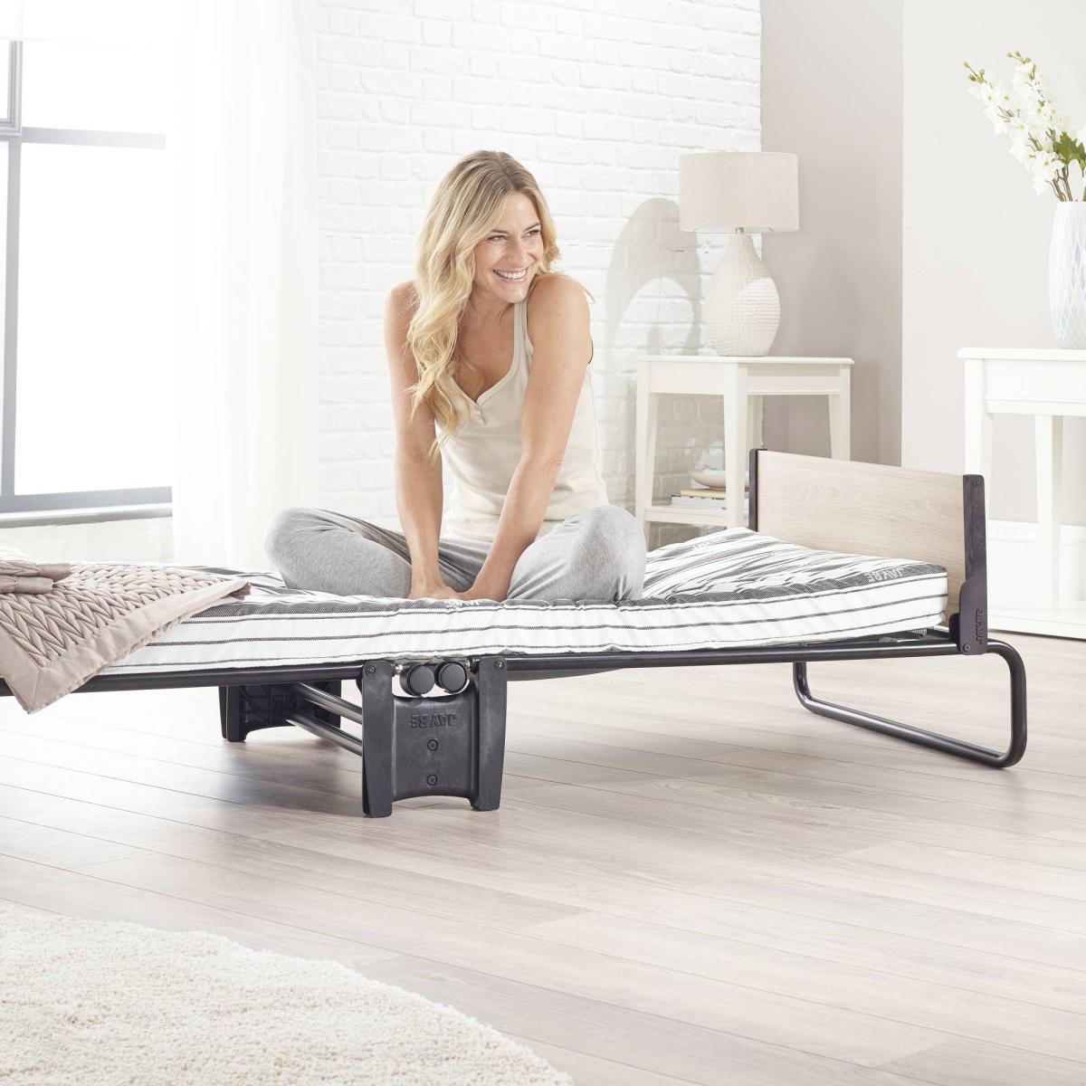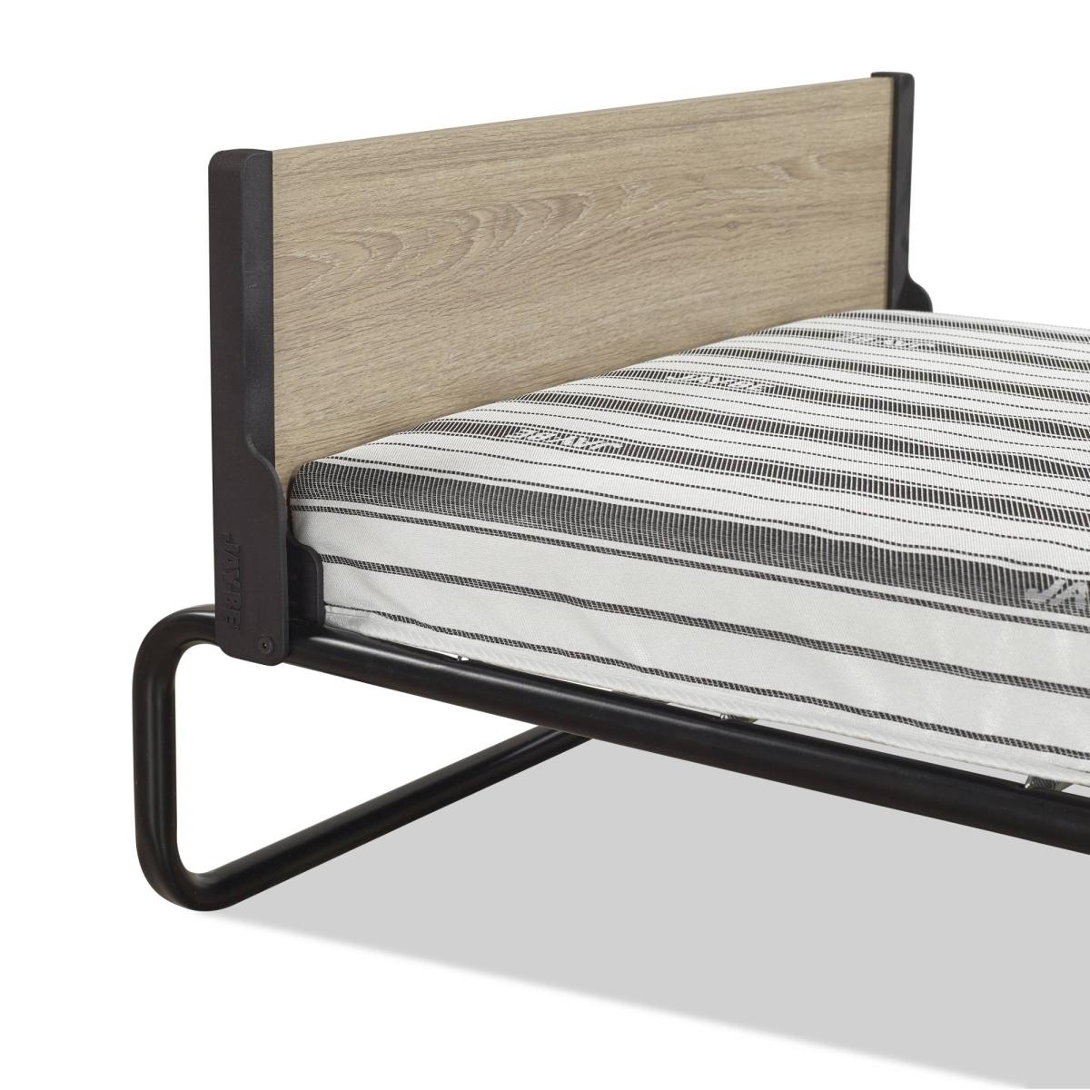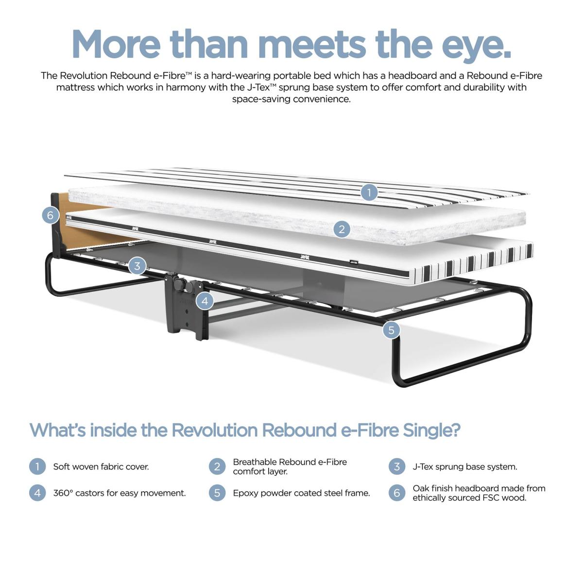 The revolutionary patent pending design of the Jay-Be Revolution Single Folding Bed makes it more compact, sturdier and more comfortable than traditional folding beds. Combining modern materials with innovative thinking, the addition of an FSC certified wood headboard ensures your pillows don't escape while you sleep, whilst 360° castors allow you to easily glide this guest bed to where you need it. For optimum comfort and full body support, the Rebound e-Fibre mattress rests on our exclusive J-Tex sprung base system. Suspended using high-tension springs, the J-Tex sprung base system performs as well as regular permanent beds and is specially engineered to be stretch resistant and offer long term durability. Key Features More compact, sturdier and comfortable than traditional folding beds. Full width headboard with an oak effect finish. FSC certified wood harvested from sustainable and ethical sources. 360° castors for easy manoeuvrability. 100% Foam Free breathable Rebound e-Fibre mattress. Free from harmful chemicals & VOC's. Hypoallergenic. J-Tex sprung base system for durability, support and comfort. Durable powder coat paint finish. Made with sustainably sourced, recyclable materials reducing landfill waste. British made with a lifetime frame guarantee. Exceeds British and European safety standards. 160kg User weight Dimensions Open: W77 x L200 x H32cm (to Headboard 48cm) Folded: W77 x D26 x H101cm Space under bed when open: 19cm Mattress dimensions: W68 x L190 x D10cm Packed dimensions: W79 x D24 x H97cm Product weight: 18kg / 39.7lbs Packed weight: 19.1Kg / 42lb