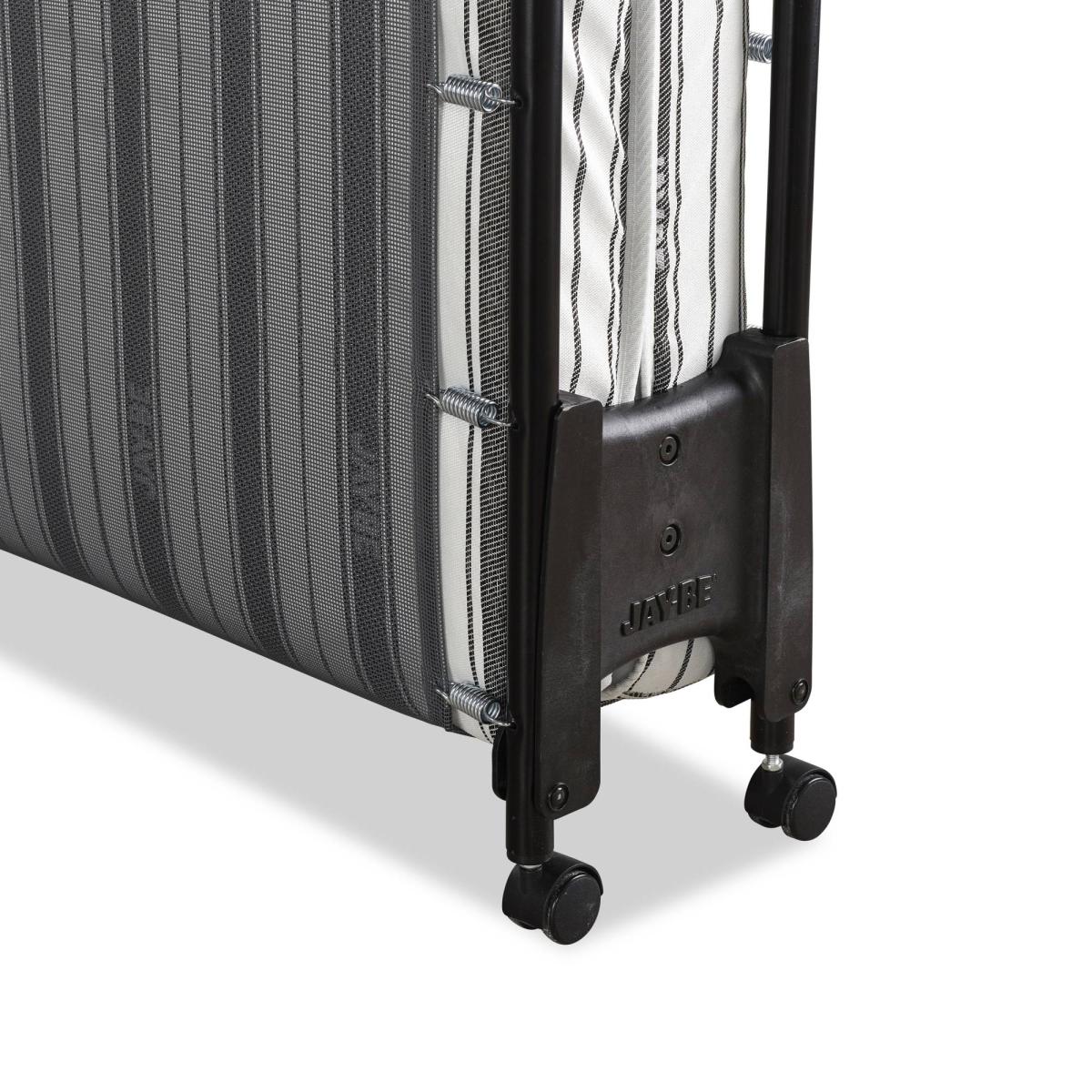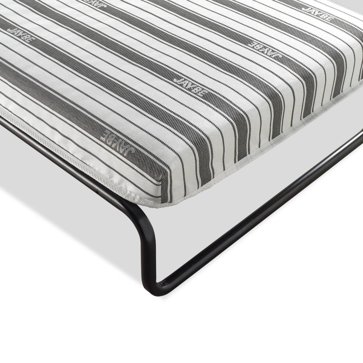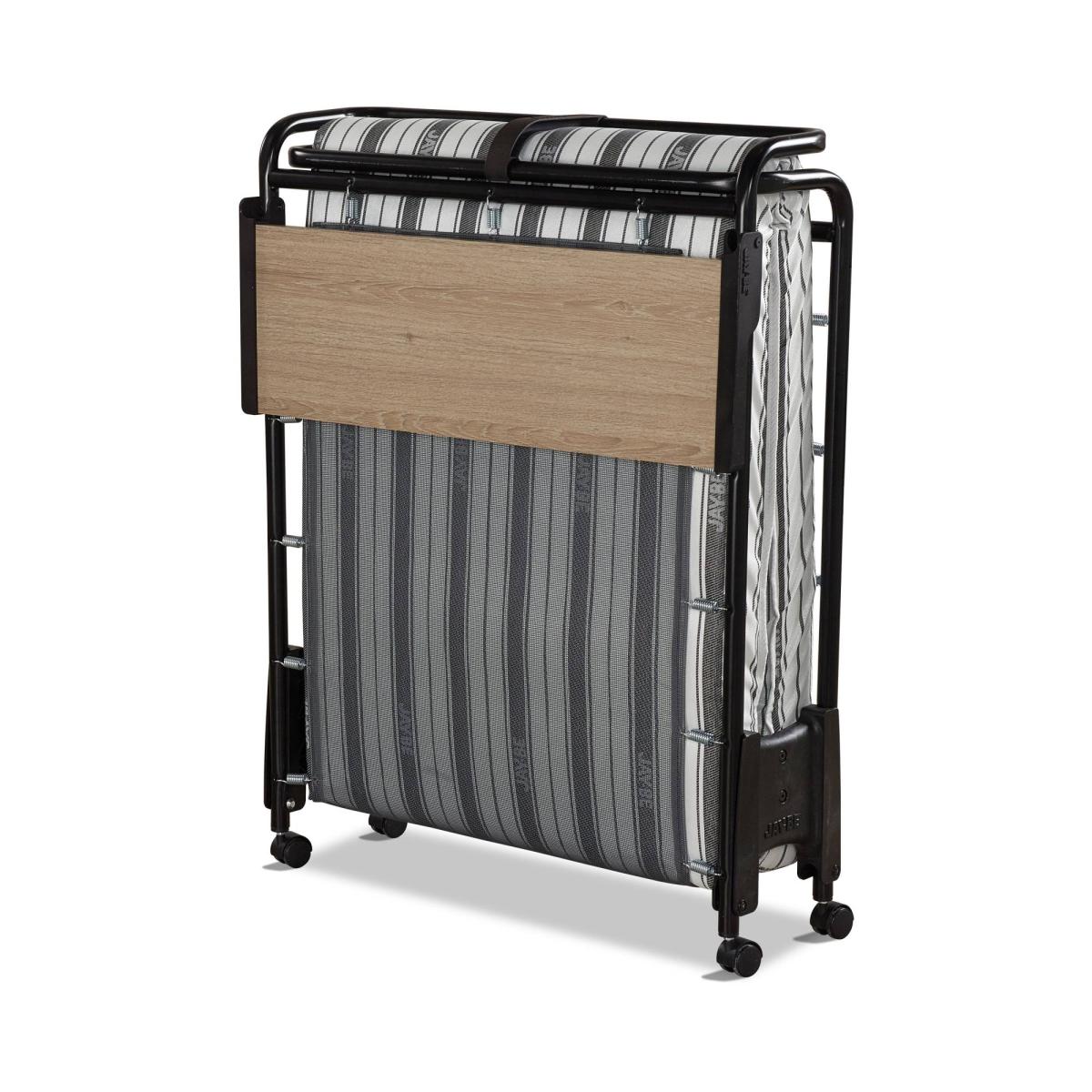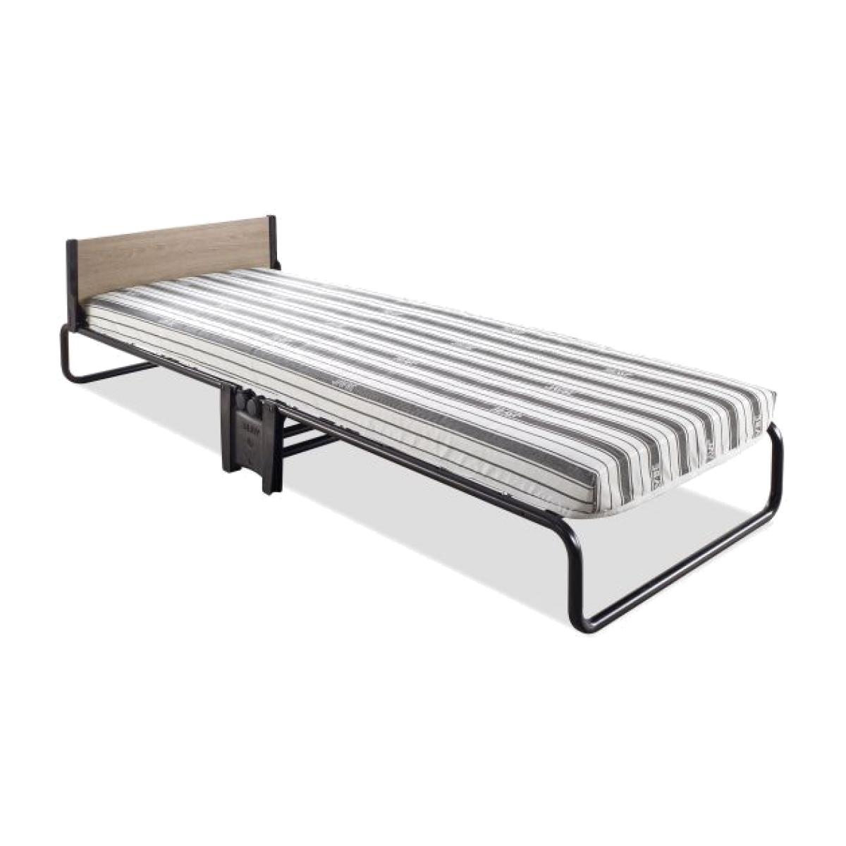 The revolutionary patent pending design of the Jay-Be Revolution Single Folding Bed makes it more compact, sturdier and more comfortable than traditional folding beds. Combining modern materials with innovative thinking, the addition of an FSC certified wood headboard ensures your pillows don't escape while you sleep, whilst 360° castors allow you to easily glide this guest bed to where you need it. For optimum comfort and full body support, the Rebound e-Fibre mattress rests on our exclusive J-Tex sprung base system. Suspended using high-tension springs, the J-Tex sprung base system performs as well as regular permanent beds and is specially engineered to be stretch resistant and offer long term durability. Key Features More compact, sturdier and comfortable than traditional folding beds. Full width headboard with an oak effect finish. FSC certified wood harvested from sustainable and ethical sources. 360° castors for easy manoeuvrability. 100% Foam Free breathable Rebound e-Fibre mattress. Free from harmful chemicals & VOC's. Hypoallergenic. J-Tex sprung base system for durability, support and comfort. Durable powder coat paint finish. Made with sustainably sourced, recyclable materials reducing landfill waste. British made with a lifetime frame guarantee. Exceeds British and European safety standards. 160kg User weight Dimensions Open: W77 x L200 x H32cm (to Headboard 48cm) Folded: W77 x D26 x H101cm Space under bed when open: 19cm Mattress dimensions: W68 x L190 x D10cm Packed dimensions: W79 x D24 x H97cm Product weight: 18kg / 39.7lbs Packed weight: 19.1Kg / 42lb