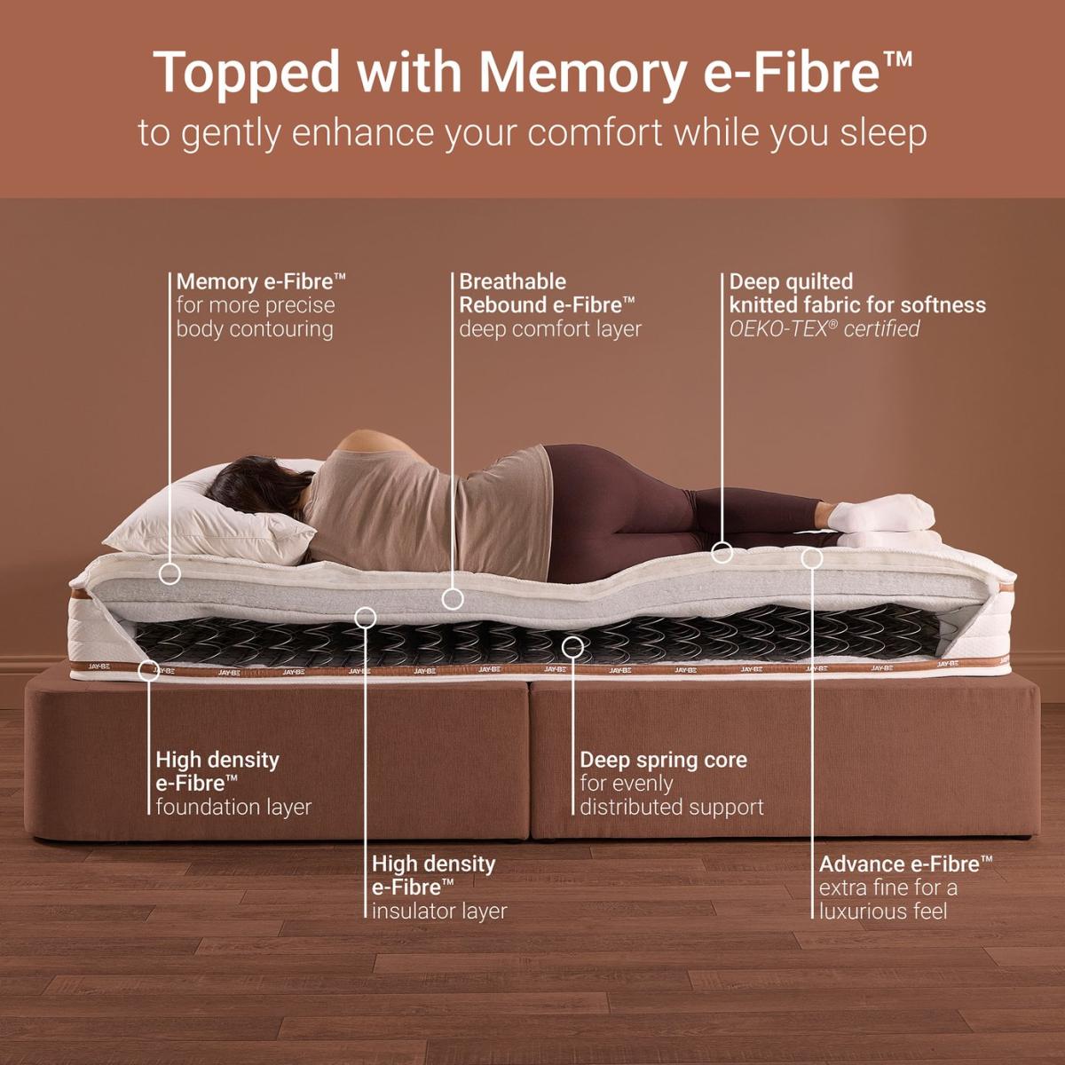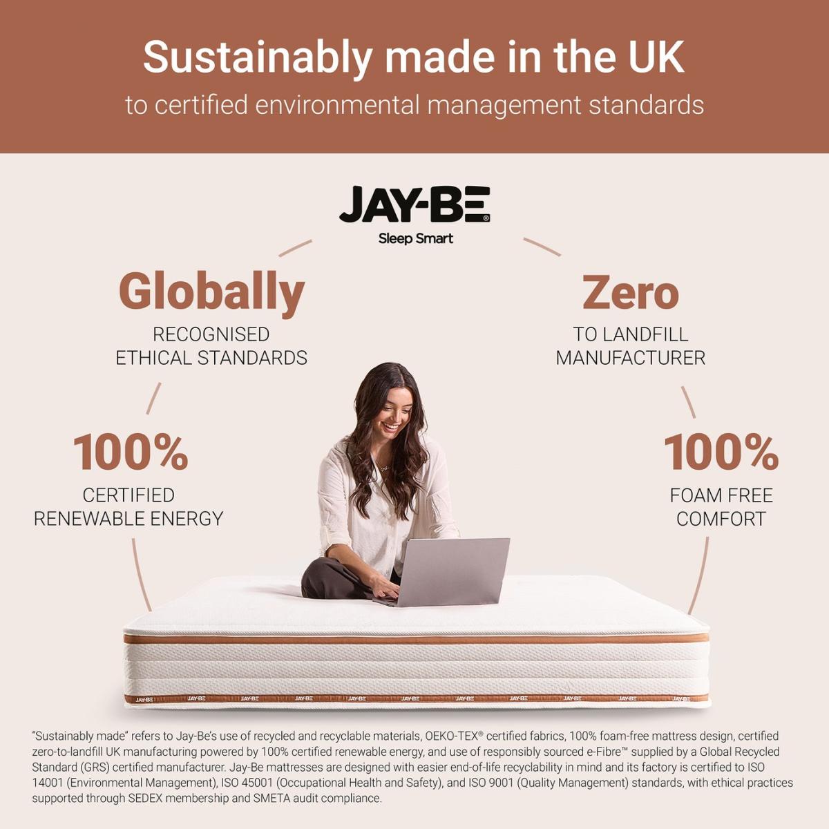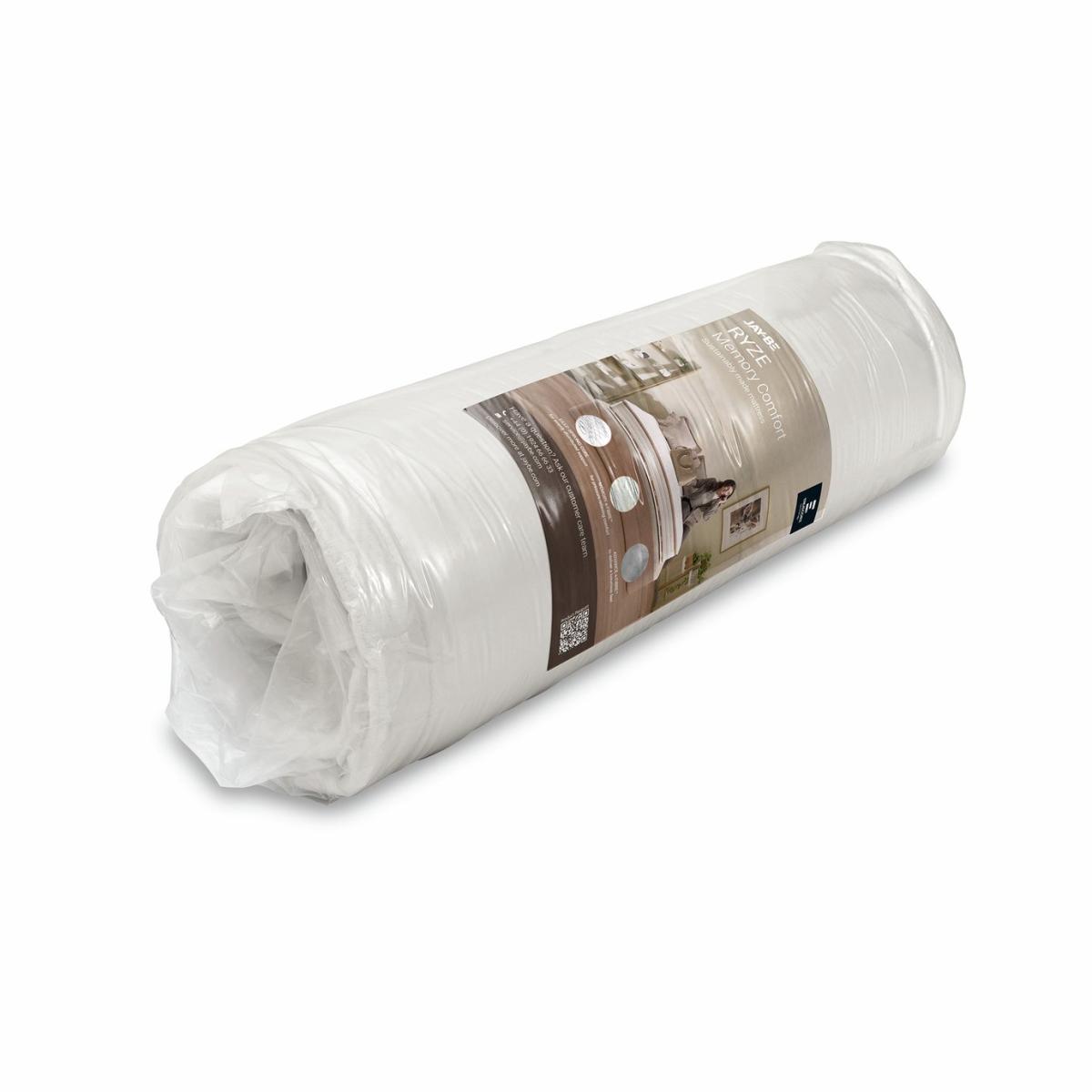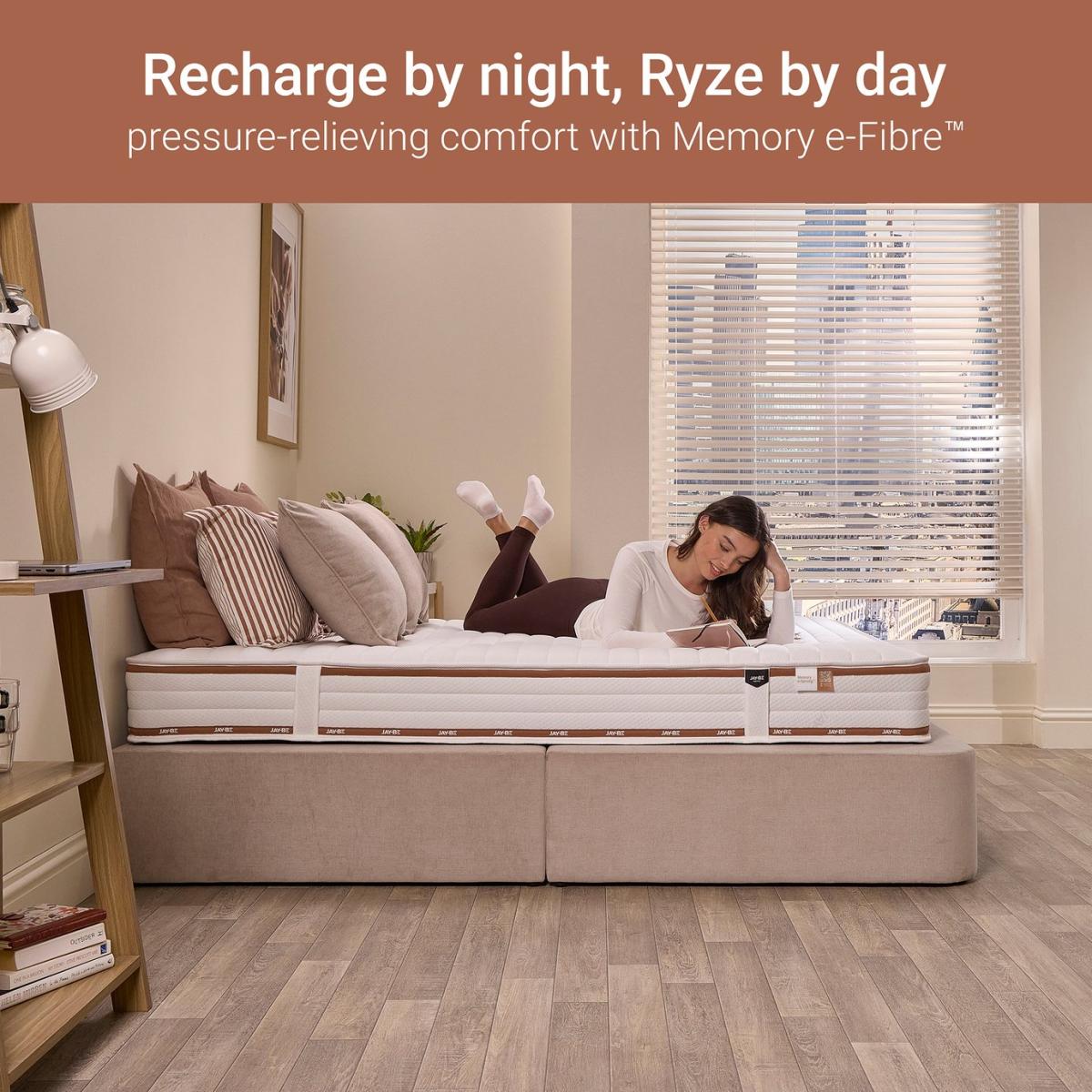 Pressure relief meets breathable comfort. Love the feel of a sprung mattress but want extra pressure relief, the Jay-Be Ryze Memory e-Fibre mattress combines both, plus added breathability for enhanced freshness. Created to mirror the pressure relieving properties of memory foam, Jay-Be's innovative Memory e-Fibre] gently adapts to body shape for personalised comfort. An open-cell vertical fibre structure allows air to flow more freely than conventional memory foam, helping to support a drier, more temperature-regulated sleep environment. Every feature of the Ryze Memory mattress has been carefully considered with comfort, well-being and sustainability in mind. It is made in Jay-Be's UK factory, which is powered by 100% certified renewable electricity and operates a zero-to-landfill policy. For added convenience, the mattress is vacuum packed and rolled, and comes with a ten-year manufacturer's guarantee, offering long lasting peace of mind. Part of the Ryze collection. Medium firm feel. Open coil mattress with 325 springs. Knit cover with micro quilt finish. Mattress size W120, L190, D20cm. Mattress Weight 16.8kg. No-turn mattress. Rotate mattress regularly. Made in the UK. Rolled mattress. Package Dimensions: Package 1 dimensions: H129, W32, D32cm. Package 1 weight: 19kg. General information: Manufacturer's 10 year guarantee.
