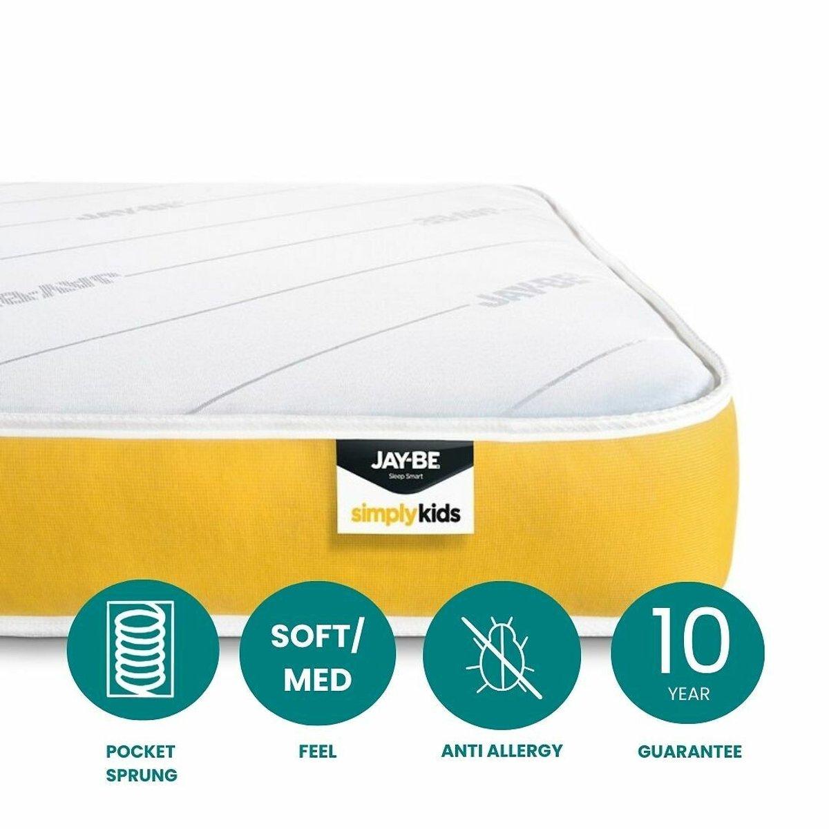 A premium option from the Jay-Be Children’s mattress range, this mattress features a higher specification deep e-Pocket spring interior that responds to the contours of your child’s body to provide exceptional reactive support. It is also infused with the latest Purotex® anti-allergy technology, actively creating a cleaner and healthier sleeping environment which helps to ensure a peaceful night’s sleep. Breathable Recound e-Fibre comfort layer helps temperature and moisture regulation, and offers optimum comfort layer recoverywhilst a cushioned border helps extend the mattress life. Product details • Medium/Soft comfort• Foam Free - so free from harmful chemicals • Suitable for all sleeping styles• Pocket Sprung • The e-Fibre comfort layers feature polyester created from 80% recycled plastic, and is 100% recyclable. A revolutionary fabric proven to offer significant environmental benefits including 99% less water needed, 99% reduced land space, and 90% reduced CO2 emssions• Flat top Polyester & Polypropylene sleeping surface • Vacuum packed and rolled for ease of transport• Zero to Landfill - this mattress crafted by an accredited zero to landfill manufacturer which along with recycling as much as possible also ensures that any waste which cannot be recycled does not end up in landfill and is sent for waste to energy.• Packaging reduced by 70% to reduce CO2 vs a flat packed mattress• Made in the UK to British and European safety standards• 10 year manufacturers guarantee. Care information: Mattress can be slept on immediately after opening, but ideally, leave 3-4 hours to fully recover after opening. Rotate regularly. Safety regulations require that if the mattress is being used on a bunk, it should sit 16 cm below the guard rails, however we always recommend you check the recommended mattress height from your bunk bed manufacturer where possible. Product Dimensions Single 190 cm x 90 cm x 18 cm , Weight - 12.3 KGEU Single 200 cm x 90 cm x 18 cm , Weight - 13.6 KGPackage Dimensions. Single: 100 cm x 32 cm x 32 cm, Weight 14.2 kgE. U Single: 100 cm x 32 cm x 32 cm, Weight 15.3 kg. This product will be dispatched by one of our trusted suppliers. You’ll be contacted by their selected courier about your delivery. Please note: this product cannot be delivered to all Offshore Islands, Northern Ireland or Republic of Ireland. JAYBE01