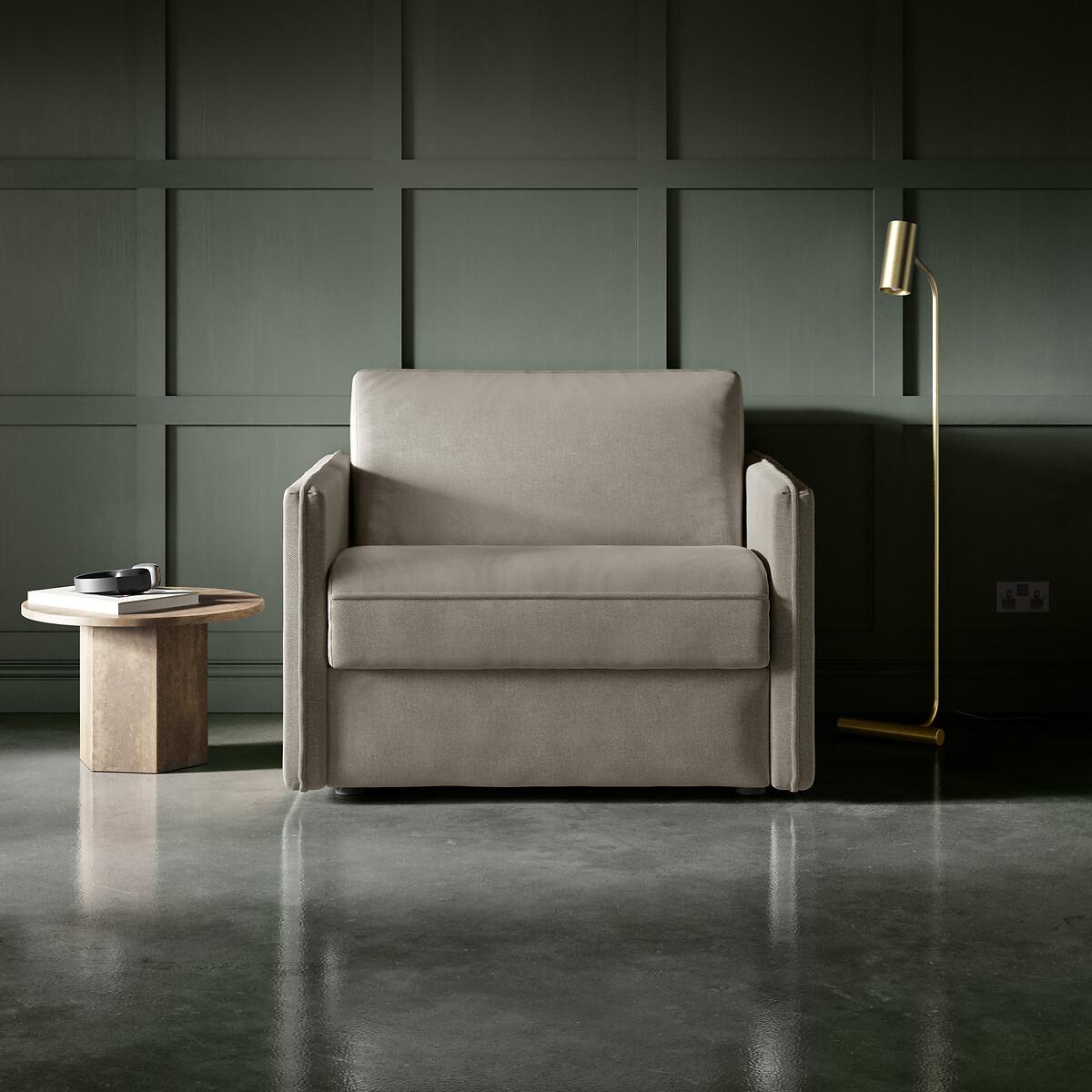 Chic and sleek, the Slim snuggle chair with integrated sofa bed is the ideal option for those seeking sophistication without sacrificing space. Clean lines and a compact profile create a stylish sofa perfectly suited for smaller living rooms. The premium fold-out mechanism creates a luxurious bed in seconds, keeping the seat and back cushions perfectly in place for a seamless transformation. A deep e-Spring mattress, topped with natural wool, offers exceptional support, breathability, and moisture control. Handcrafted in the UK, each element—from the FSC-certified wood frame to GreenF. R® fabrics and natural salt-based fire-retardant protection—is thoughtfully chosen to promote sustainability and well-being. The result: a sofa bed that harmoniously combines luxury, comfort, and eco-conscious design. Product Details:• Upholstered in brushed twill; a flatweave tweed effect fabric with a natural wool look and feel. Check it's right for you - order a FREE swatch. • Premium fold-out mechanism creates a comfortable bed in seconds whilst keeping seat and back cushions in place. • Fibre wrapped seat fillings, for extra cosiness.• Deep sprung mattress with breathable e-Fibre fillings and a wool topping supports natural temperature regulation. • GreenF. R® Protection on upholstery fabrics: non-toxic flammability-resistant treatment.• Natural salt-based FR treatment on mattress.• OEKO-TEX™ 100 Standard certified fabrics, so no nasty chemicals are present.• OEKO-TEX™ Eco Passport certified fabrics: for environmentally responsible textile production.• FSC® certified, sustainably sourced wood has been used to make the frame.• Mattress is 100% recyclable at the end of its useful life.• Jay-Be uses recycled materials wherever possible and is a Zero to Landfill manufacturer.• Sustainably made in the UK with a Lifetime Frame Guarantee and 5 Year Mattress Guarantee. • Made to order• Delivered fully assembled General Safety:• This sofa bed is designed for adults and older children. • Please note: Gaps exist between the frame parts that may pose a risk of entrapment for babies and young children. For their safety we recommend that babies and young children use an age-appropriate bed or cot. Product Composition:25% wood, 40% steel, 20% Polyester, 10% foam, 5% Wool Mattress Type - Sprung Product Dimensions:Sofa depth 102 cm Sofa width 105 cm. Back height 84 cm. Arm height (from floor) 62 cm. Seat depth 58cm. Seat height 48cm. Width between arms 88cm. Total dimensions (when sofa bed in use) H55 x L219 x W105 cm Mattress Dimensions H13 x W76 x L195 cm Sofa bed weight 84kg. Package Dimensions:Parcel 1 - L102 x W190x H62cm, 20 KGParcel 2 - L90 x W77 x H49cm, 27 KGParcel 3 - L103 x W91 x H55cm, 46 KG