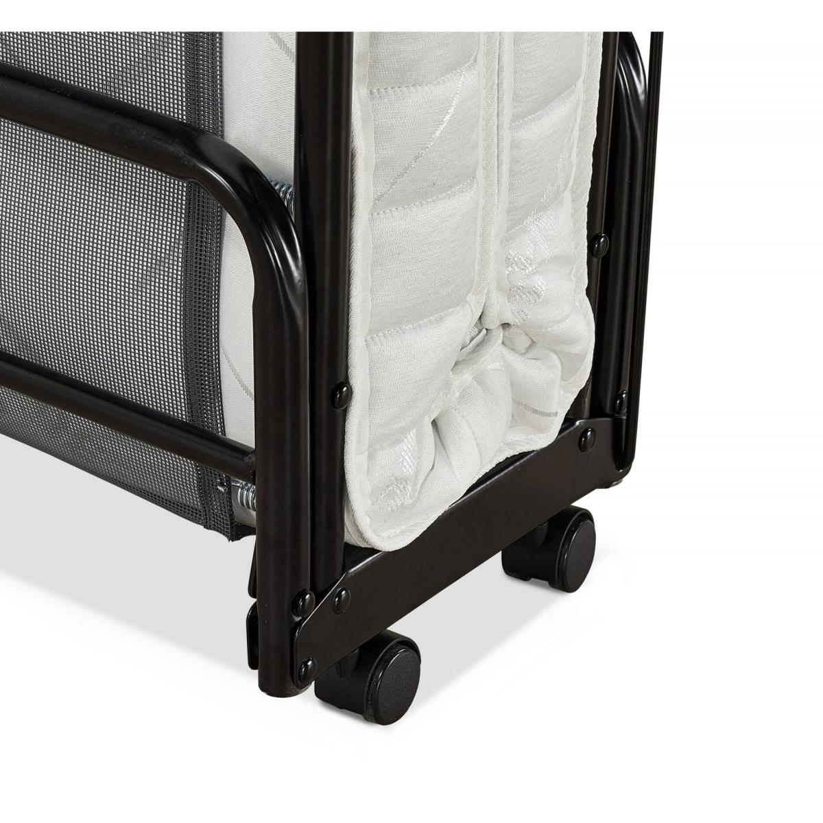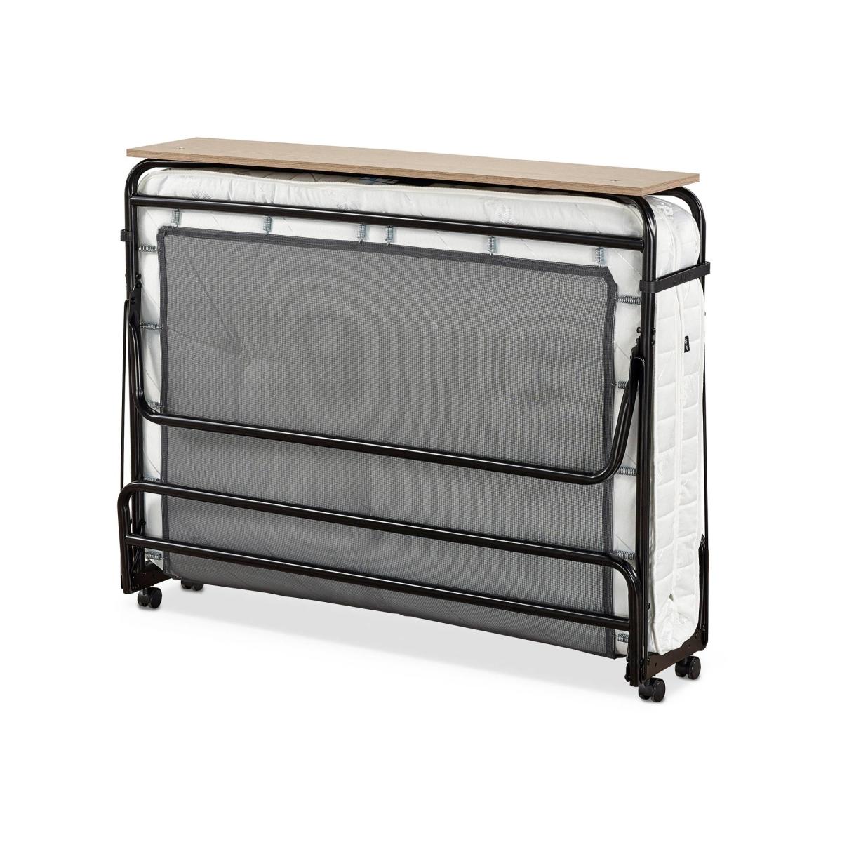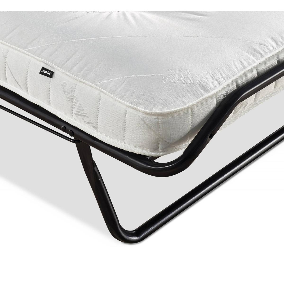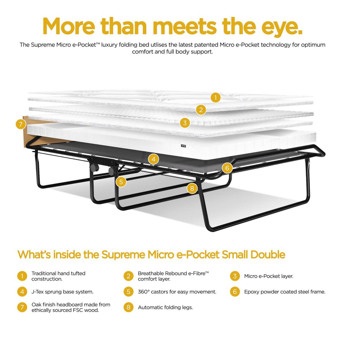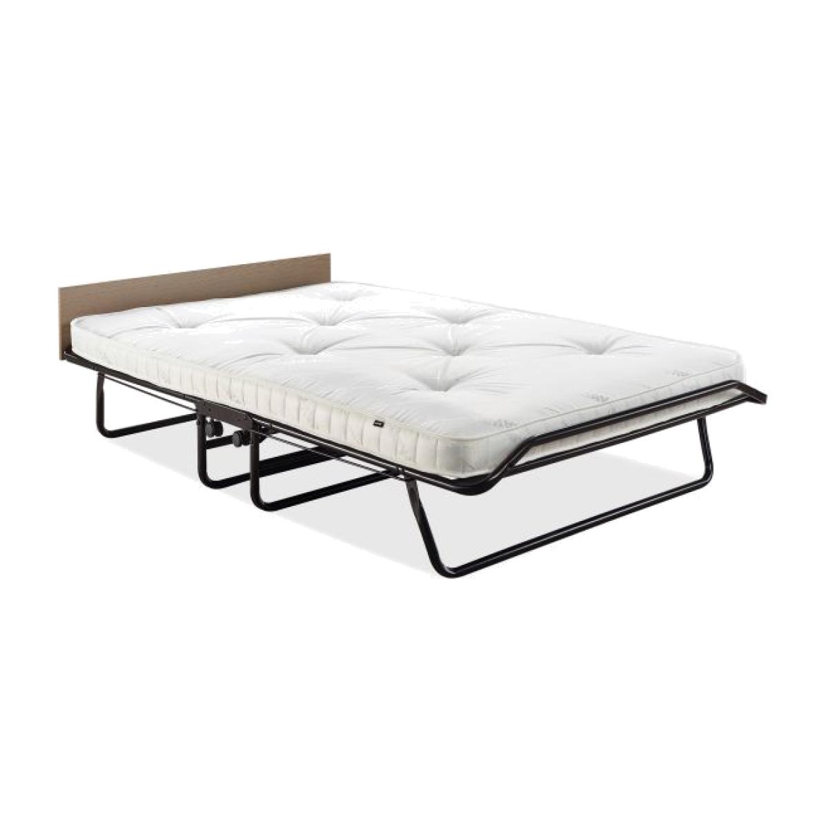 The Jay-Be Supreme Small Double Folding Bed with Micro e-Pocket mattress offers a generously sized sleeping environment combinded with a sturdy compact design. With a sturdy steel frame and our very latest J-Tex sprung base system to provide maximum comfort, durability and support - the Supreme is perfect for unexpected sleepovers and regular visitors. Resting on our exclusive Jay-Be J-Tex sprung base system the Micro e-Pocket mattress encapsulates over 600 individual micro pocket springs with the additional benefit of a comfort layer made from our Rebound e-Fibre. Each spring works independently with the premium fillings to adapt to the contour of your body offering luxurious comfort for a quality night's sleep. For the ultimate convenience the 360° castors on this guest bed make manoeuvring around the room easy and the fully automatic leg mechanism makes it even easier to open and close in seconds. The addition of a headboard secures your pillow and the foot end helps keep the mattress in place for an undisturbed night's sleep. Key Features Perfect for those looking for a larger sleeping area. A sturdy folding bed perfect for regular use. Fully automatic folding legs make it easy to open and close. Full width headboard with an oak effect finish. Micro e-Pocket mattress with 600 individual springs working independently to adapt to the contours of your body. 100% Foam Free breathable Rebound e-Fibre comfort layers. Free from harmful chemicals & VOC's. Hypoallergenic. J-Tex sprung base system for durability, support and comfort. FSC certified wood harvested from sustainable and ethical sources. Durable powder coat paint finish. Made with sustainably sourced, recyclable materials reducing landfill waste. British made with a lifetime frame guarantee. Exceeds British and European safety standards. 220kg User weight Dimensions Open: W122 x L197 x H38.5cm (to Headboard 51cm) Folded: W122 x D29 x H97cm Space under bed when open: 23.5cm Mattress dimensions:W120 x L191 x D10cm Packed dimensions: W123 x D30 x H94cm Product weight: 31kg / 68.3lbs Packed weight: 34.6Kg / 76.3lb