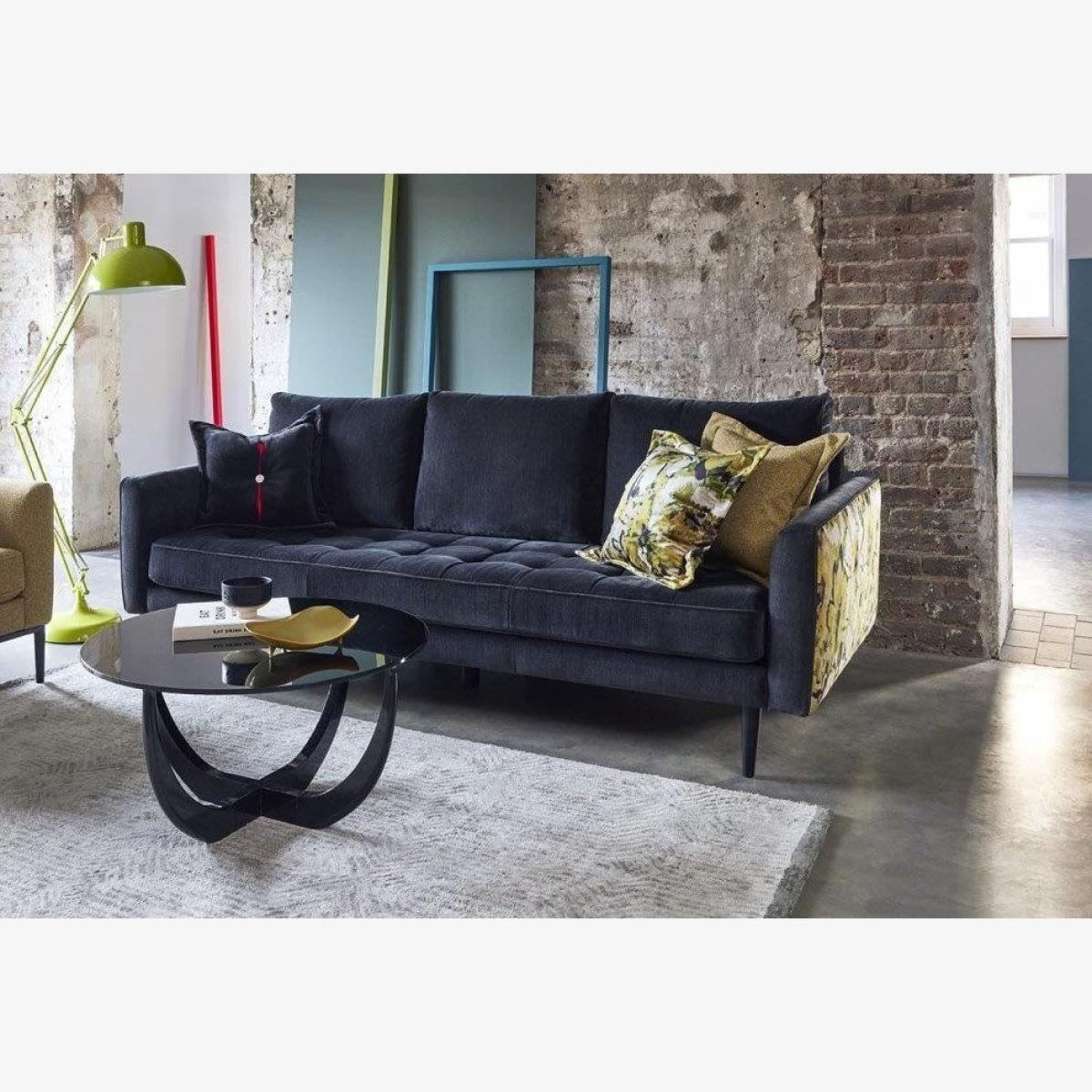 Slim, sleek, and sophisticated. Ridley's clean lines, beautiful piping, and distinctive pulled seat detailing offer a contemporary and yet timeless design style. Taking inspiration from mid century furniture, Ridley will add a touch of vintage charm to any room. With the option of adding an accent fabric onto the sides, you can make Ridley even more eye-catching than it already is. A modern twist on ageless elegance. Perfect for casual living, whilst offering versatility for a family environment, Ridley will soon become a firm favourite with everyone. The gorgeous tufting detail on the seat cushions is incredibly inviting, making Ridley the perfect place to spend time with friends, or lounging around by yourself. Ridley can be customized even further, with the option of adding either more traditional wooden feet or a more contemporary metal plinth, to fully fit into your domestic setting style. The Ridley sofa is pictured here in the Manhattan Slate and Floresta Citrus two fabric story. Grand Sofa Dimensions: Height: 90cm Depth: 97cm Width: 240cm Seat Height: 46cm Seat Depth: 58cm Seat Width: 210cm Features: Handcrafted in the UK Available with Ebony Wooden Feet or a Black Metal Plinth Available in a range of quality fabrics, leathers and accent fabrics 25 year frame and frame construction guarantee 10 year spring guarantee Each G Plan Vintage Ridley Sofa comes in the following options: Fabric cover all-over (plain or accent fabric) Two fabric story (see image for fabric location) Leather cover all-over Choice of Wooden Feet or a Metal Plinth Important InformationAll measurements are approximate and relate to the overall size of the item including soft arm cushions where fitted and back cushions. All units feature the G Plan Vintage signature pink panel on RHF side of the inside back. All units come with a G Plan Vintage branded badge. Available in a range of Fabrics, Leathers & Accent Fabrics. All Units are available in one Fabric or Leather as well as a Two Fabric Story option. All units have the option of Wooden Feet or a Metal Plinth. Wooden feet come in Ebony as standard. Metal Plinths come with Metal feet in Black as standard. Seat cushions are a fixed-type. Scatter cushions are available at extra cost. Back cushions are made using 100% recyclable polyester fibre from recycled plastic waste