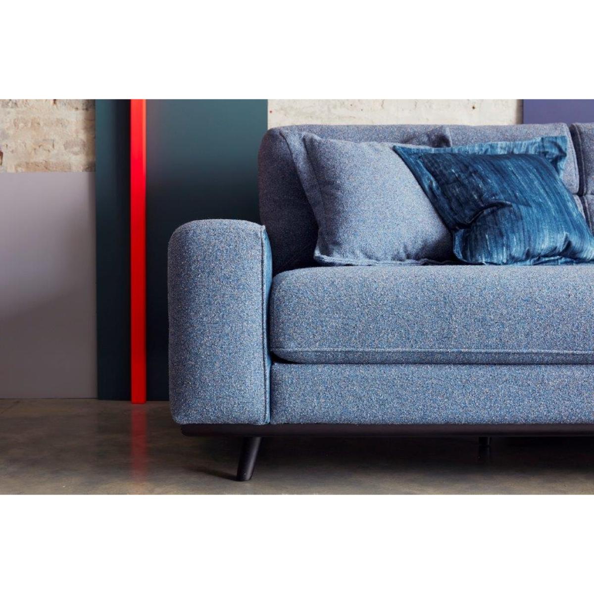 Stamford is smart and sophisticated - yet warm, welcoming, and neat. With immaculate tailored lines and considered back, seat and arm details, Stamford radiates cool mid-century character, combining G Plan's signature comfort with pure style. Stamford's uniform, neat lines emit the sense of organization and structure; however, this suite offers undeniable comfort, bringing a sense of calm and tranquillity to a living space. You also have the option of including accent fabrics on the inside arms of Stamford, a feature not available on any other sofa in the G Plan Vintage collection, allowing your Stamford suite to become striking and curated completely to your taste. The Stamford Sofa is available in a range of beautiful colours and accent fabrics, and is pictured here in Tweed Denim and Boreal Lapis two fabric story. Grand Sofa Dimensions Height: 94cm Depth: 100cm Width: 230cm Seat Height: 48cm Seat Depth: 64cm Seat Width: 180cm Features: Handcrafted in the UK Supplied with an Ebony wooden plinth and Ebony wooden feet as standard All units come with a G Plan Vintagebranded badge. Available in a range of quality fabrics, leathers and accent fabrics 25 year frame and frame construction guarantee 10 year spring guarantee Each G Plan Vintage Stamford Sofa comes in the following options: Fabric cover all-over (plain or accent fabric) Leather cover all-over Two fabric story (see image for fabric location) Important Information: All measurements are approximate and relate to the overall size of the item including soft arm cushions where fitted and back cushions. All units feature the G Plan Vintage signature pink panel on RHF side of the inside back. All units come with a G Plan Vintage branded badge. Available in a range of Fabrics, Leathers & Accent Fabrics. All Units are available in one Fabric or Leather as well as a Two Fabric Story option. All units are supplied with a wooden plinth and wooden feet as standard. Wooden plinths and wooden feet come in Ebony as standard. Seat cushions are a fixed-type. Scatter cushions are available at extra cost. Back cushions are made using 100% recyclable polyester fibre from recycled plastic waste.