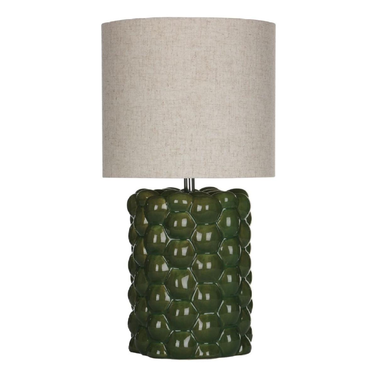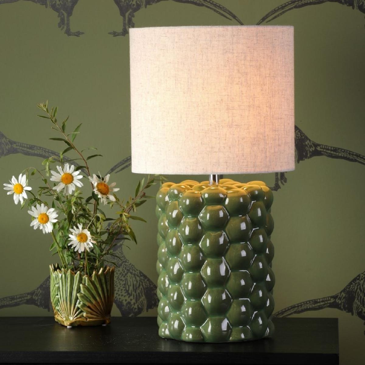 Jayden retro-inspired ceramic table lamp with bobble surface finish, forest green glaze and natural linen shade. Inspired by mid-century design, this cylindrical lamp features a unique bobble surface finish and a glossy green glaze, evoking both a sense of nostalgia and sophistication. Paired with a natural linen shade, the Jayden lamp creates a striking visual statement, making it the perfect addition to any space in need of a touch of character. Whether placed on a bedside table, console or desk, this lamp adds warmth and personality to your interior decor. Jayden retro-inspired ceramic table lamp with bobble surface finish, forest green glaze and natural linen shade. Inspired by mid-century design, this cylindrical lamp features a unique bobble surface finish and a glossy green glaze, evoking both a sense of nostalgia and sophistication. Paired with a natural linen shade, the Jayden lamp creates a striking visual statement, making it the perfect addition to any space in need of a touch of character. Whether placed on a bedside table, console or desk, this lamp adds warmth and personality to your interior decor.