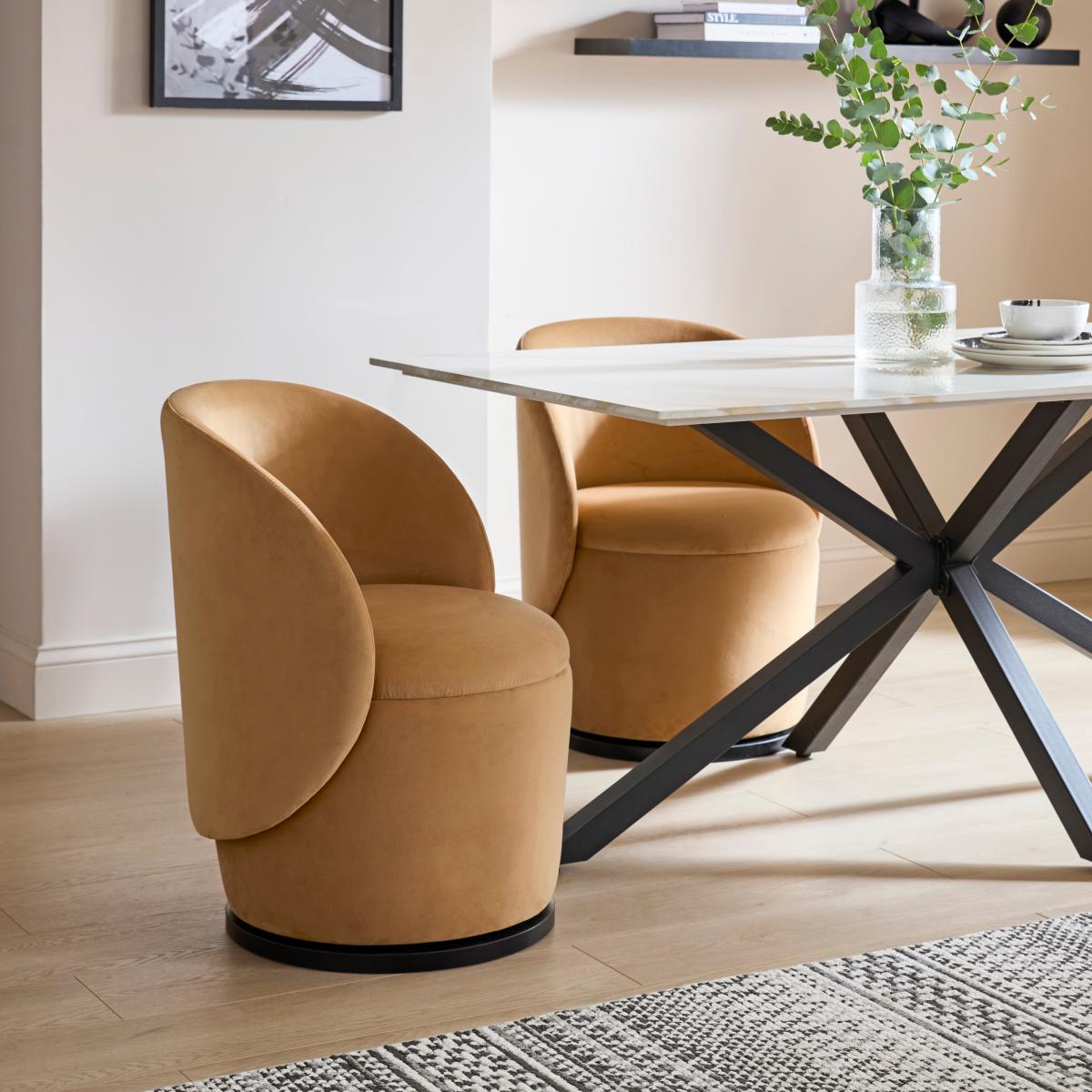 I’m a big fan of this velvet swivel chair for its clean, curved silhouette and soft upholstery - it instantly lifts a dining area without overwhelming the space. The swivelling base adds a bit of ease when pulling in and out, while the rich velvet finish brings just the right amount of luxe without feeling fussy. Styling tip: tuck it under a simple, light-toned table to balance the warmth of the fabric, then layer a woven rug underneath for texture. It works equally well in modern Scandi schemes or mid-century inspired dining rooms; alternatively, group two in a corner with a slim side table and a sculptural lamp to create a cosy reading nook.