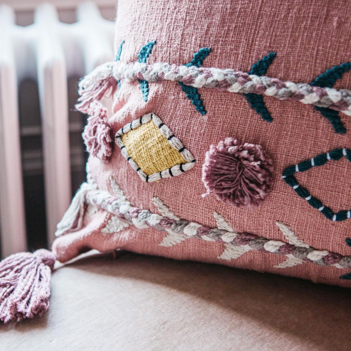 With handstitched embroidery, soft pom poms and geometric shapes this rose pink cushion is ideal for the bohemian home.