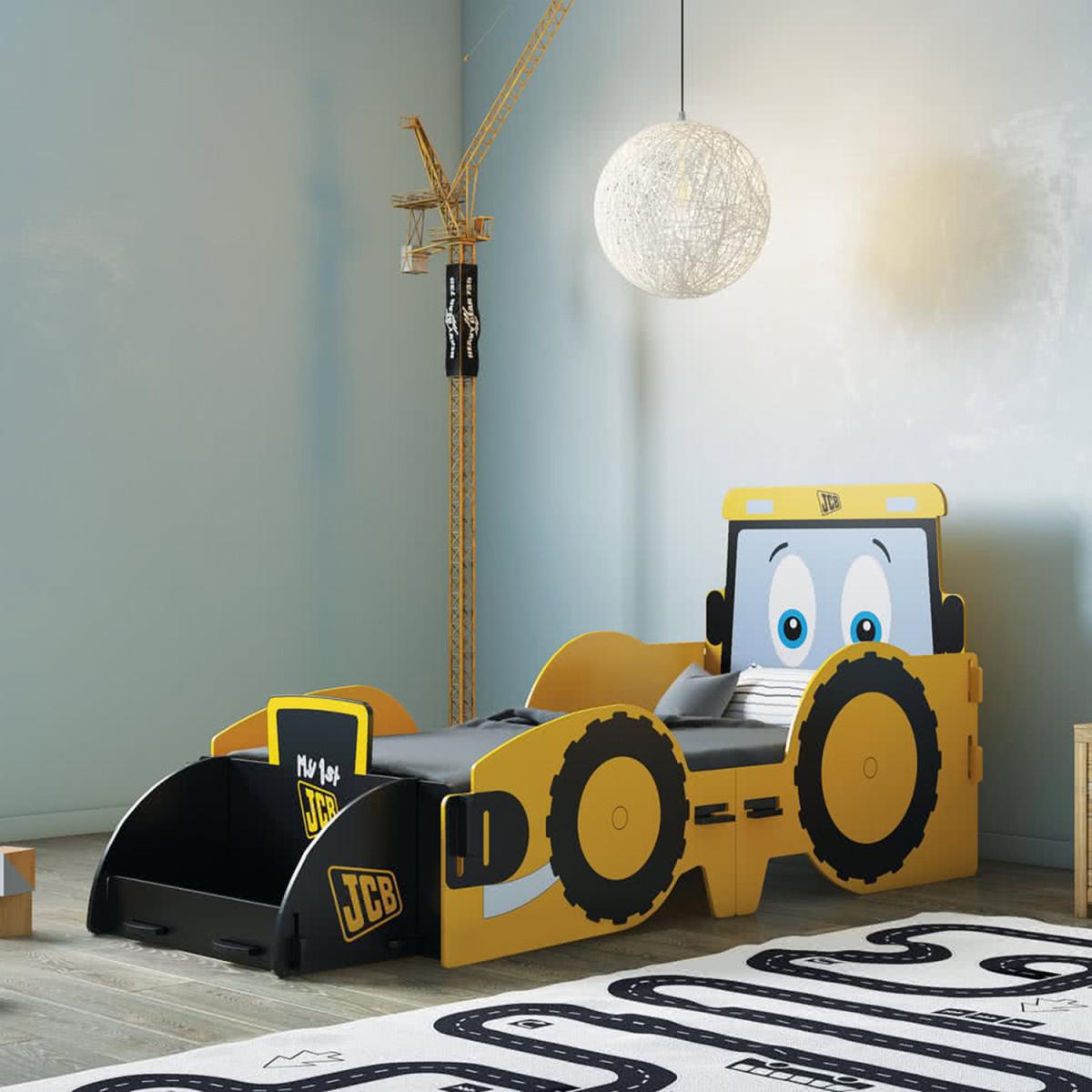 I love the JCB bed for its bold, playful look and sturdy build - it instantly becomes the focal point of a toddler’s room without feeling out of place. It works equally well in a transport-themed space or a more pared-back, contemporary nursery: pair neutral wall paint (think soft greys or off-white) with pops of black and yellow elsewhere to tie everything together. For styling, add a simple striped rug in charcoal and white, storage boxes in matching tones and a few construction-print cushions to reinforce the theme. Keep bedding crisp and minimal so the JCB shape really stands out, and consider floating shelves in black metal for books and toys to complement the bed’s industrial vibe.
