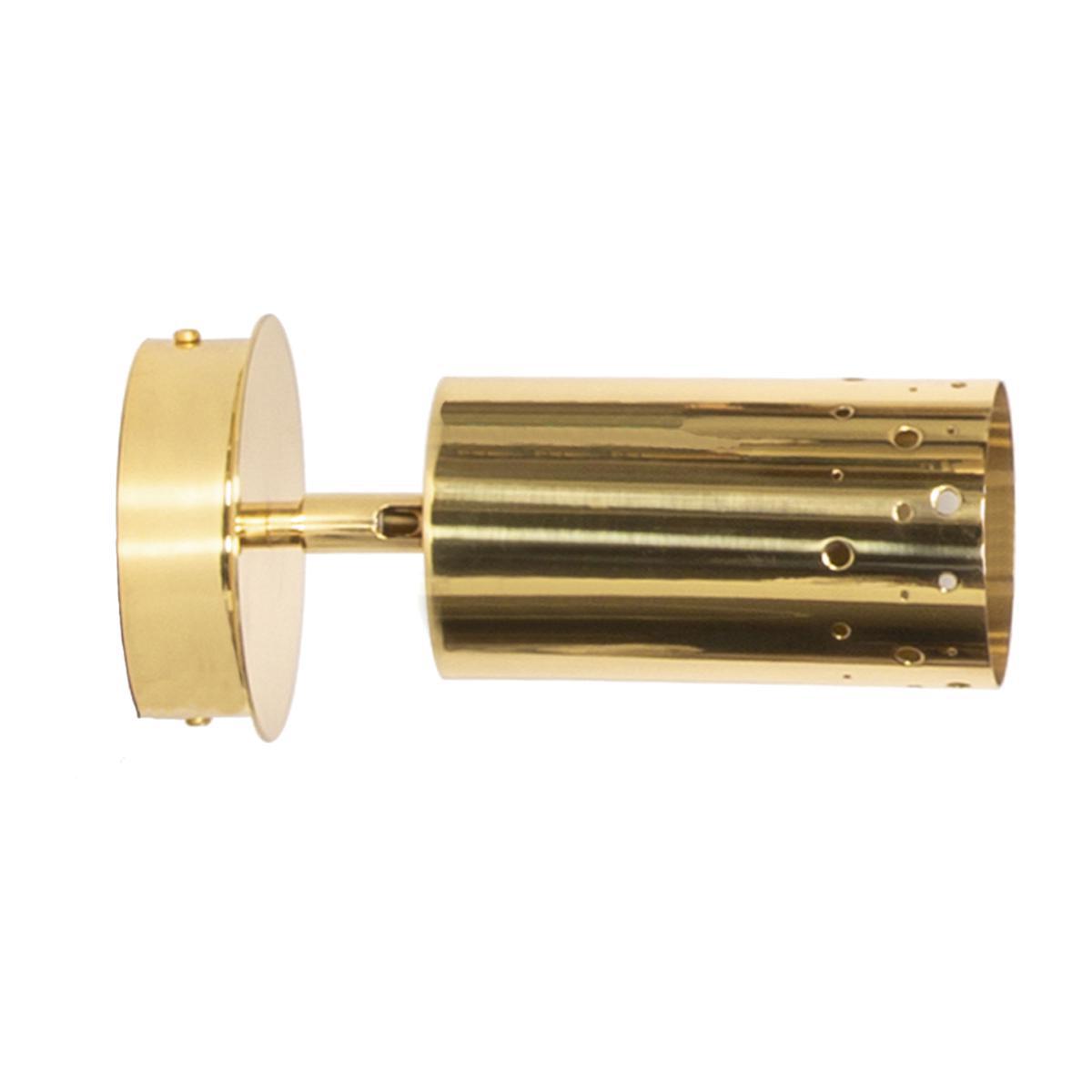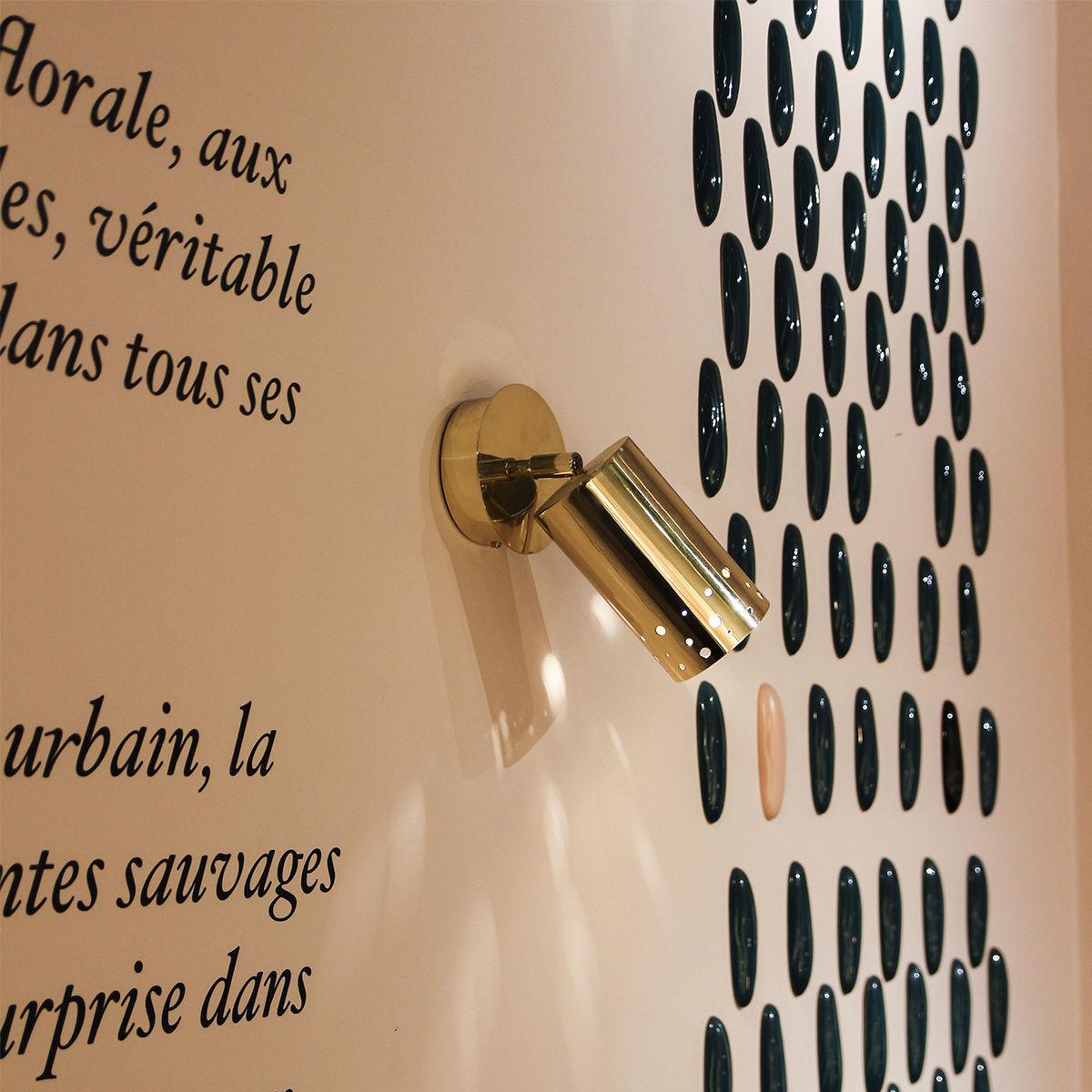 Chic and refined, Jean is a bijou lamp with a glamorous look that combines simple form and noble material. This articulated wall lamp is adjustable. It has a switch located on its base. It consists of a sleek golden brass cylinder: this metallic, shiny finish is very sophisticated. The end of the cylinder is studded with holes of different sizes that give rise to a myriad of light points. Light escapes gracefully from the multiple openings, casting poetic shadows on the wall.