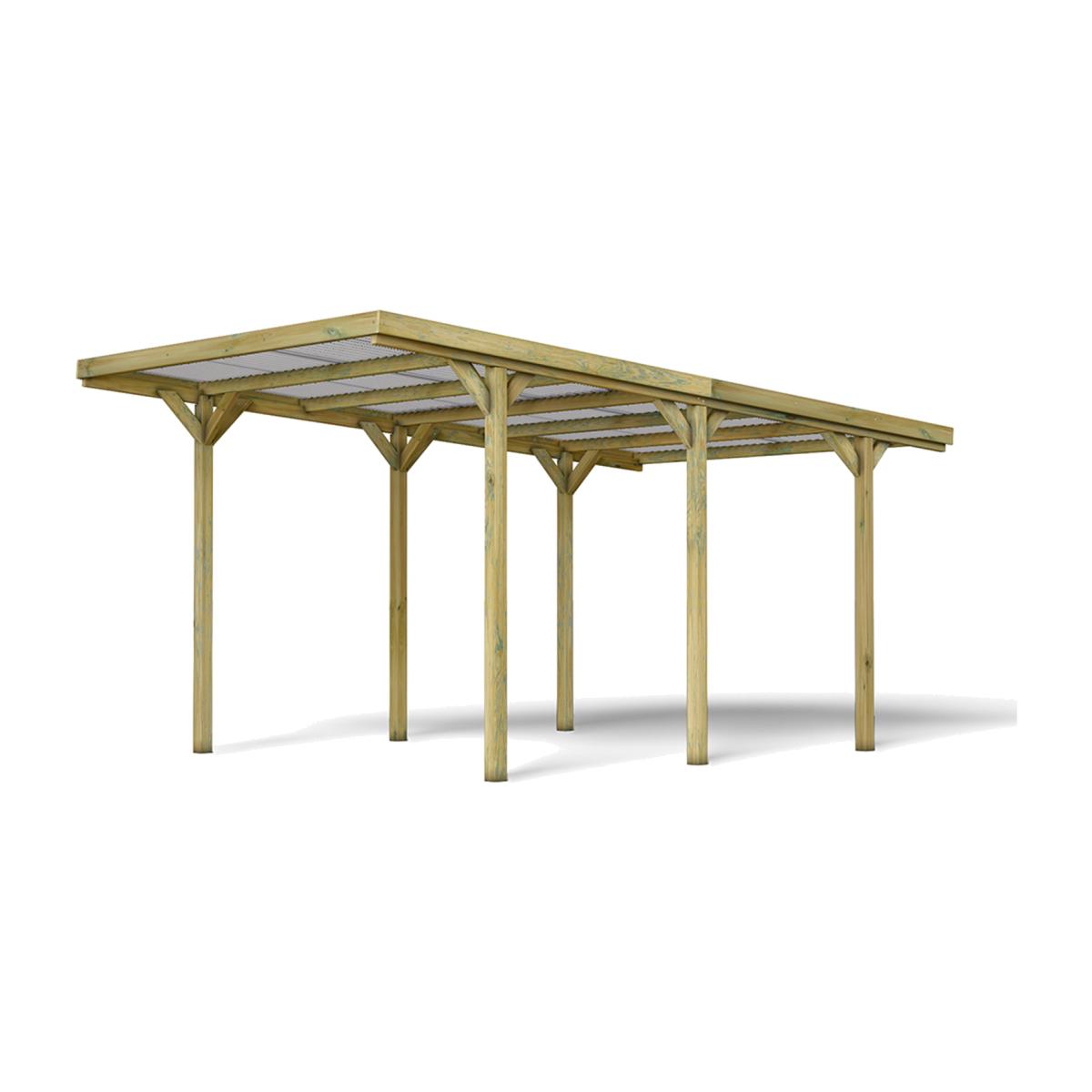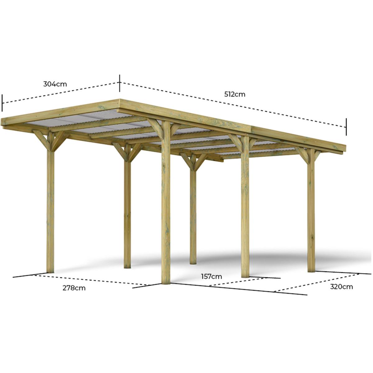 Jean Wooden Carport 3 x 5m Single slope PVC roof Robust Design Manufactured from Scots Pine Pressure Treated Easy Self Assembly No Treatment Required for at least 1 year 3 Year Guarantee Against Rot Galvanised Post Base Option Jean Wooden Carport 3 x 5m Wooden carports are an ideal way to protect your car from the elements. The Jean Wooden Carport from Cerland is a great option for those looking for modern, robust and secure protection. This 15.6m squared carport has a single-sloped roof that drains rainwater quickly, while the posts are 1.57 m apart wide enough to open car doors easily. Not only is this wooden carport practical, but it is also environmentally conscious too as all of its Scots pine elements come from certified forests and are pressure treated for protection against fungi and insects. More Information Jean Wooden Carport 3 x 5m Length 5.1m Width 3.0m Height 2.5m Post Dimensions 90mm x 90mm Post Distance 157cm Surface area 15m squared. Package Dimensions Length 300cm Width 120cm Height 29.5cm Weight 225kg