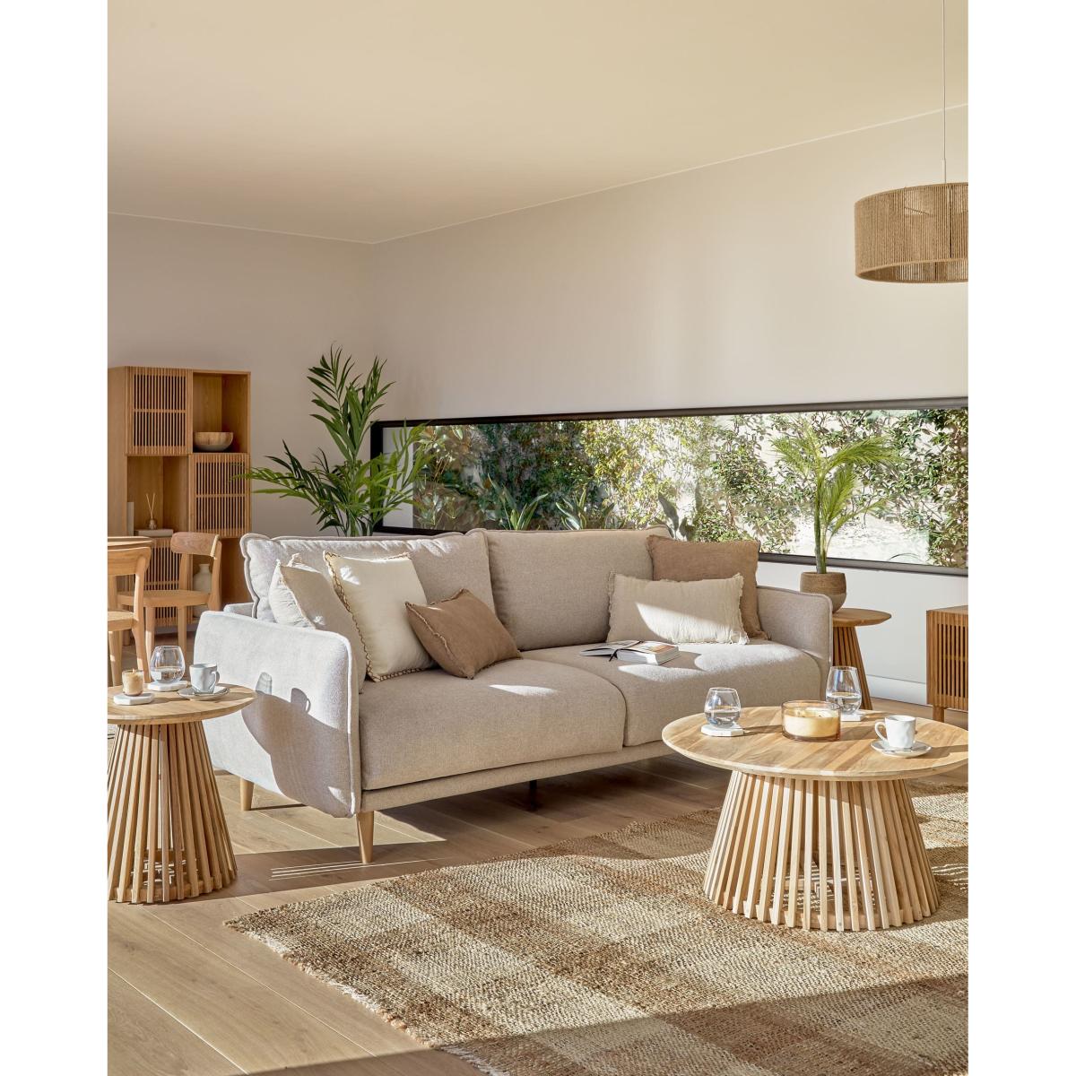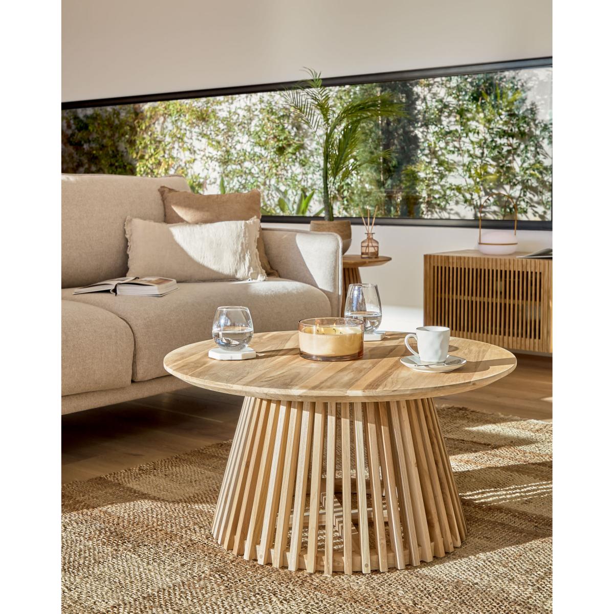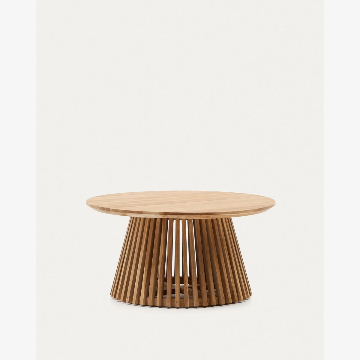 I’m a big fan of the Jeanette table for its clean lines and warm oak tone - it’s a quietly striking centrepiece that works equally well in Scandi-inspired or more contemporary living rooms. Its slatted base gives a subtle architectural feel, while the 80 cm diameter is just right for nestling with a low sofa or pairing with a petite armchair. To style it, keep the surface uncluttered: a shallow tray for remotes and a small vase of seasonal foliage feels fresh without overwhelming the round top. If you’re after a cosier vibe, layer a textured runner beneath a couple of coffee-table books and add a lightly woven basket beside it for extra throws or magazines.