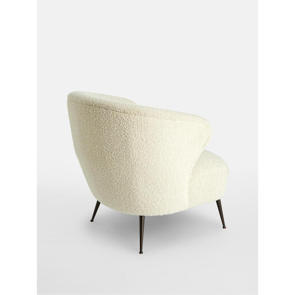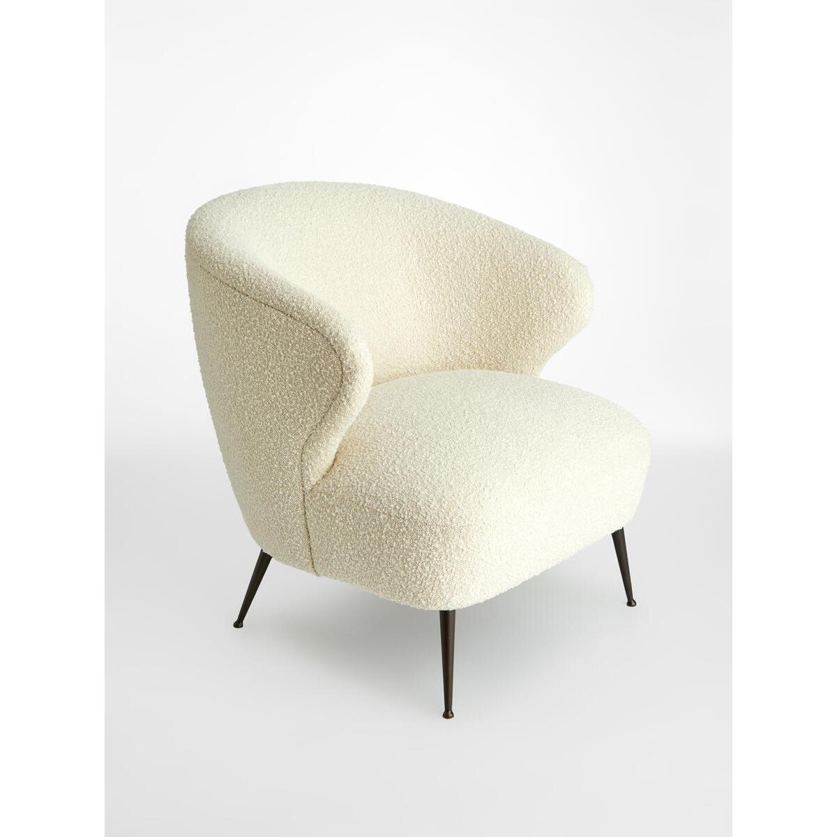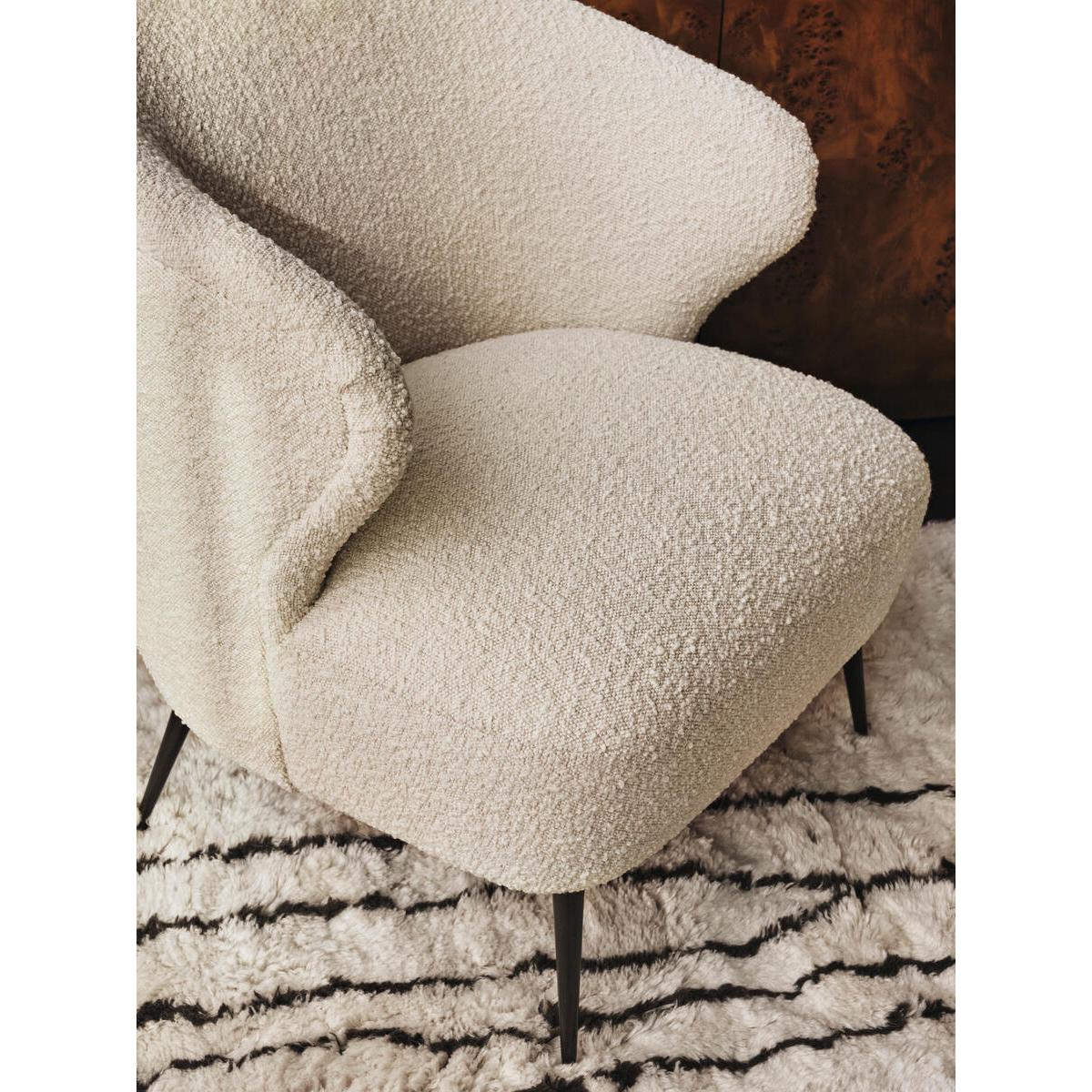 Elevate your seating spot with the Jeanne chair, built from anengineered hardwood frame with iron and blackened-brass accents. Anod to vintage styling and the soft furnishings seen throughout our. Houses, the armchair spotlights tapered metal legs and isupholstered in a cream bouclé, with a wrap-around cocoonsilhouette. Tapered metal legs. Brass accents. Upholstered back. Wrap-around silhouette.