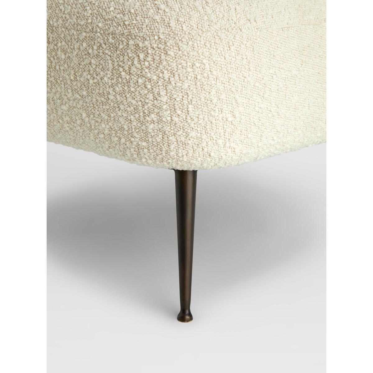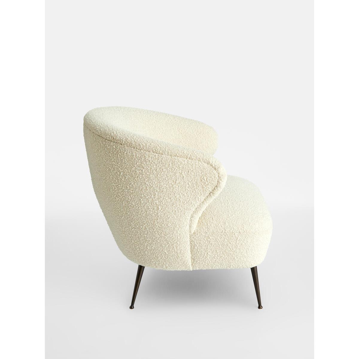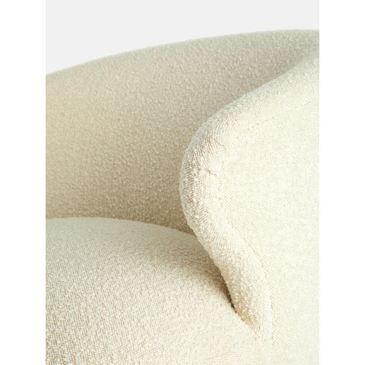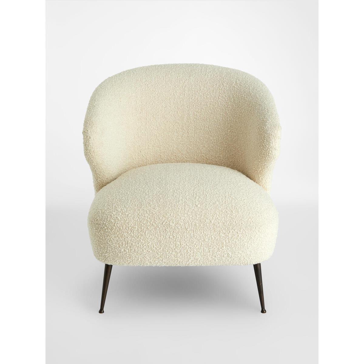 Elevate your seating spot with the Jeanne chair, built from anengineered hardwood frame with iron and blackened-brass accents. Anod to vintage styling and the soft furnishings seen throughout our. Houses, the armchair spotlights tapered metal legs and isupholstered in a cream bouclé, with a wrap-around cocoonsilhouette. Tapered metal legs. Brass accents. Upholstered back. Wrap-around silhouette.