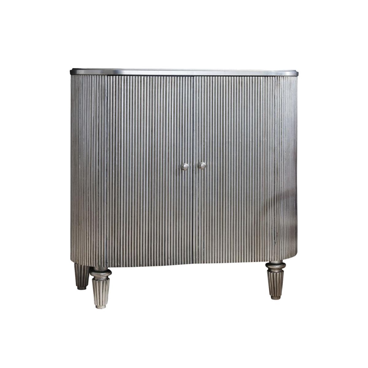 Height of suave elegance in you home, with a hint of retro. Fine reeded lines beautifully hand glided in silver leaf with contrasting black interior and mirrored back panel.