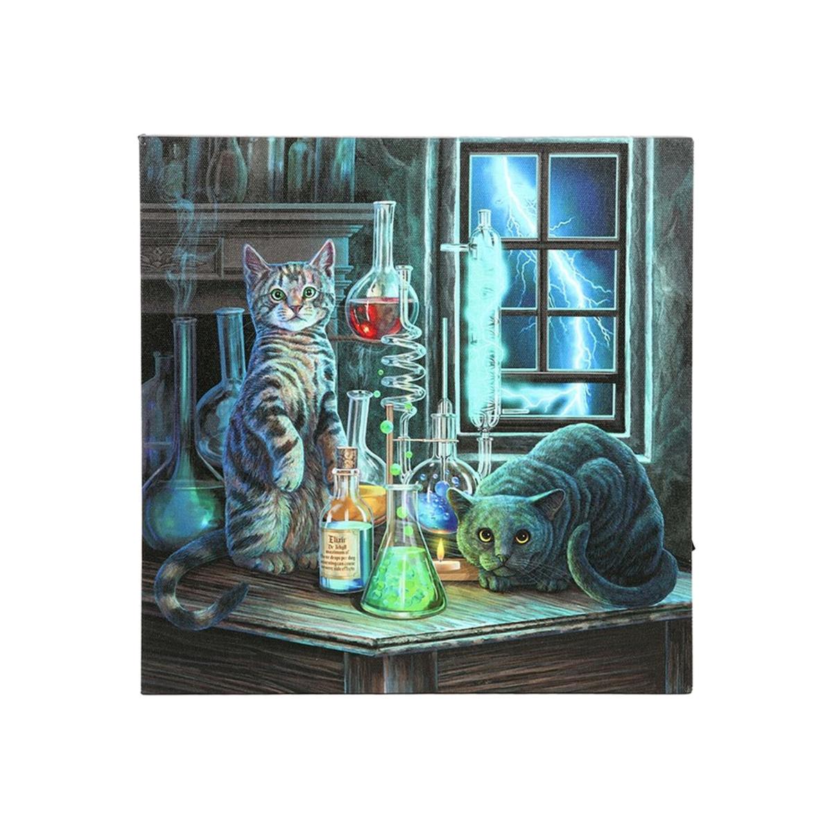 Measuring 30x30cm this square canvas features a high quality colour print of the enchanting 'Jekyll and Hyde' cat artwork by popular artist Lisa Parker. Light up details bring this magical piece to life. Requires 2 x AA batteries, not included. The switch is located on the side of the canvas and may be slightly obscured by the packaging upon delivery. Officially licensed product from Lisa Parker.