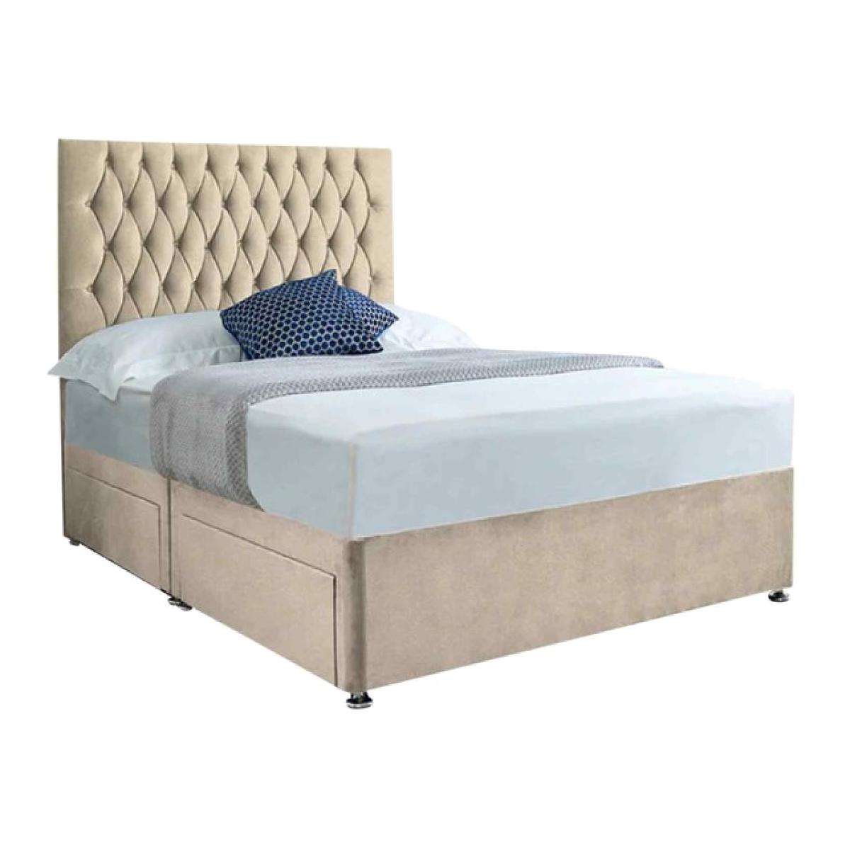 A contemporary style for any bedroom setting. This affordable yet quality divan bed comes with a 20 inch headboard, base and a memory spring mattress. This bed is available in 6 sizes and various fabrics and colours. There are storage options of having 2 drawers. The mattress is a 13.5 Open Coil Bonnell spring with a layer of responsive memory foam, hand tufted as it secures the classic mattress fillings and enhances the performance and life span. A medium to firm mattress with a depth of 10 inches this amazingly priced bed set represents great value for money.