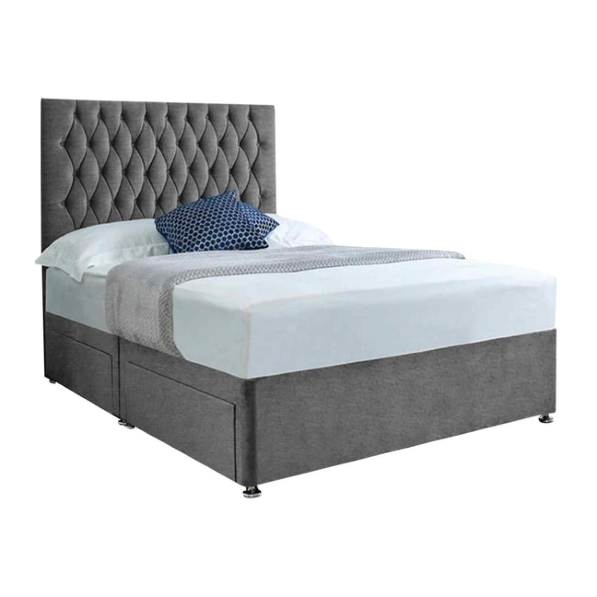 A contemporary style for any bedroom setting. This affordable yet quality divan bed comes with a 20 inch headboard, base and a memory spring mattress. This bed is available in 6 sizes and various fabrics and colours. There are storage options of having 2 drawers. The mattress is a 13.5 Open Coil Bonnell spring with a layer of responsive memory foam, hand tufted as it secures the classic mattress fillings and enhances the performance and life span. A medium to firm mattress with a depth of 10 inches this amazingly priced bed set represents great value for money.