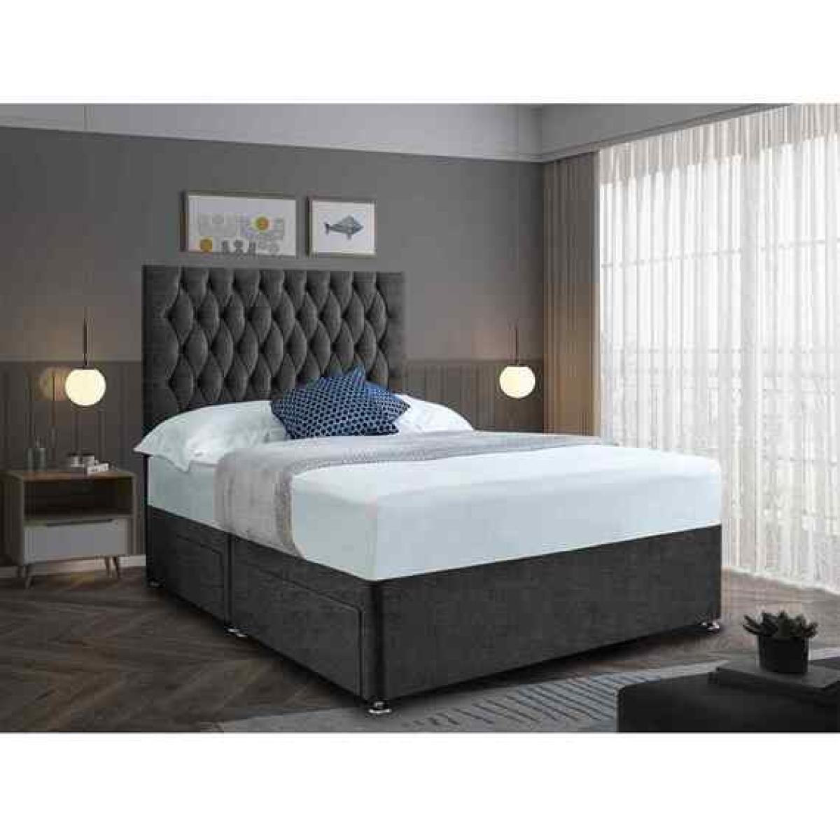 Jemma Divan Bed Set with Headboard Mattress-Chenille, 2 Drawers Right Side - Charcoal / Grey / Super King / Superking