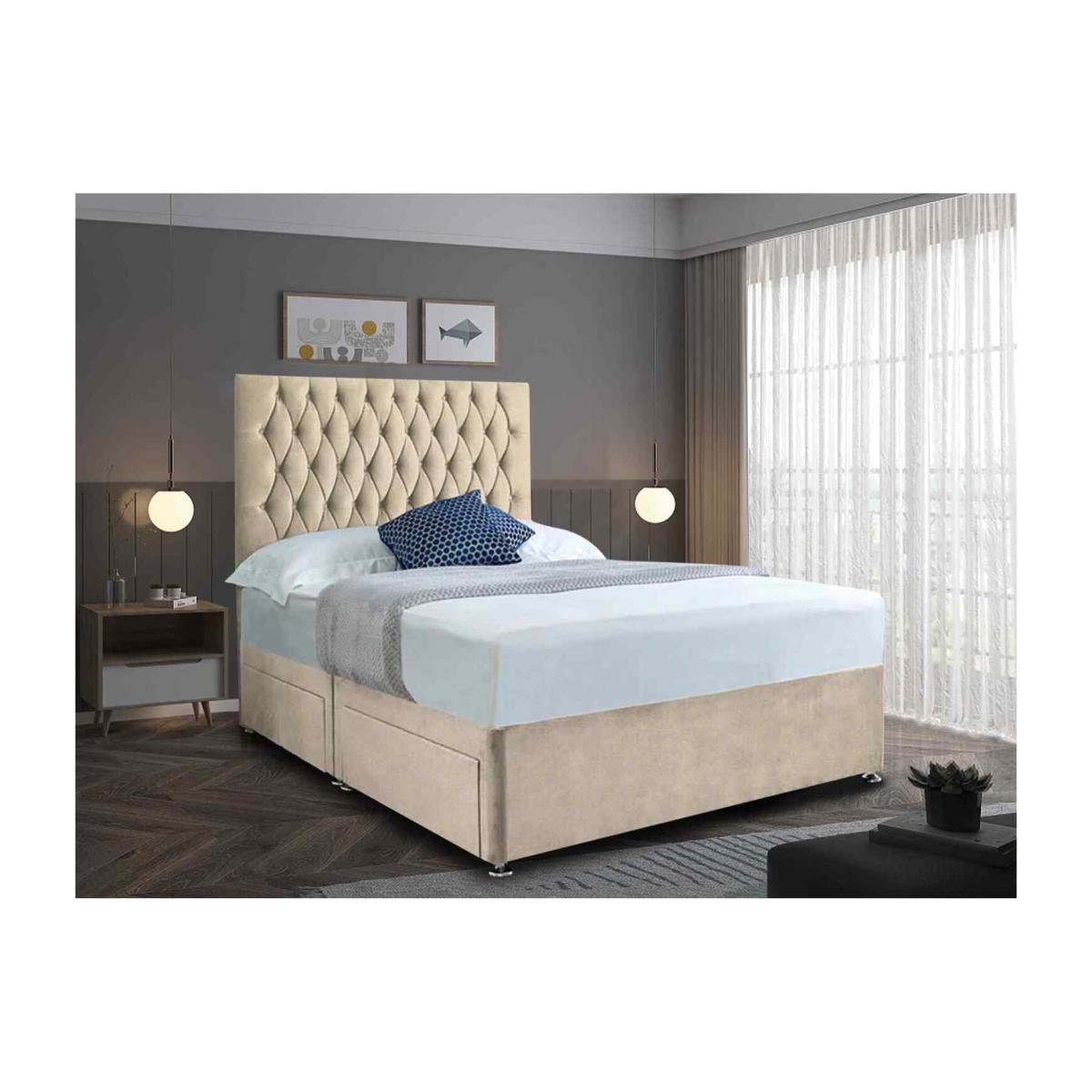 A contemporary style for any bedroom setting. This affordable yet quality divan bed comes with a 20 inch headboard, base and a memory spring mattress. This bed is available in 6 sizes and various fabrics and colours. There are storage options of having 2 drawers. The mattress is a 13.5 Open Coil Bonnell spring with a layer of responsive memory foam, hand tufted as it secures the classic mattress fillings and enhances the performance and life span. A medium to firm mattress with a depth of 10 inches this amazingly priced bed set represents great value for money.