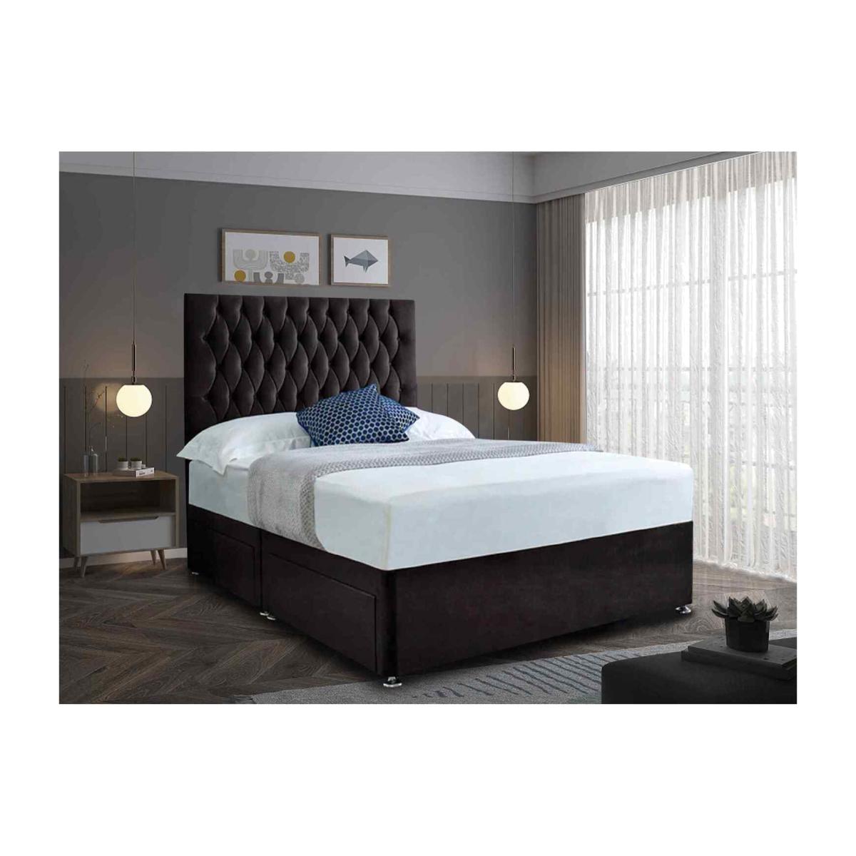A contemporary style for any bedroom setting. This affordable yet quality divan bed comes with a 20 inch headboard, base and a memory spring mattress. This bed is available in 6 sizes and various fabrics and colours. There are storage options of having 2 drawers. The mattress is a 13.5 Open Coil Bonnell spring with a layer of responsive memory foam, hand tufted as it secures the classic mattress fillings and enhances the performance and life span. A medium to firm mattress with a depth of 10 inches this amazingly priced bed set represents great value for money.