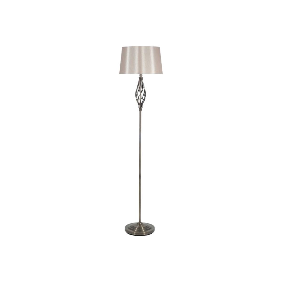 Elegant antique brass metal twist floor lamp complimneted beautifully by a tapered cylinder faux silk shade. Will sit beautifully within any room.