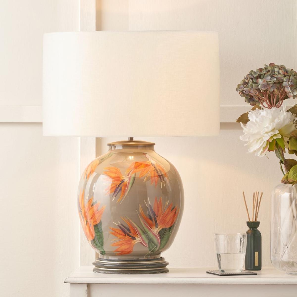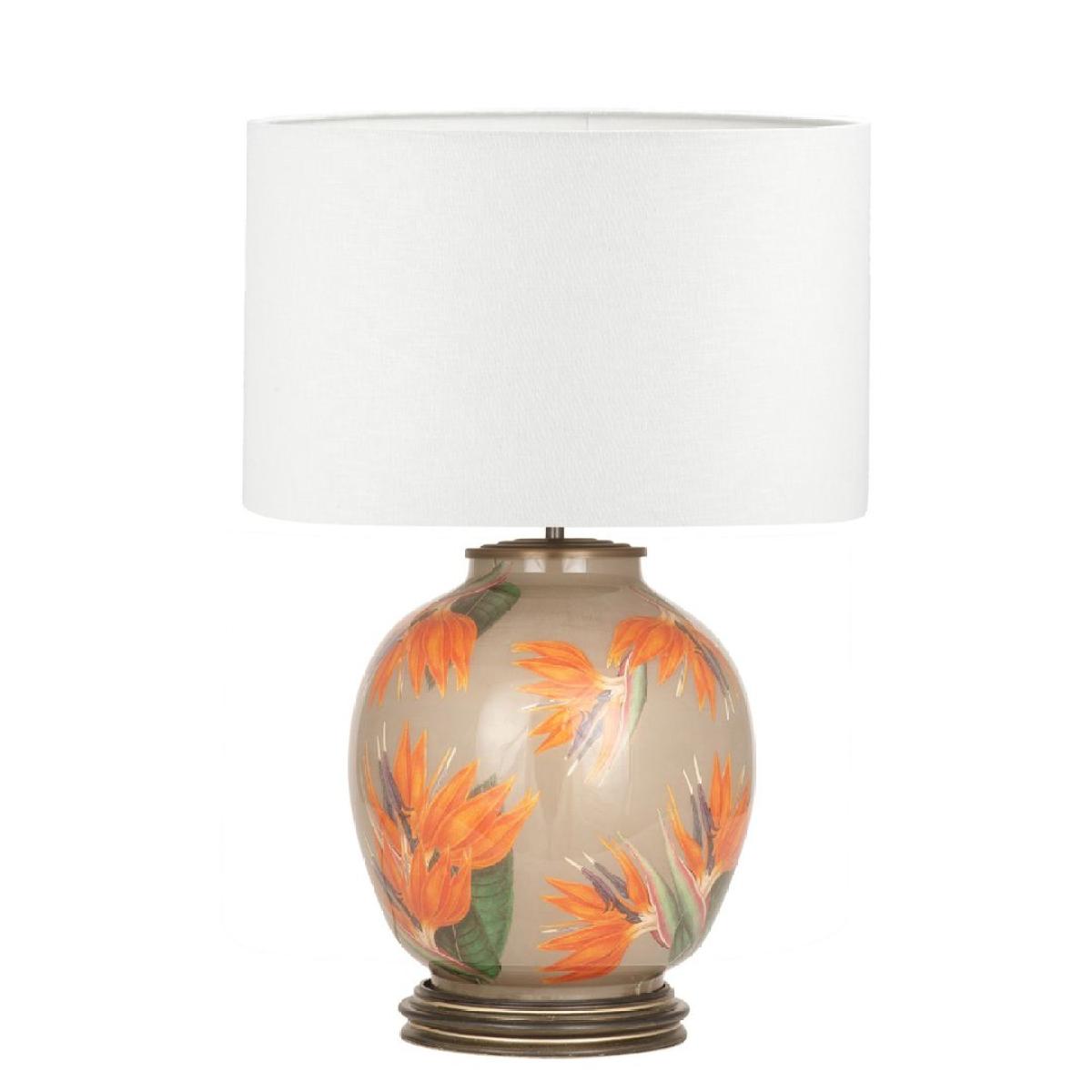 Bird of Paradise 1-light table lamp by Jenny Worrall, made from hand-blown glass, painted taupe over distressed gold and decorated with beautiful tropical-coloured birds of paradise. Paired with a white linen drum shade. A stunning work of art, crafted from hand-blown glass and designed to bring a touch of tropical elegance to your home. Decorated from the inside by skilled artisans, this table lamp features a unique base with a taupe finish over distressed gold, creating a warm, vintage look with a subtle shimmer. Adorning the base are vibrant birds of paradise in tropical colors, adding an eye-catching pop of color and natural beauty to this sophisticated piece. Topped with a classic white linen drum shade, the lamp offers a soft, diffused glow that enhances its rich detailing without overpowering your space. The combination of the lush tropical design and the timeless silhouette makes the Bird of Paradise table lamp a captivating addition to any living room, bedroom or entryway, effortlessly blending artistic charm with functional lighting. Bird of Paradise 1-light table lamp by Jenny Worrall, made from hand-blown glass, painted taupe over distressed gold and decorated with beautiful tropical-coloured birds of paradise. Paired with a white linen drum shade. A stunning work of art, crafted from hand-blown glass and designed to bring a touch of tropical elegance to your home. Decorated from the inside by skilled artisans, this table lamp features a unique base with a taupe finish over distressed gold, creating a warm, vintage look with a subtle shimmer. Adorning the base are vibrant birds of paradise in tropical colors, adding an eye-catching pop of color and natural beauty to this sophisticated piece. Topped with a classic white linen drum shade, the lamp offers a soft, diffused glow that enhances its rich detailing without overpowering your space. The combination of the lush tropical design and the timeless silhouette makes the Bird of Paradise table lamp a captivating addition to any living room, bedroom or entryway, effortlessly blending artistic charm with functional lighting.