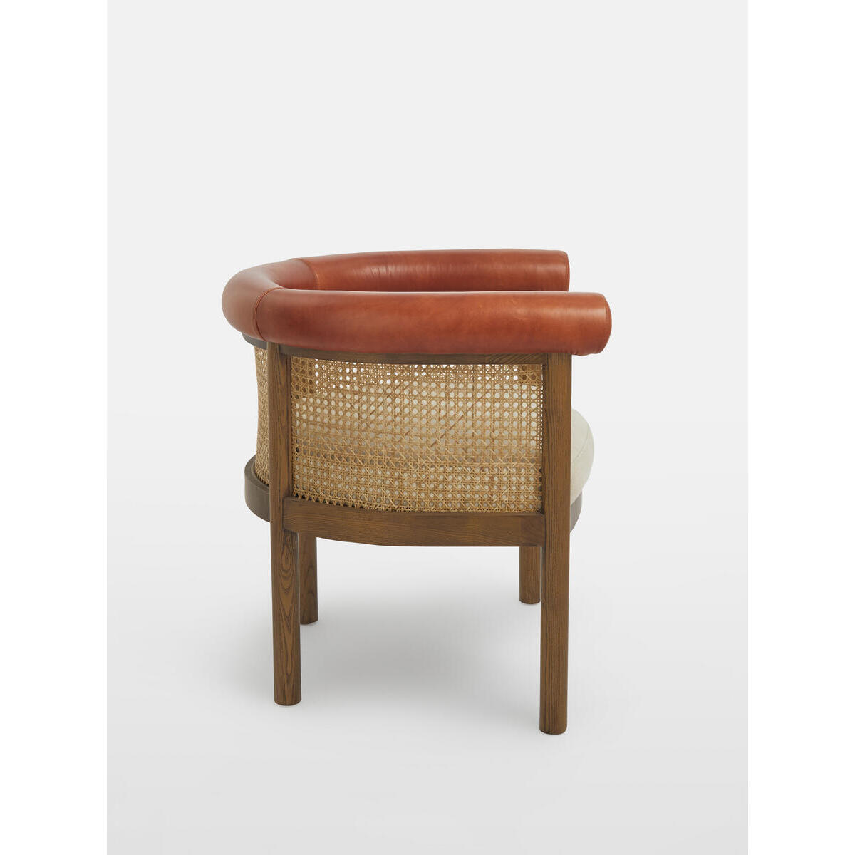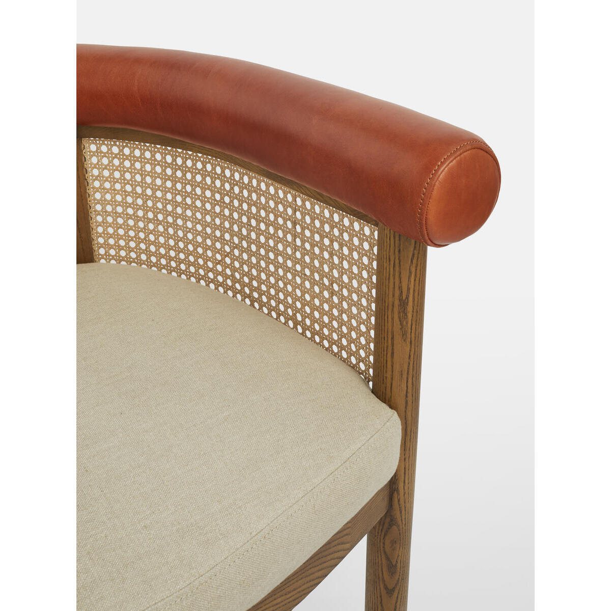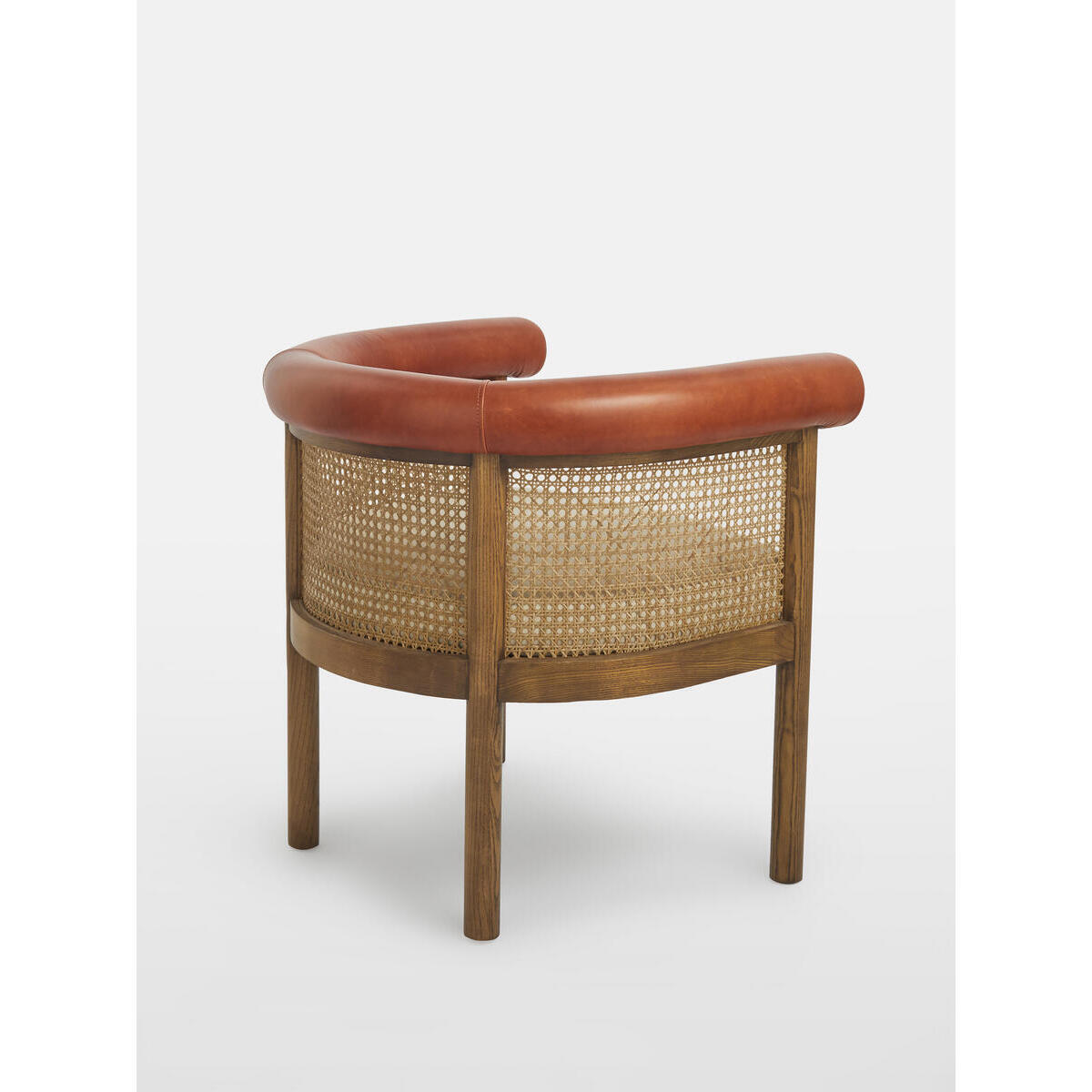 Referencing the seating in Soho House Berlin, our Jensen chairis a study in form and function. Harmonising warm tones with smoothcurves, it has a comfortable deep-sit shape with a round cane backand deep-brown leather arms. Cane back. Curved back. Seat cushion. Leather arms. Inspired by Soho House Berlin.