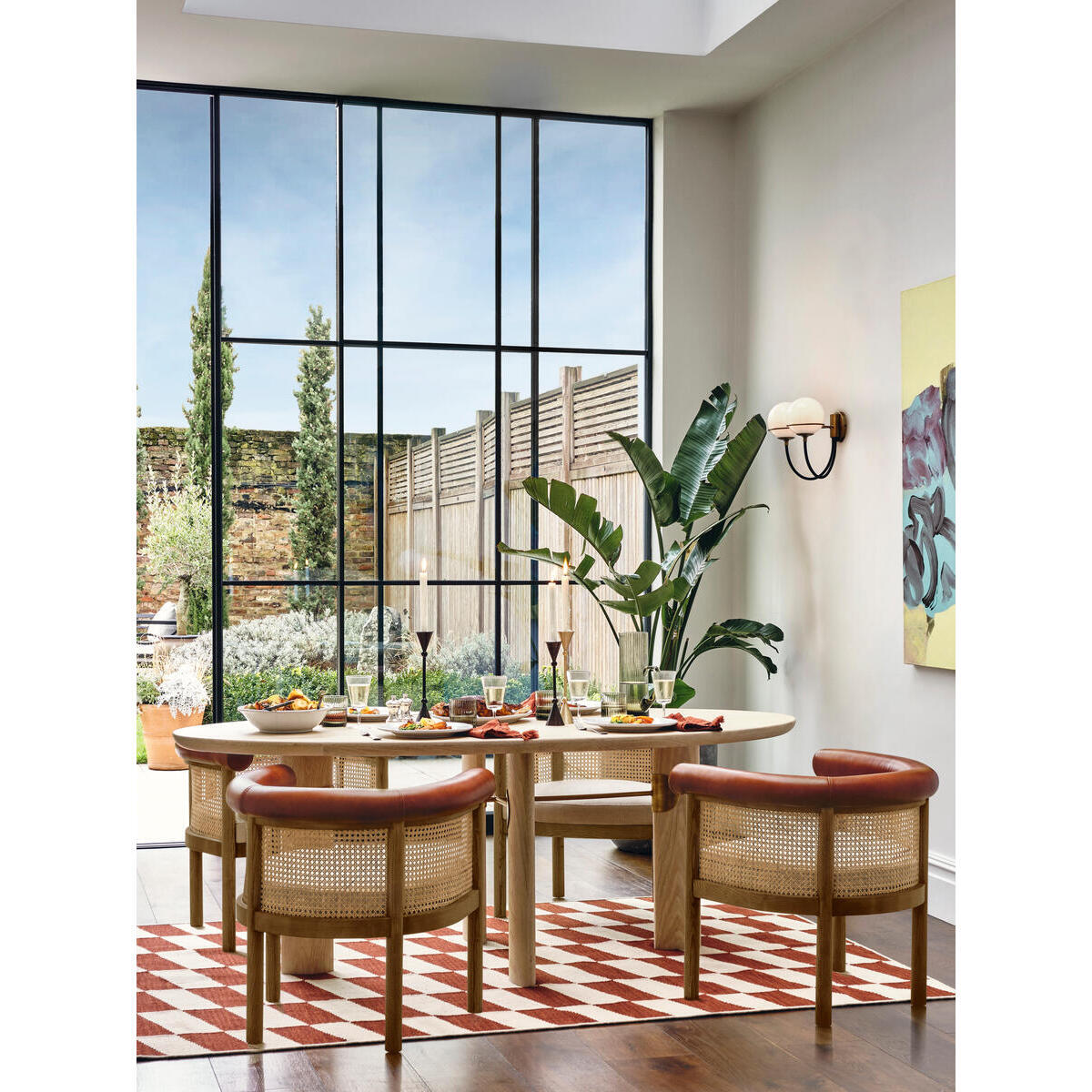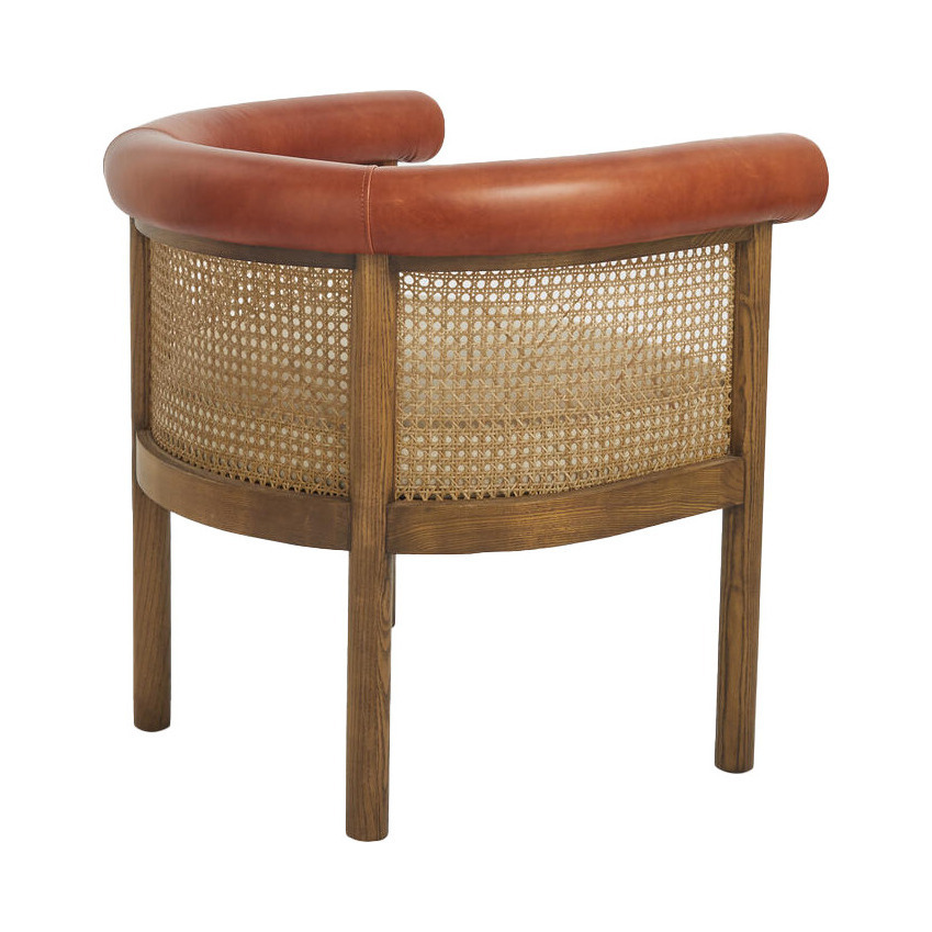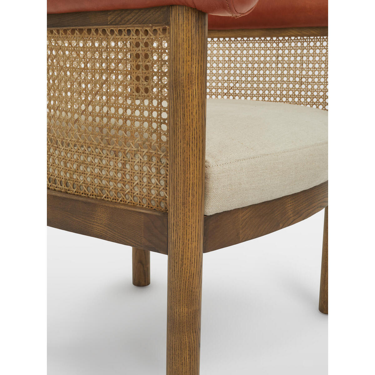 Referencing the seating in Soho House Berlin, our Jensen chairis a study in form and function. Harmonising warm tones with smoothcurves, it has a comfortable deep-sit shape with a round cane backand deep-brown leather arms. Cane back. Curved back. Seat cushion. Leather arms. Inspired by Soho House Berlin.