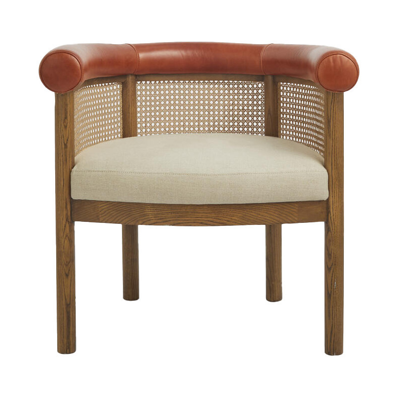 I love this chair for its versatile mix of textures and relaxed elegance. The washed linen bisque upholstery gives it a soft, neutral tone that works well in both contemporary and classic interiors, while the unique rolled leather arms add a touch of sophistication. It’s a great piece for creating a cosy dining area or even a lounge corner, thanks to its inviting shape and warm materials. Styling tips include pairing it with natural wood or rattan dining tables, adding textured tableware, and complementing it with soft neutral or earthy tones for a cohesive look. It’s particularly effective in spaces that aim for a blend of comfort and style, making it a great choice if you want your dining area to feel welcoming yet refined.